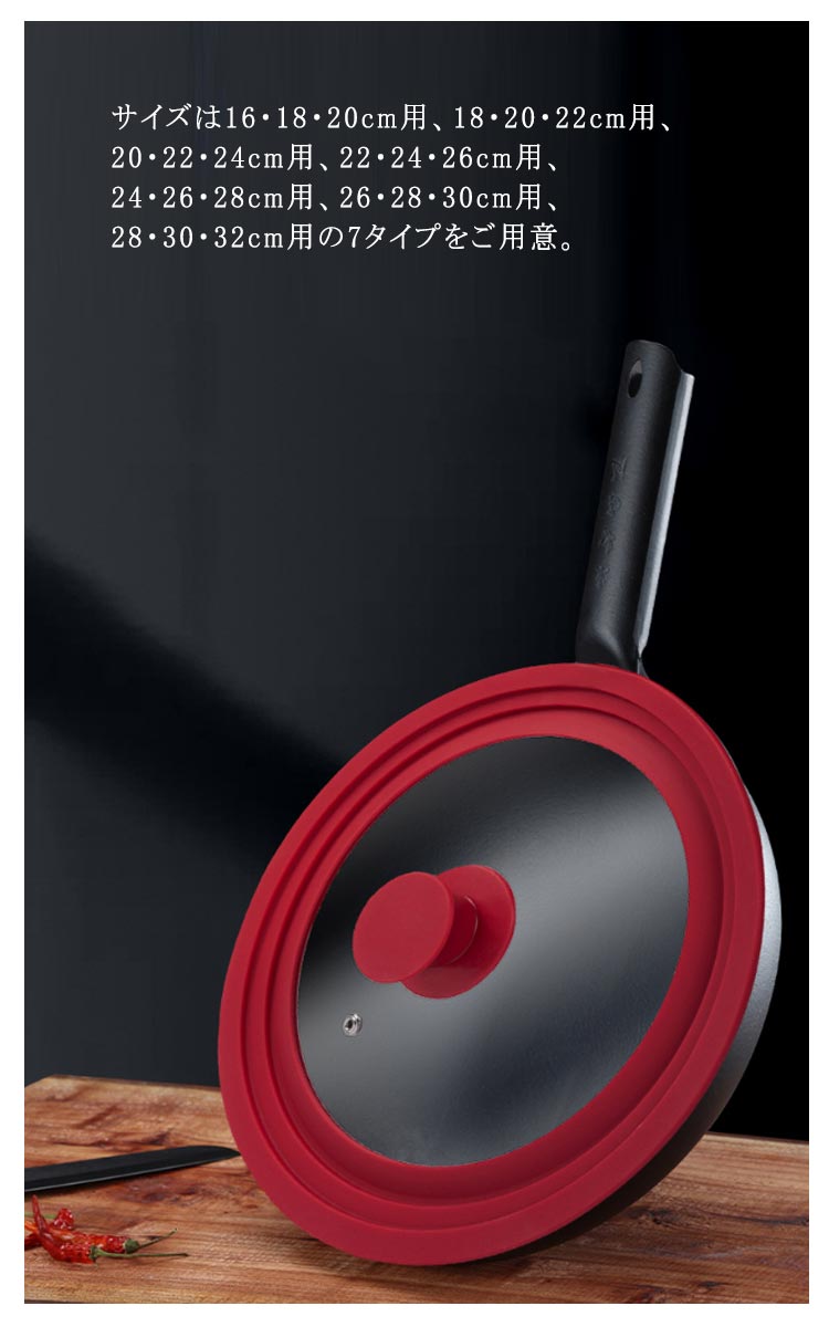 鍋やフライパンの帽子のようにご家庭の調理器具と合わせて使えるガラス蓋です。サイズは16・18・20cm用、18・20・22cm用、20・22・24cm用、22・24・26cm用、24・26・28cm用、26・28・30cm用、28・30・32cm用の7タイプをご用意。ガラス製なので、調理中も中の様子が見られて便利。シリコーン製のつまみは滑りにくく、持ちやすい。つまみの頭が平らな形状なので、裏返して置いても安定します。フチもシリコーン製なので、調理中に水滴が垂れにくいので、ストレスフリー。