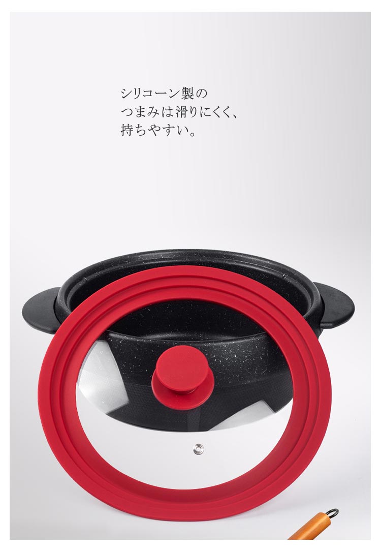 | 鍋やフライパンの帽子のようにご家庭の調理器具と合わせて使えるガラス蓋です。 サイズは16?18?20cm用、18?20?22cm用、20?22?24cm用、22?24?26cm用、24?26?28cm用、26?28?30cm用、28?30?32cm用の7タイプをご用意。 ガラス製なので、調理中も中の様子が見られて便利。 シリコーン製のつまみは滑りにくく、持ちやすい。 つまみの頭が平らな形状なので、裏返して置いても安定します。 フチもシリコーン製なので、調理中に水滴が垂れにくいので、ストレスフリー。 | |