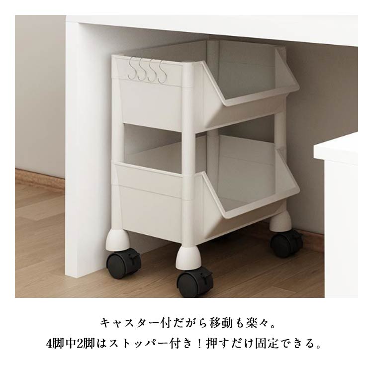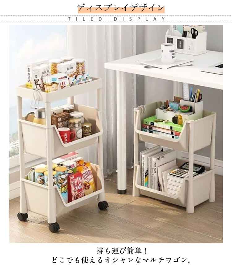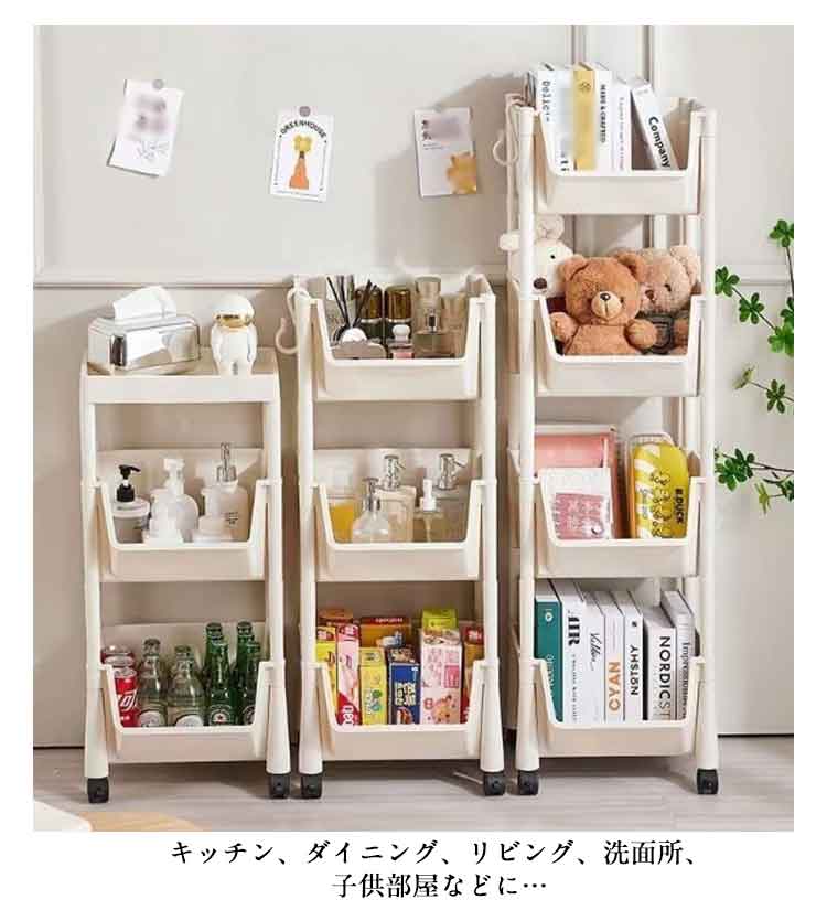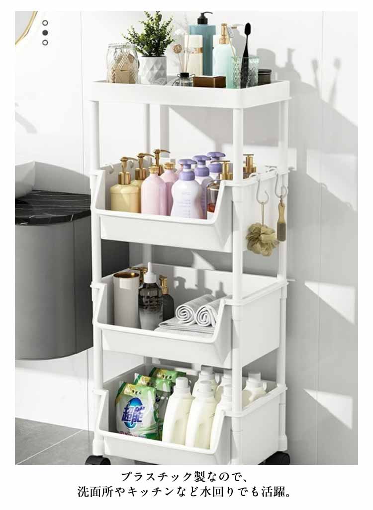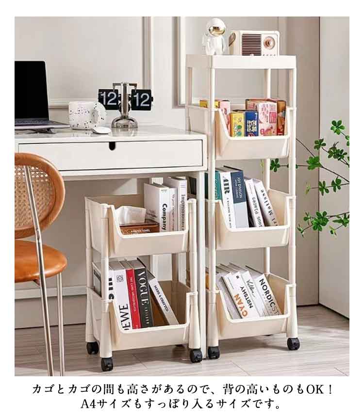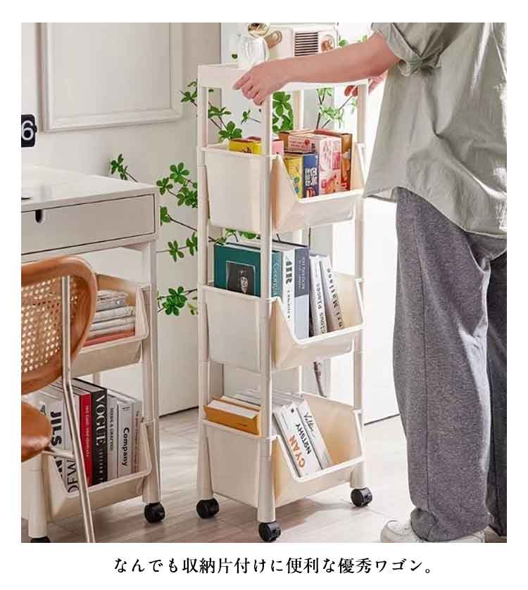 【5段収納ワゴン】【組立簡単・軽量】【キャスター付き】持ち運び簡単!どこでも使えるオシャレなマルチワゴン。プラスチック製なので、洗面所やキッチンなど水回りでも活躍。キャスター付だがら移動も楽々。深さのあるカゴタイプの収納と物が置ける天板で、収納の幅が広がる!カゴとカゴの間も高さがあるので、背の高いものもOK!A4サイズもすっぽり入るサイズです。キッチン、ダイニング、リビング、洗面所、子供部屋などに…なんでも収納片付けに便利な優秀ワゴン。4脚中2脚はストッパー付き!押すだけ固定できる。
