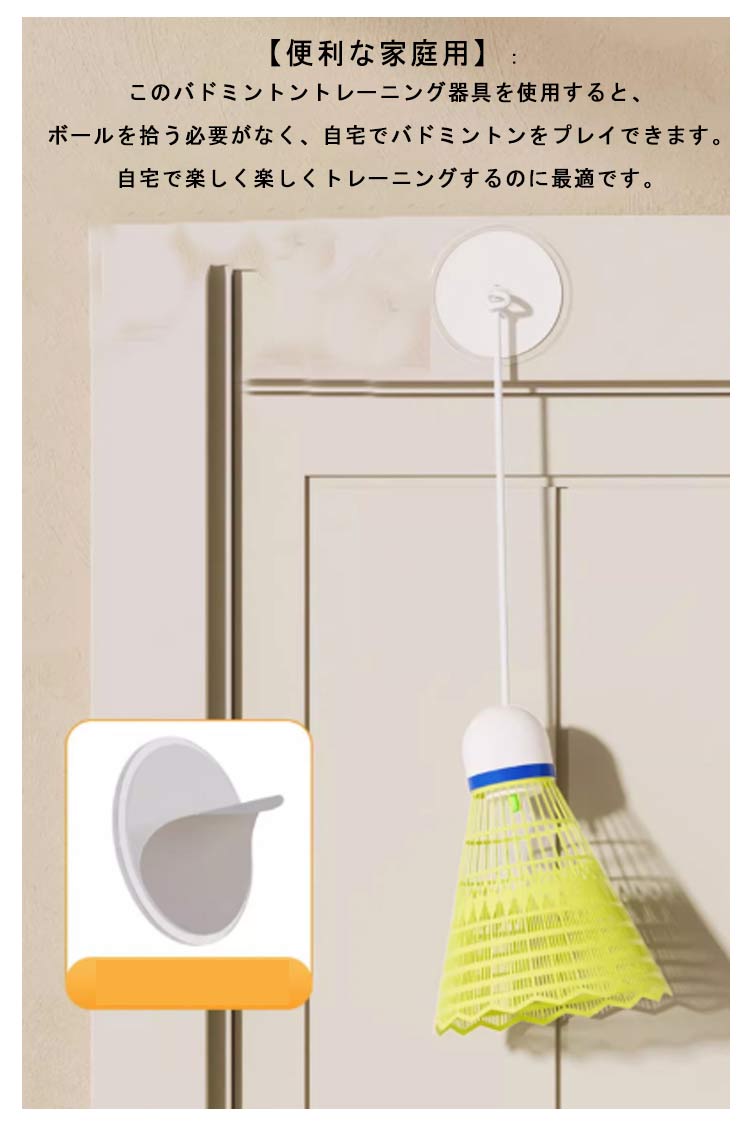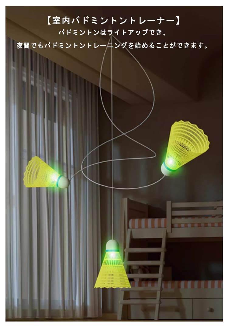 【室内バドミントントレーナー】バドミントンはライトアップでき、夜間でもバドミントントレーニングを始めることができます。【40本の弾性ロープ】ラテックス弾性ロープ、自由にカットできます。【便利な家庭用】:このバドミントントレーニング器具を使用すると、ボールを拾う必要がなく、自宅でバドミントンをプレイできます。自宅で楽しく楽しくトレーニングするのに最適です。【耐久性のある素材】: ナイロン製のこのバドミントントレーナーは、プレイに耐えるように設計されています。傷つきにくくパワーも強いのでパワーや技術の向上に最適です。【取り付け簡単】: バドミントン自己練習トレーナーには跡のないステッカーが付属しており、簡単に取り付けられます。壁を傷つけずにしっかりと押すだけです。どこにでも設置できるので多用途に使えて便利です。