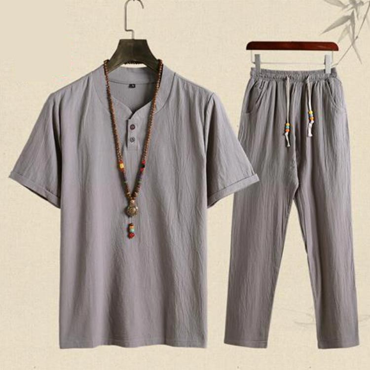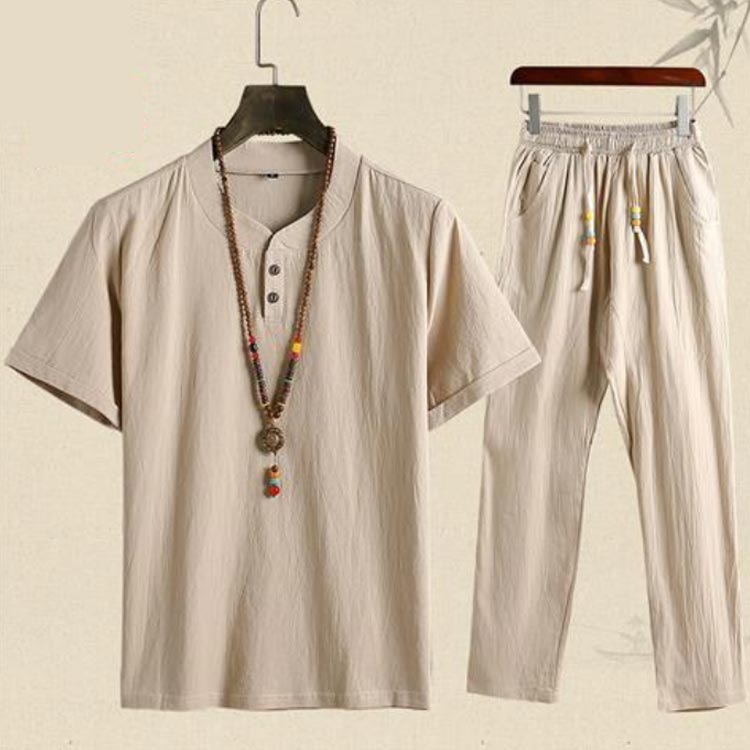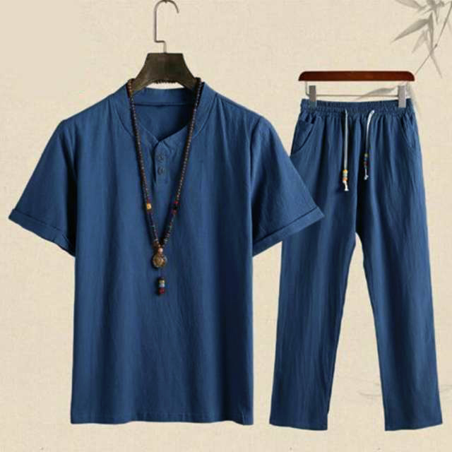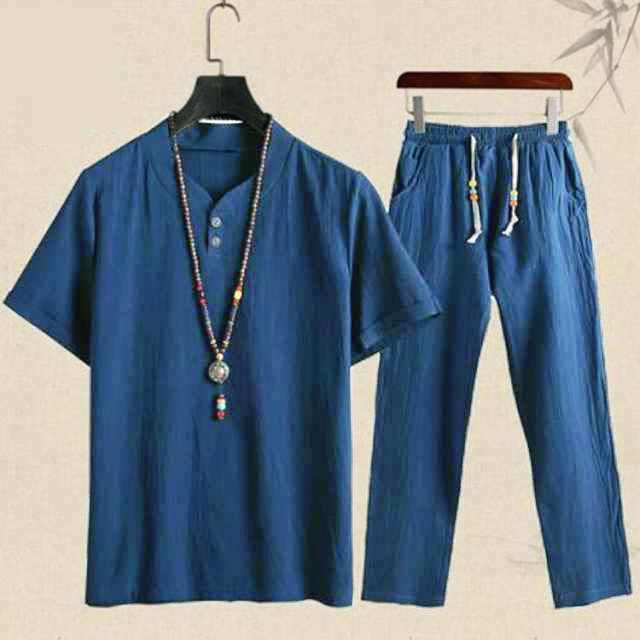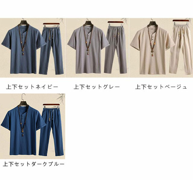 2点セット 甚平 メンズ パジャマ 半袖 ロングパンツ 長ズボン 綿麻 リネン コットン 無地 シンプル 大きいサイズ 男性 夏用 甚平セット じんべい 綿 祭り プレゼント 無地 へンリーネック風
