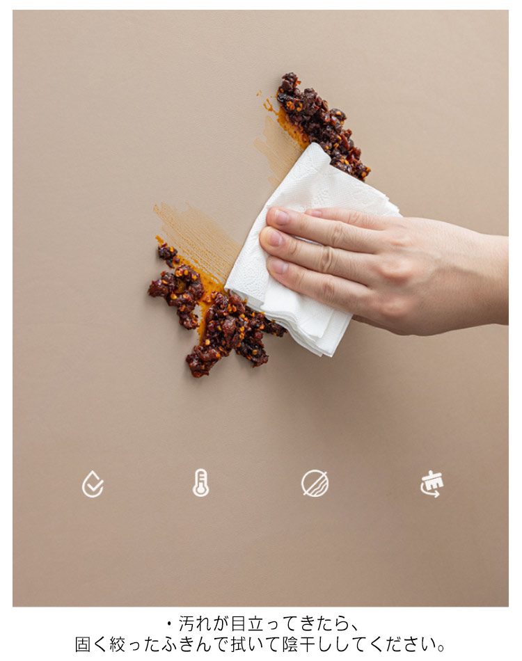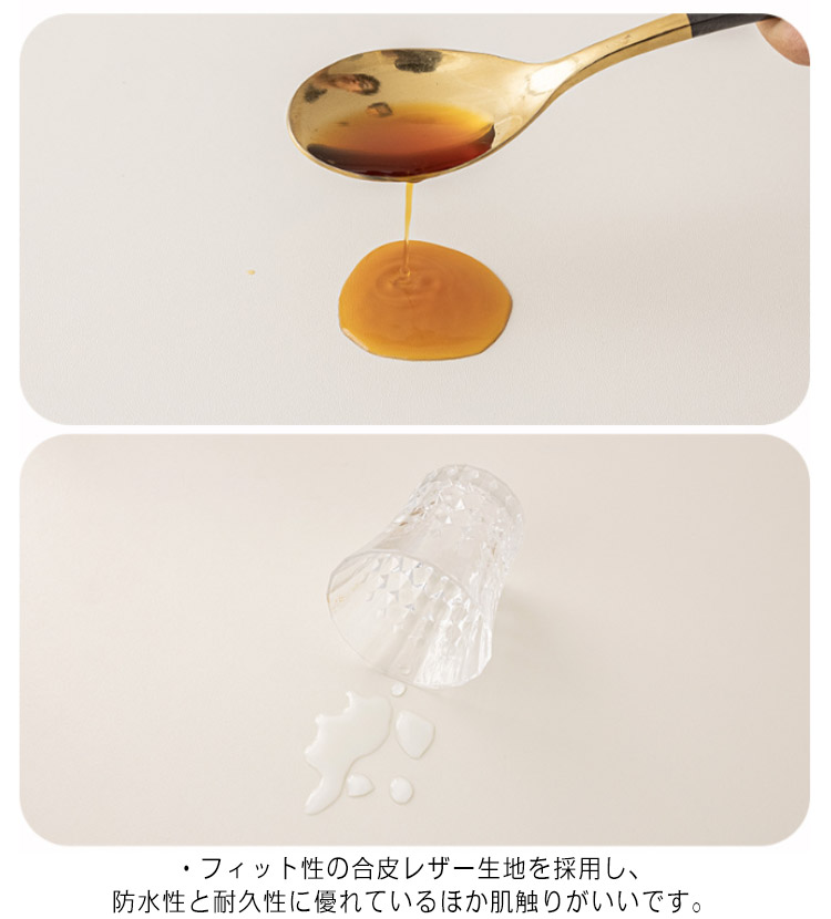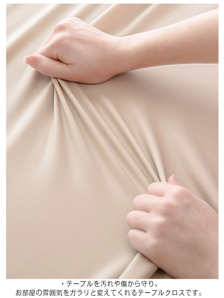 | ?柔らかい生地感と肌触りで使いやすいテーブルクロス。 ?テーブルを汚れや傷から守り、お部屋の雰囲気をガラリと変えてくれるテーブルクロスです。 ?フィット性の合皮レザー生地を採用し、防水性と耐久性に優れているほか肌触りがいいです。 ?全周ゴム仕様で、もたつきが少なくキレイにフィット。 ?ズレにくく着脱も簡単です。 ?PUレザーは、水をはじく素材です。普段のお手入れはサッとひと拭き。 ?汚れが目立ってきたら、固く絞ったふきんで拭いて陰干ししてください。 | |
