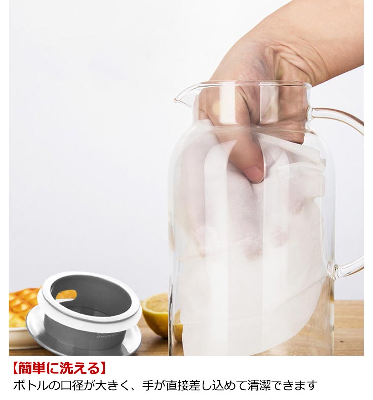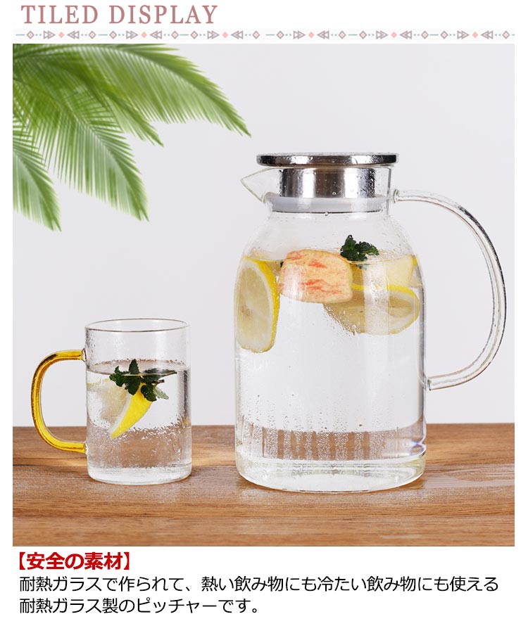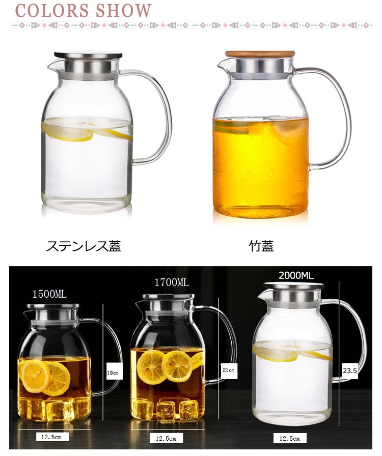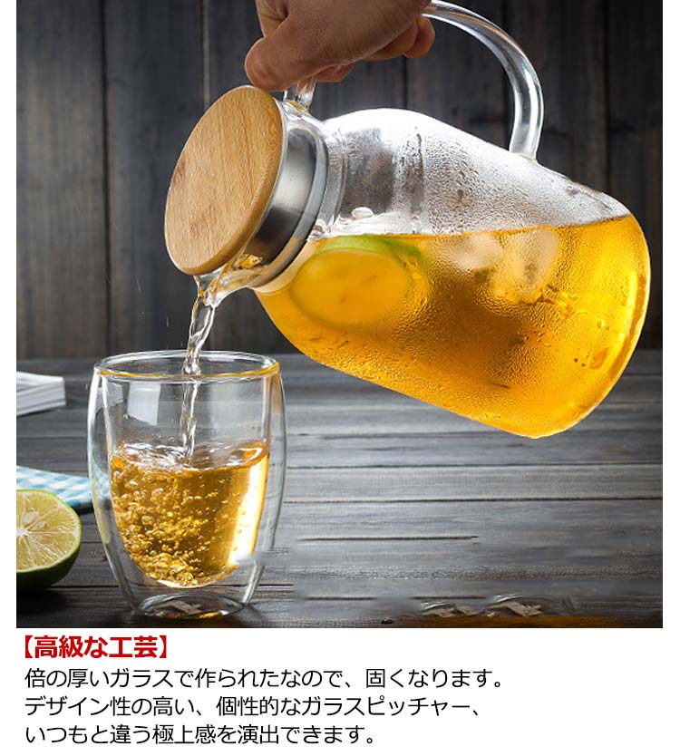 【1500ml・1700ml・2000ml】【直火対応】【安全の素材】耐熱ガラスで作られて、熱い飲み物にも冷たい飲み物にも使える耐熱ガラス製のピッチャーです。【簡単に洗える】ボトルの口径が大きく、手が直接差し込めて清潔できます【通年使用】夏は冷たいフレッシュジュースや麦茶、アイスティーなど冷たい飲み物を手軽に作れてキープできるクールサーバーです。冬には暖かいお茶など1年を通してお使いいただけます。【直火対応】耐熱のホウケイ酸ガラスで作られて、直火可能なガラスポットです【高級な工芸】倍の厚いガラスで作られたなので、固くなります。デザイン性の高い、個性的なガラスピッチャー、いつもと違う極上感を演出できます。※IHで使用できません。