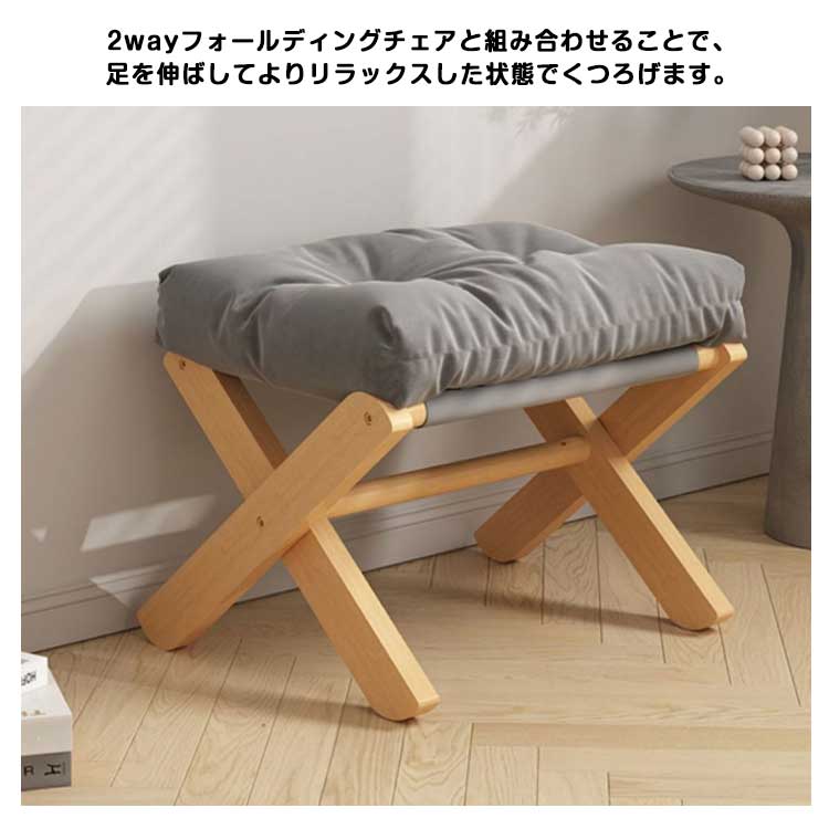ふわふわ極厚クッションで贅沢な座り心地の折りたたみ式の2WAYフットスツール。2wayフォールディングチェアと組み合わせることで、足を伸ばしてよりリラックスした状態でくつろげます。クッションは取り外し可能で、座布団(フローリングチェア)としても使用可能。スツールとしても使用することもできるため、インドア、アウトドアあらゆるシーンで大活躍します。折りたたみ式なので、持ち歩くのに便利なのはもちろんちょっとしたスペースに収納できるのが嬉しい。通気性と耐久性に優れた布生地を使用しているため、季節を問わずお使いいただけます。