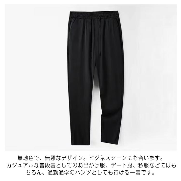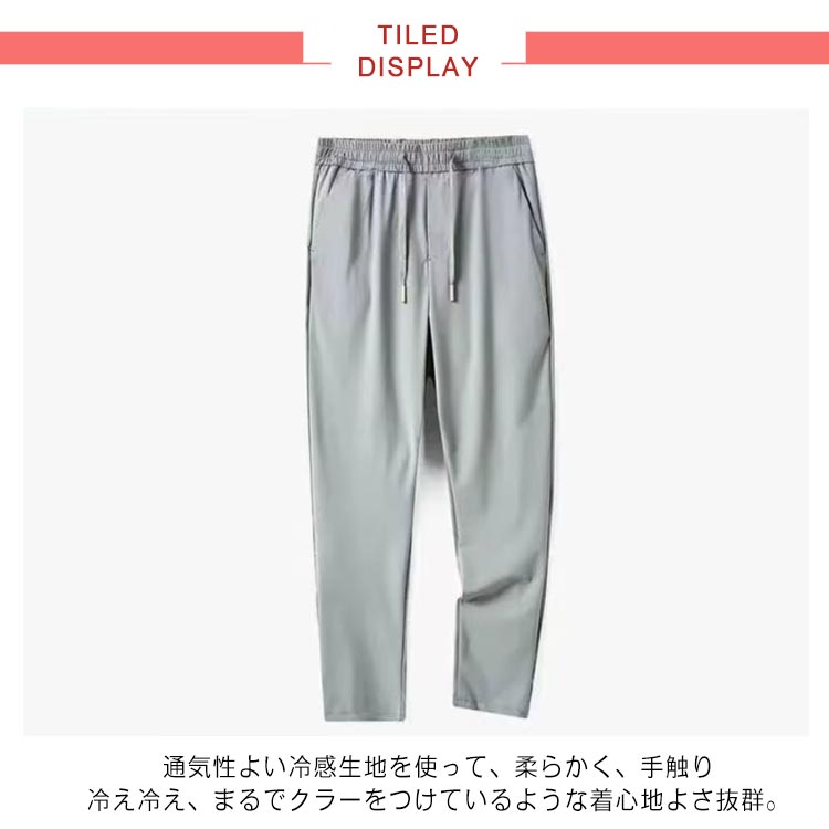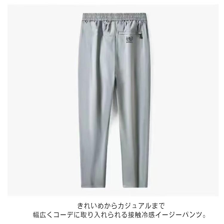 通気性よい冷感生地を使って、柔らかく、手触り冷え冷え、まるでクラーをつけているような着心地よさ抜群。きれいめからカジュアルまで幅広くコーデに取り入れられる接触冷感イージーパンツ。無地色で、無難なデザイン。ビジネスシーンにも合います。カジュアルな普段着としてのお出かけ服、デート服、私服などにはもちろん、通勤通学のパンツとしても行ける一着です。体型に合わせてサイズを調整できるので快適に穿くことができます、きれいなシルエットに魅せられます。