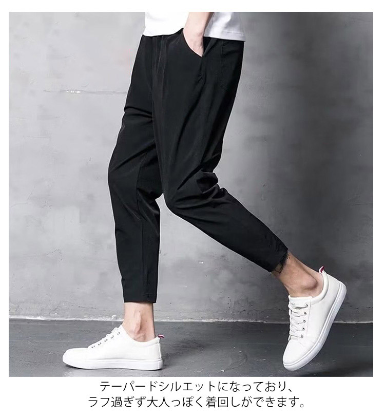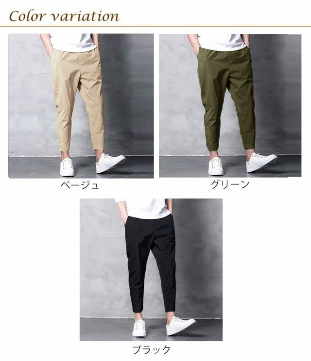 このテーパードパンツは薄手の素材を使用し、蒸れ感がなく、破りにくい特性を持ちます。ウエストにはゴムひもが内置され、着脱しやすいデザインです。型崩れしにくい抜群の生地感と優れたストレッチ性を持つ、優れた形態安定性により、シルエットが変わらず長く愛用することができるチノパンツです。父の日などにプレゼントとしても最適なテーパードパンツ。どんなに洗っても色褪せない上に、通気性も高く、吸水速乾を持ち、常に体をドライな状態に保ち、快適な穿き心地とお手入れしやすい特性を実現したスキニーパンツです。スキニーパンツは、ロングシーズン着回せるアイテムです。ビジネスにもカジュアルにもキレイめなルックスにも対応でき、幅広くコーデに取り入れられるロングパンツです。年間を通して着用頂ける新感覚のテーパードパンツです。