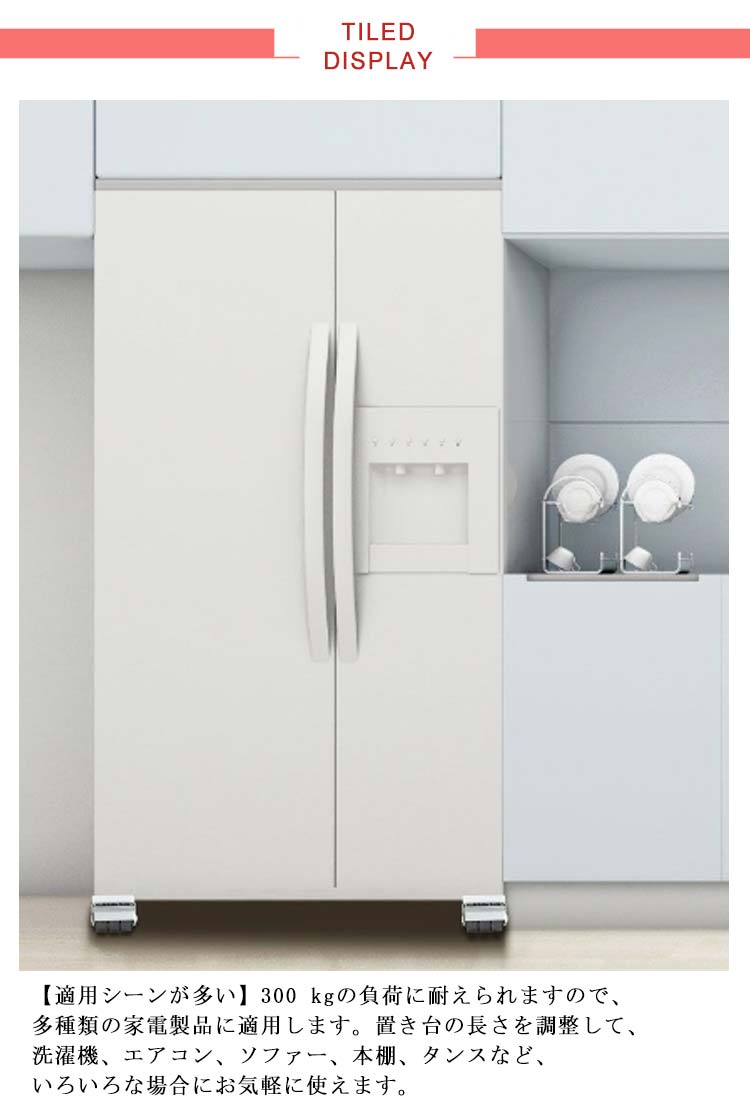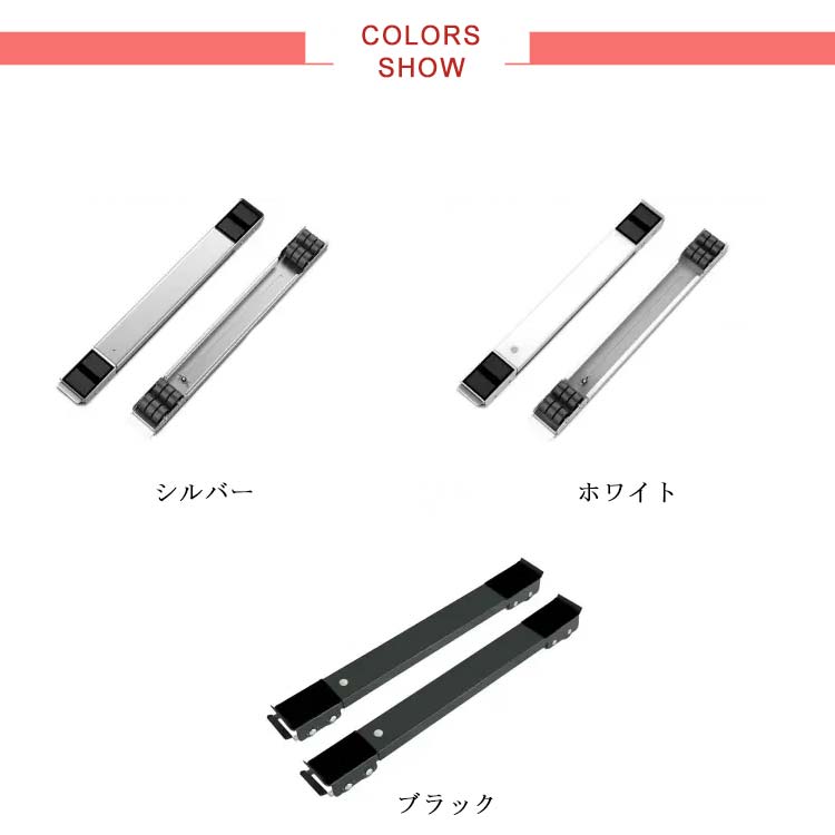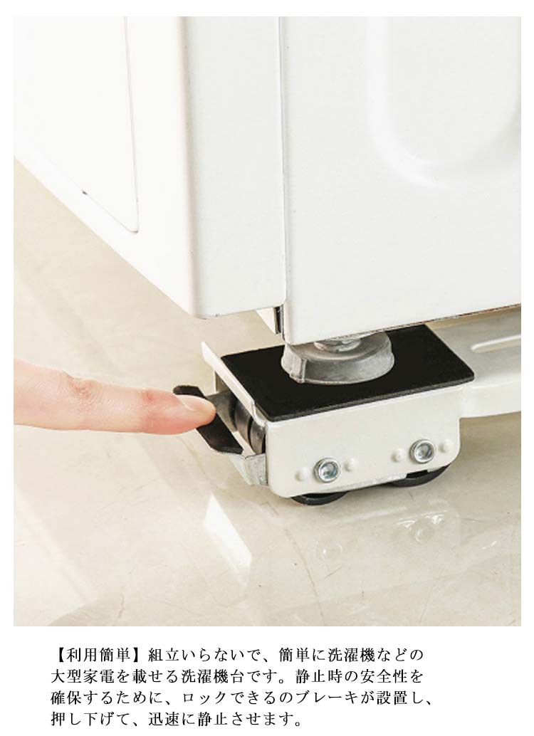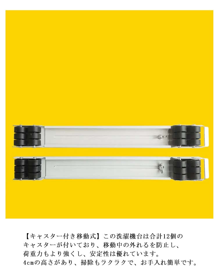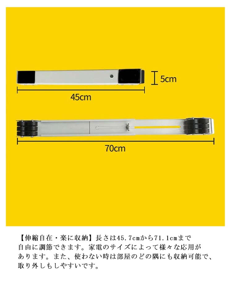【利用簡単】組立いらないで、簡単に洗濯機などの大型家電を載せる洗濯機台です。静止時の安全性を確保するために、ロックできるのブレーキが設置し、押し下げて、迅速に静止させます。【伸縮自在・楽に収納】長さは45.7cmから71.1cmまで自由に調節できます。家電のサイズによって様々な応用があります。また、使わない時は部屋のどの隅にも収納可能で、取り外しもしやすいです。【キャスター付き移動式】この洗濯機台は合計12個のキャスターが付いており、移動中の外れるを防止し、荷重力もより強くし、安定性は優れています。4cmの高さがあり、掃除もラクラクで、お手入れ簡単です。【滑り止め・防振減音】四隅に滑り止めマットが付属しています。移動時の安定性を強化する同時に、洗濯機を直接接触しなくて、作業中の振動防止も有効です。【適用シーンが多い】300 kgの負荷に耐えられますので、多種類の家電製品に適用します。置き台の長さを調整して、洗濯機、エアコン、ソファー、本棚、タンスなど、いろいろな場合にお気軽に使えます。