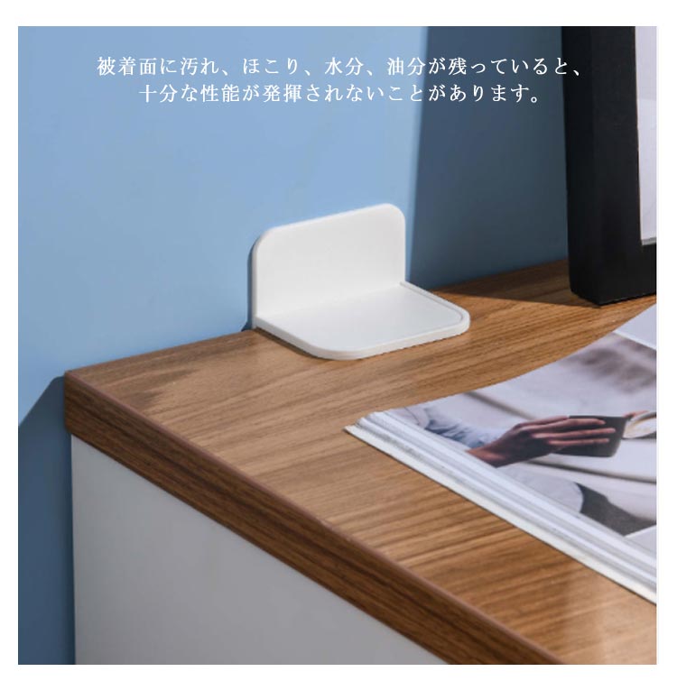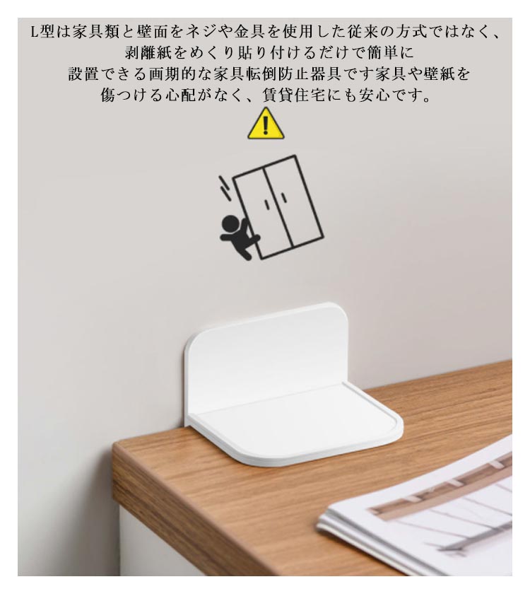 | L型は家具類と壁面をネジや金具を使用した従来の方式ではなく、剥離紙をめくり貼り付けるだけで簡単に設置できる画期的な家具転倒防止器具です家具や壁紙を傷つける心配がなく、賃貸住宅にも安心です。 被着面に汚れ、ほこり、水分、油分が残っていると、十分な性能が発揮されないことがあります。 | |