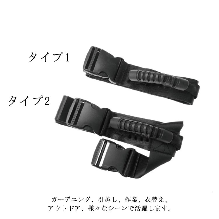 重いものも楽に運べる!ひとり用の運搬ベルト荷物の重量を分散させ、腰や背中への負担を軽減長さの調整が自由にできます。 取っ手が太くて湾曲した形状なので、重量物でも指が痛くなりません。ガーデニング、引越し、作業、衣替え、アウトドア、様々なシーンで活躍します。