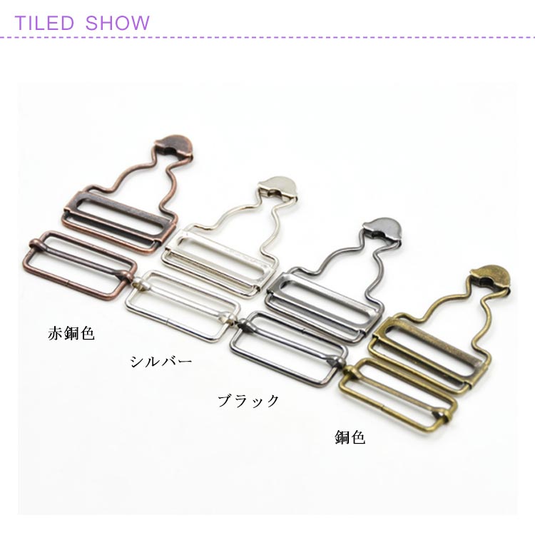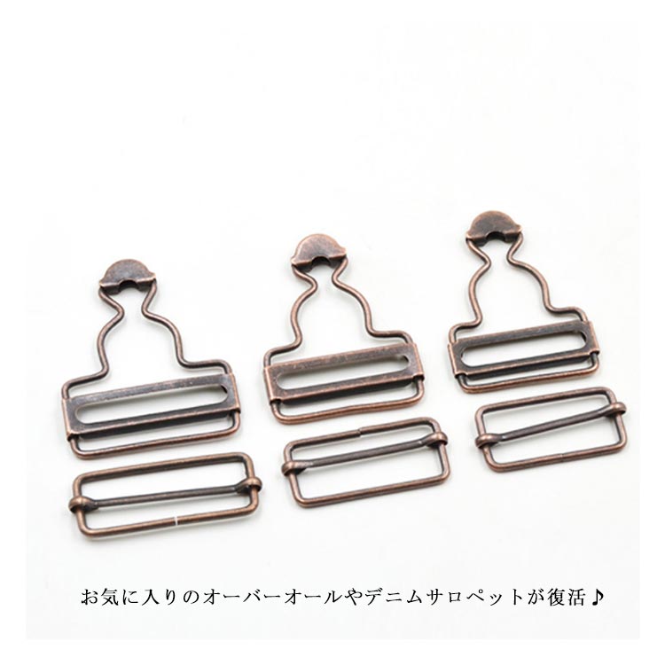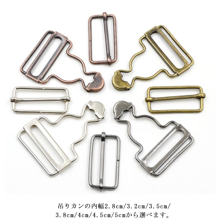 オーバーオールやサロペットなどの肩ひも調節にお使いいただける、タックボタンと移動カンがセットになった吊りカンです。吊りカンの内幅2.8cm/3.2cm/3.5cm/3.8cm/4cm/4.5cm/5cmから選べます。肩紐の金具が無くなって(壊れて)、困っている方に必見!取り付けも簡単で、ハンドメイドやリメイクなどに。お気に入りのオーバーオールやデニムサロペットが復活♪