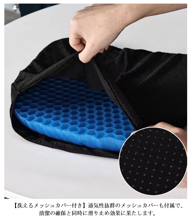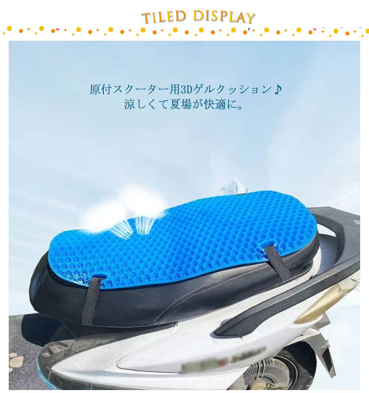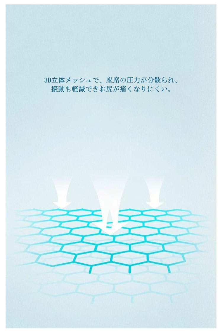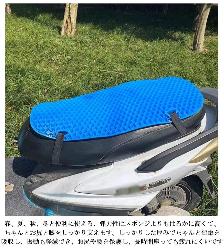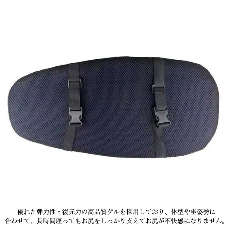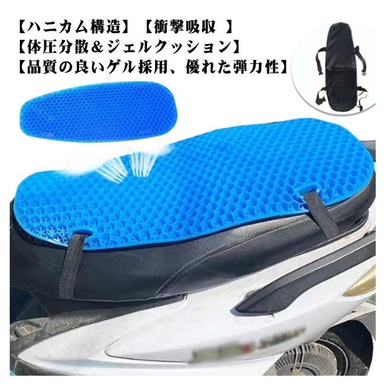 原付スクーター用3Dゲルクッション♪涼しくて夏場が快適に。【ハニカム構造】:ハニカム構造を採用して、体重を分散させる性能が高いゲル素材採用したことで、より柔らかな感覚を得られるとともに、体圧分散性能が向上!。春、夏、秋、冬と便利に使える、弾力性はスポンジよりもはるかに高くて、ちゃんとお尻と腰をしっかり支えます。しっかりした厚みでちゃんと衝撃を吸収し、振動も軽減でき、お尻や腰を保護し、長時間座っても疲れにくいです。【衝撃吸収 】3D立体メッシュで、座席の圧力が分散られ、振動も軽減できお尻が痛くなりにくい。【品質の良いゲル採用、優れた弾力性】優れた弾力性・復元力の高品質ゲルを採用しており、体型や坐姿勢に合わせて、長時間座ってもお尻をしっかり支えてお尻が不快感になりません。【洗えるメッシュカバー付き】通気性抜群のメッシュカバーも付属で、清潔の確保と同時に滑り止め効果に果たします。【体圧分散&ジェルクッション】人間工学に合わせて設計で、体圧を均一に吸収・分散して、均一に体圧分散を行うことで体への負荷を軽減する効果が期待できます。