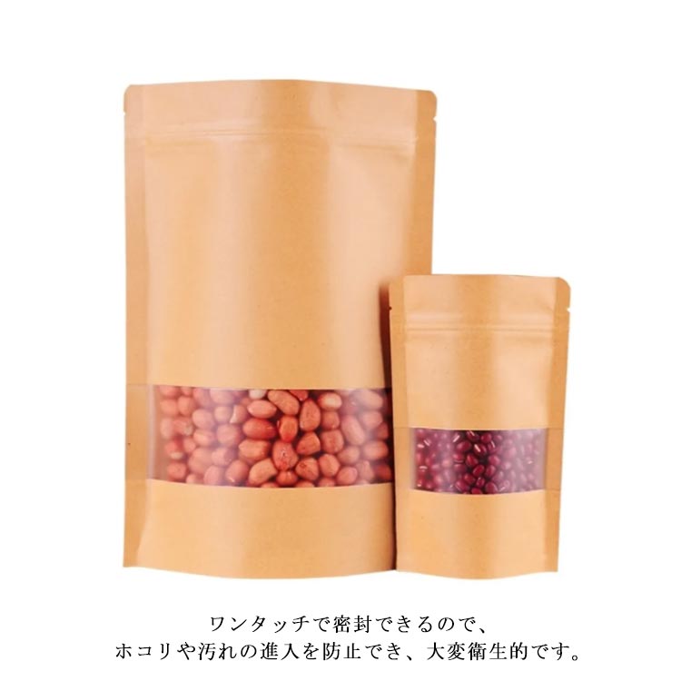 自立する形状 底部はマチがあるから自立することができます。容量が大きくなりながら収納も便利です。普段は紙一枚のよう畳めて収納できて、物を入れたらちゃんと立てて放置できます。シーラー対応でも可能です。防湿性・遮光性・気密性に優れているので、美味しさを損なう「空気」や「湿気」、「光」などから食品を守ります。窓付袋ですから、袋の中身が一目で分かれます。デザートの包装や薬品管理など適用しています。封入口にチャックを設けた紙袋です。ワンタッチで密封できるので、ホコリや汚れの進入を防止でき、大変衛生的です。また、繰り返し開閉できるため、頻繁に開封するような用途にも使えます。