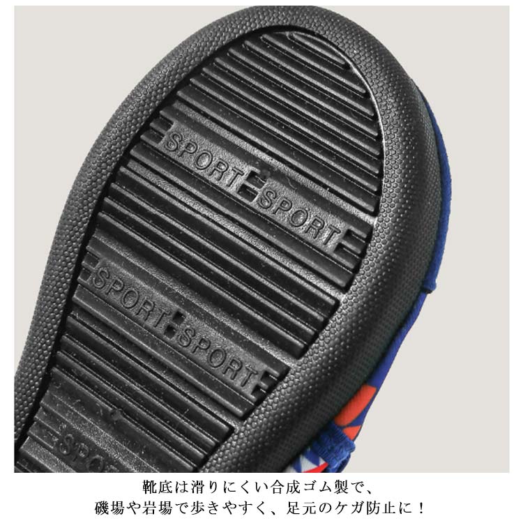 | 【マリンシューズ】【子供用】【水陸両用】 ケガや冷えから素足を守るマリンシューズ登場。 海?プール?川?学校などでの水遊び時に大活躍。 磯場や岩場の石、ビーチに落ちているガラス片や貝殻などから足を守り、足元を保温します。 靴底は滑りにくい合成ゴム製で、磯場や岩場で歩きやすく、足元のケガ防止に! お子様一人でも履くことができる開口部の広いマジックテープ仕様 甲材には、通気性と排水性に優れた速乾素材を採用。海や川でのアクティビティも楽しく快適に! | |