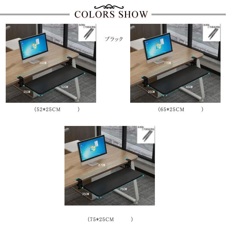 | 選べる3サイズ!簡単取付のキーボードスライダー 机の上が狭いと感じたならばこれ! かんたんに取付ができるキーボードスライダーです。 選べる3サイズあるので、キーボードとマウス併用可能。耐荷重25KGまで。 クランプ式で取り付け簡単だから、テレワーク時でも机を広く使えるようになります。 高さ調節可能な金属クランプを備えた人間工学に基づいたデスク下のスライド式キーボードトレイ。 表面に損傷を与える可能性のあるネジを机にドリルで取り付けたり取り付けたりすることなく、簡単に取り付けることができます。 キーボードスライダーを使うことで、背筋が伸び正しい姿勢で作業を行うことができます。 | |