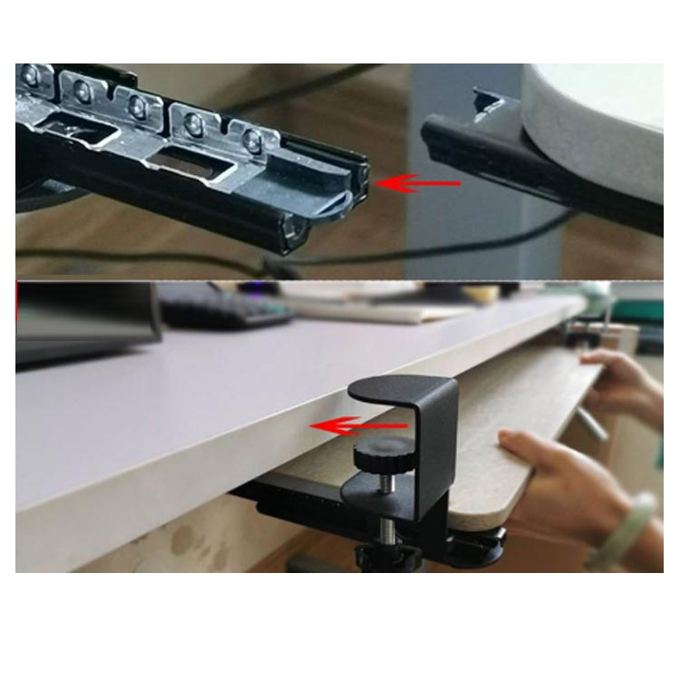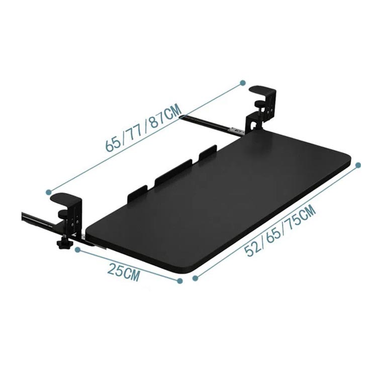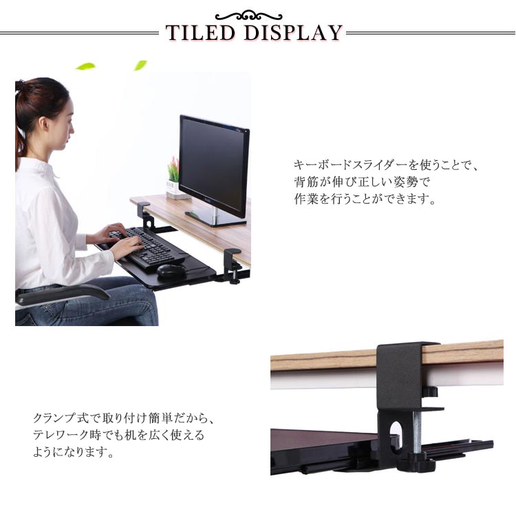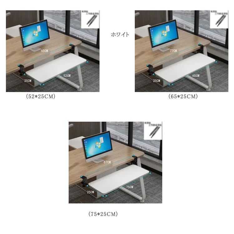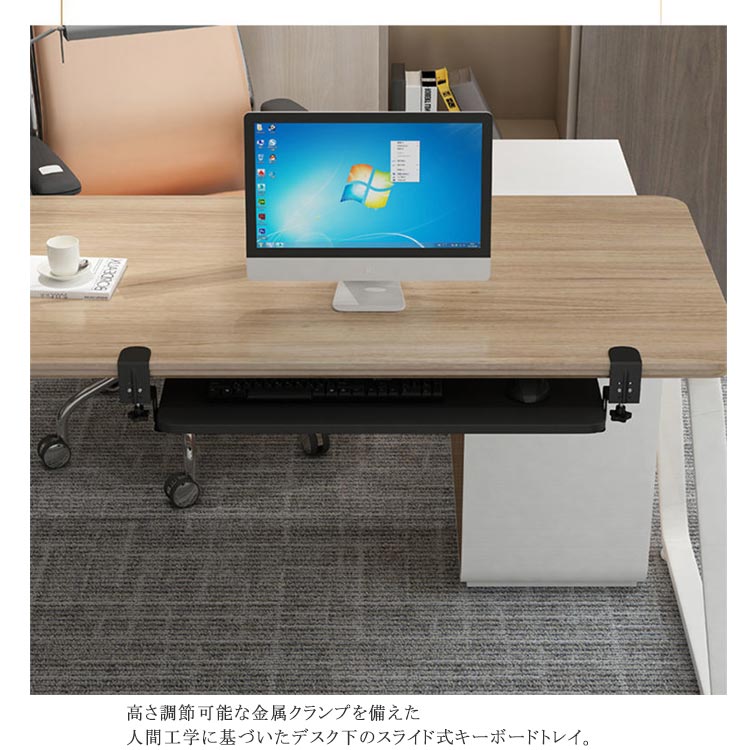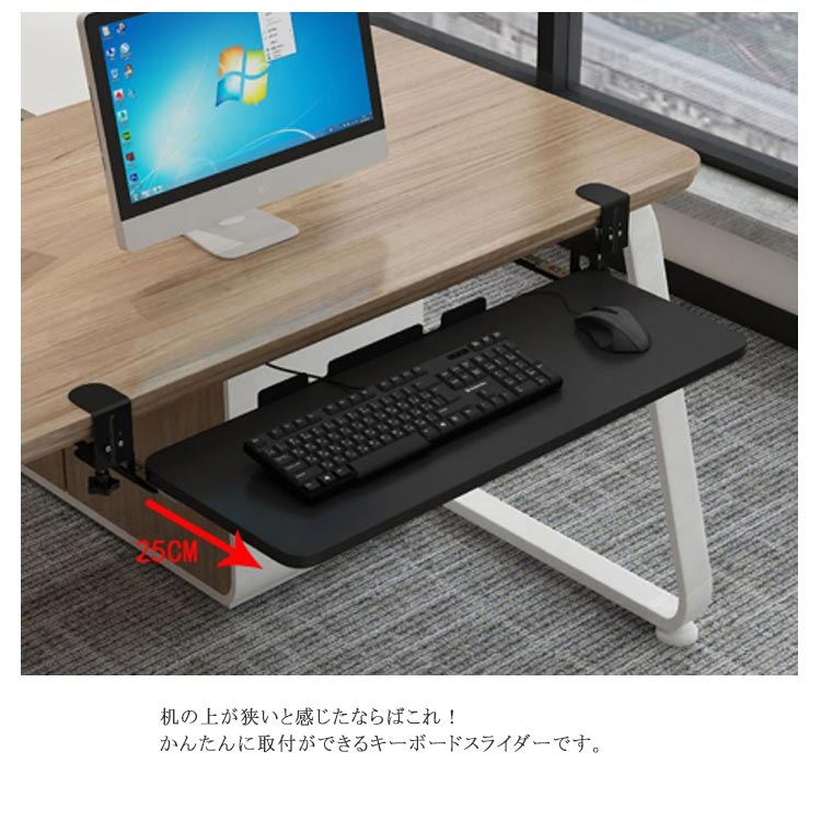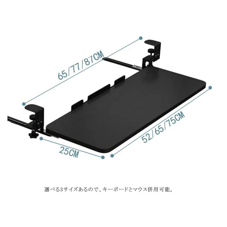 選べる3サイズ!簡単取付のキーボードスライダー机の上が狭いと感じたならばこれ! かんたんに取付ができるキーボードスライダーです。選べる3サイズあるので、キーボードとマウス併用可能。耐荷重25KGまで。クランプ式で取り付け簡単だから、テレワーク時でも机を広く使えるようになります。高さ調節可能な金属クランプを備えた人間工学に基づいたデスク下のスライド式キーボードトレイ。 表面に損傷を与える可能性のあるネジを机にドリルで取り付けたり取り付けたりすることなく、簡単に取り付けることができます。キーボードスライダーを使うことで、背筋が伸び正しい姿勢で作業を行うことができます。