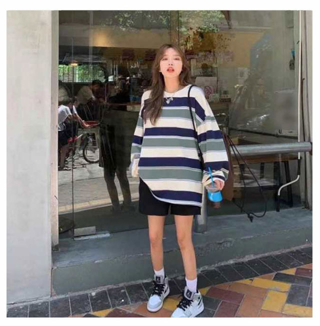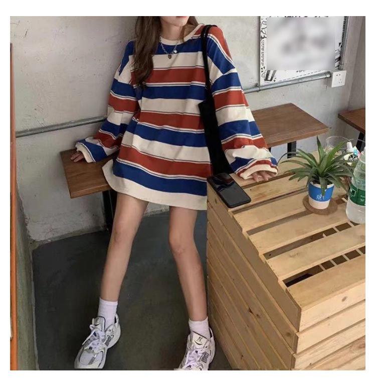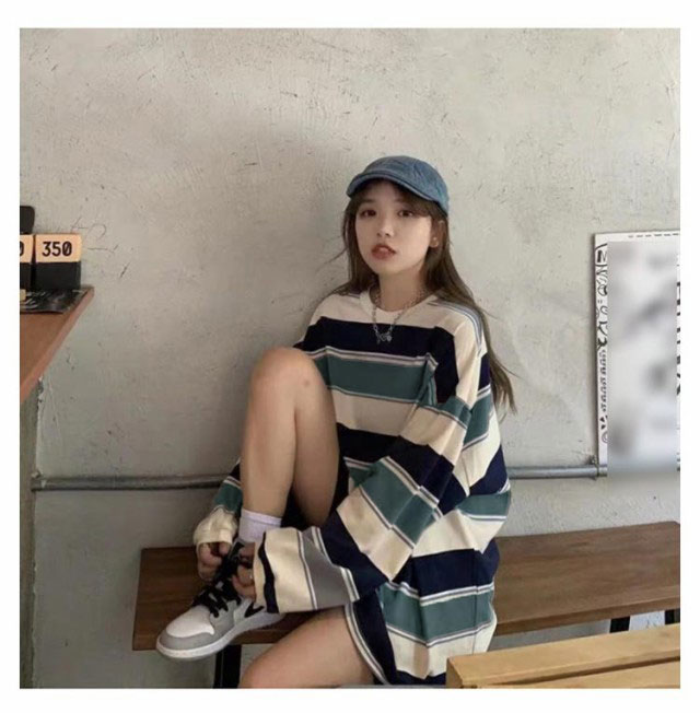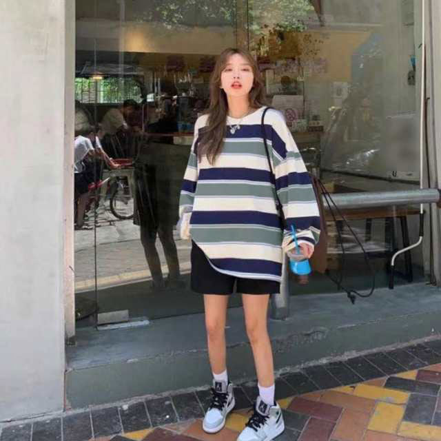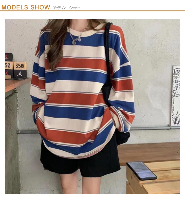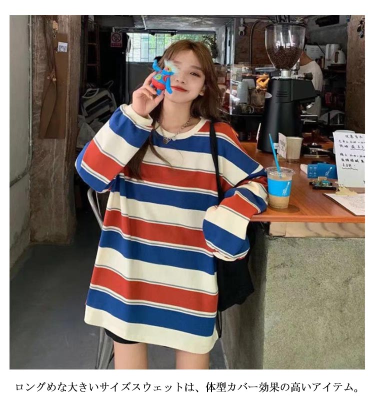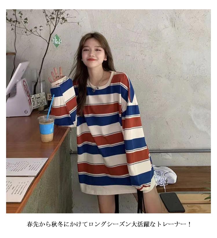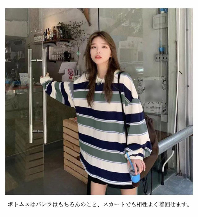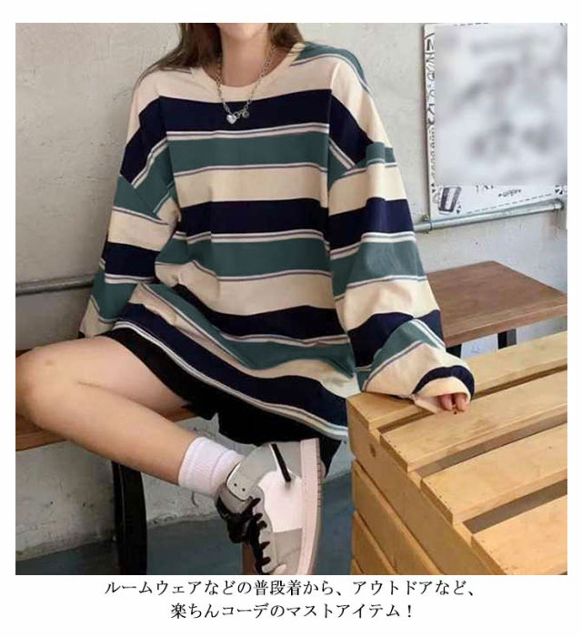 ビッグシルエットでトレンド感満載なオーバーサイズ長袖ボーダーtシャツ。春先から秋冬にかけてロングシーズン大活躍なトレーナー!ロングめな大きいサイズスウェットは、体型カバー効果の高いアイテム。ルームウェアなどの普段着から、アウトドアなど、楽ちんコーデのマストアイテム!ボトムスはパンツはもちろんのこと、スカートでも相性よく着回せます。