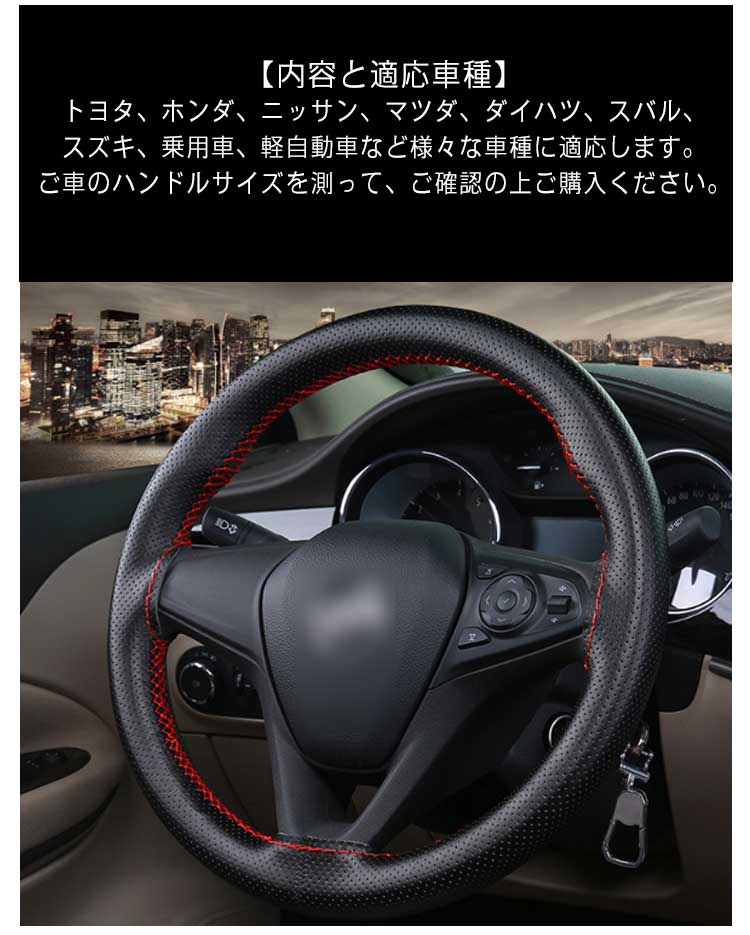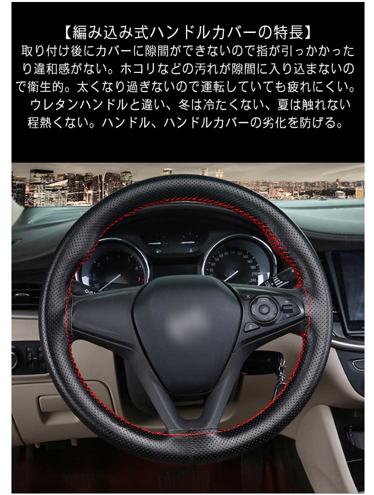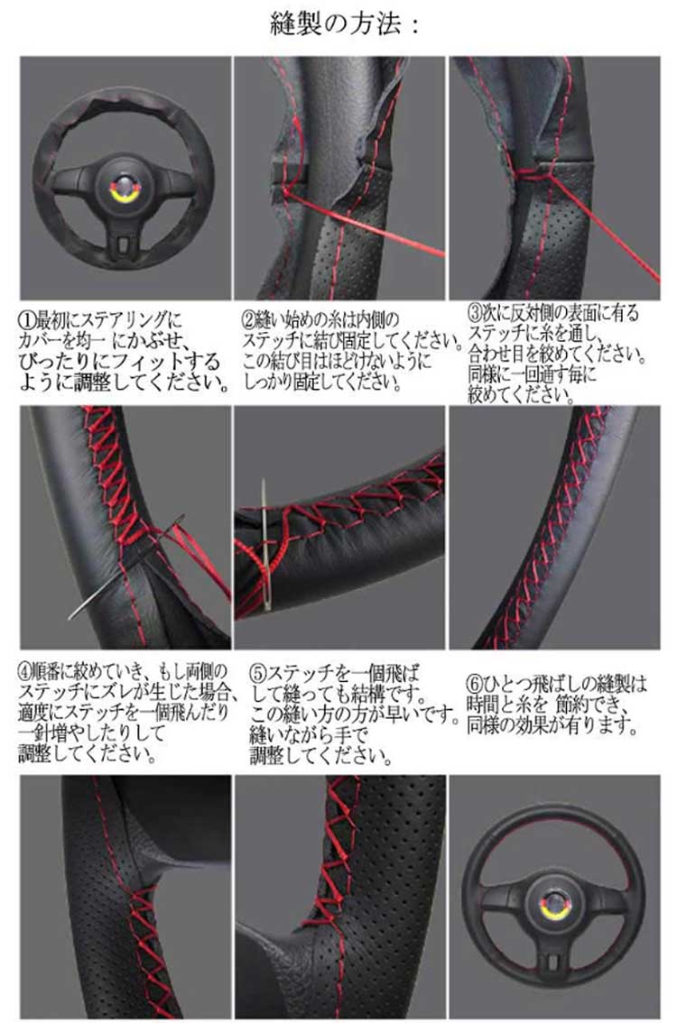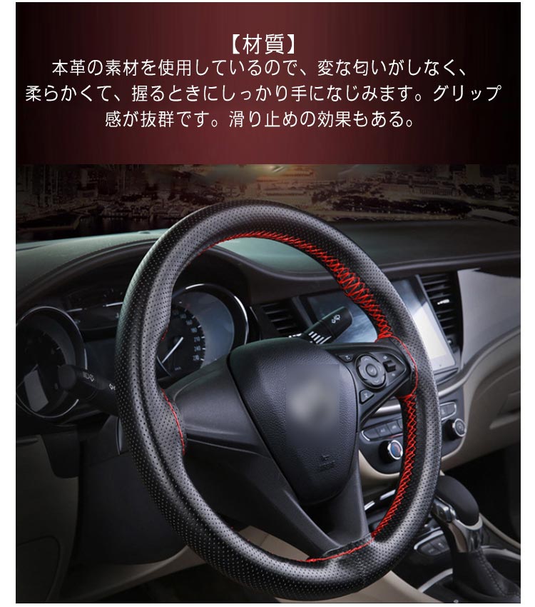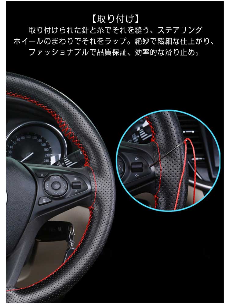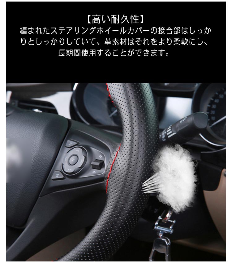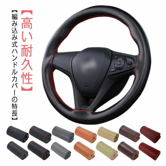 【材質】本革の素材を使用しているので、変な匂いがしなく、柔らかくて、握るときにしっかり手になじみます。グリップ感が抜群です。滑り止めの効果もある。【高い耐久性】編まれたステアリングホイールカバーの接合部はしっかりとしっかりしていて、革素材はそれをより柔軟にし、長期間使用することができます。【編み込み式ハンドルカバーの特長】取り付け後にカバーに隙間ができないので指が引っかかったり違和感がない。ホコリなどの汚れが隙間に入り込まないので衛生的。太くなり過ぎないので運転していても疲れにくい。 ウレタンハンドルと違い、冬は冷たくない、夏は触れない程熱くない。ハンドル、ハンドルカバーの劣化を防げる。【取り付け】取り付けられた針と糸でそれを縫う、ステアリングホイールのまわりでそれをラップ。絶妙で繊細な仕上がり、ファッショナブルで品質保証、効率的な滑り止め。【内容と適応車種】トヨタ、ホンダ、ニッサン、マツダ、ダイハツ、スバル、スズキ、乗用車、軽自動車など様々な車種に適応します。ご車のハンドルサイズを測って、ご確認の上ご購入ください。