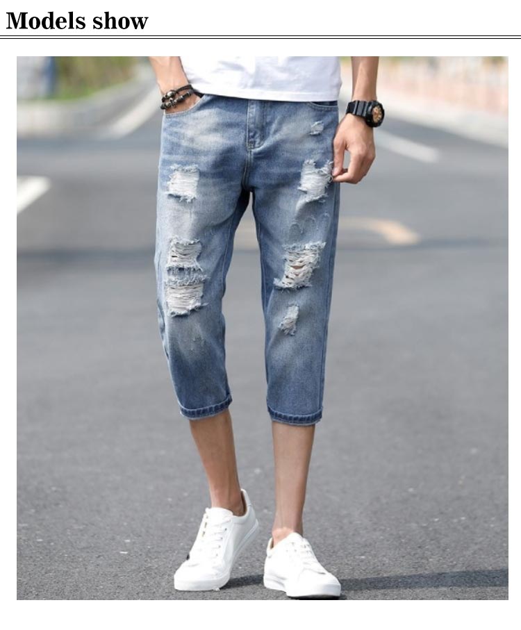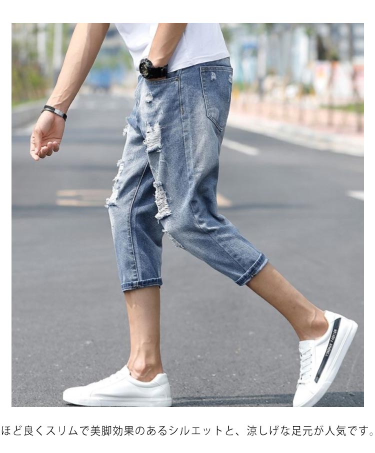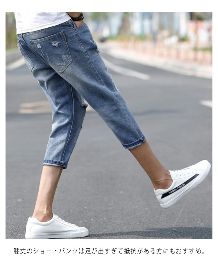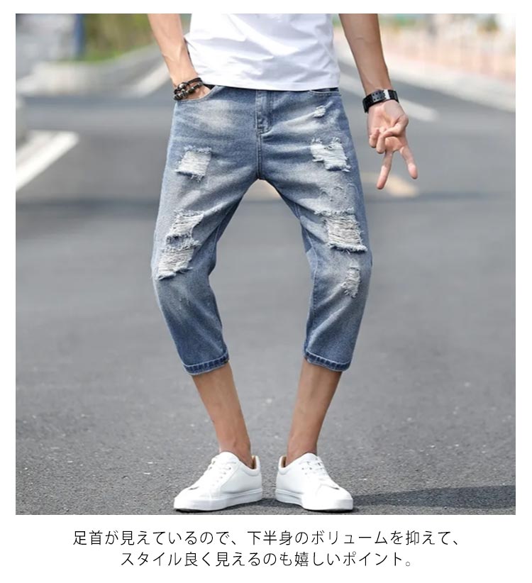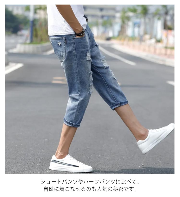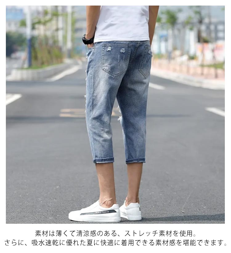 デニム ハーフパンツ 膝下丈 ダメージ メンズ デニム ショートパンツ 7分丈 クロップドパンツ スリム 細身 デニムパンツ 短パン スキニー ストレッチ 薄手 夏 春 カジュアル 大人 学生 ブルー 大きいサイズ M L XL 2XL 3XL