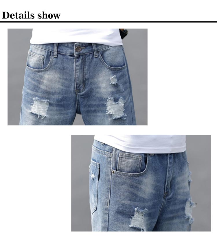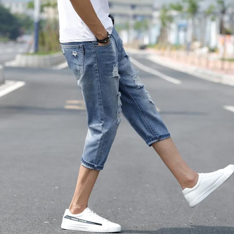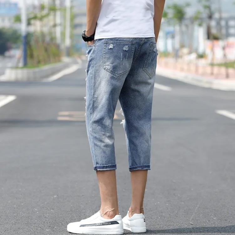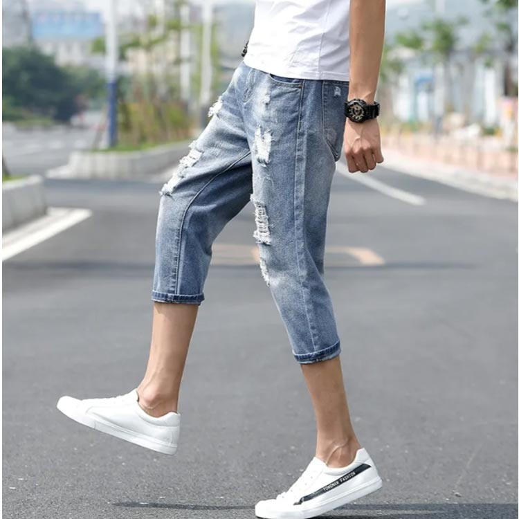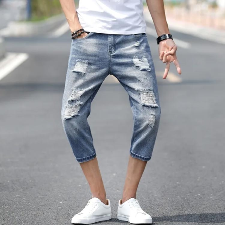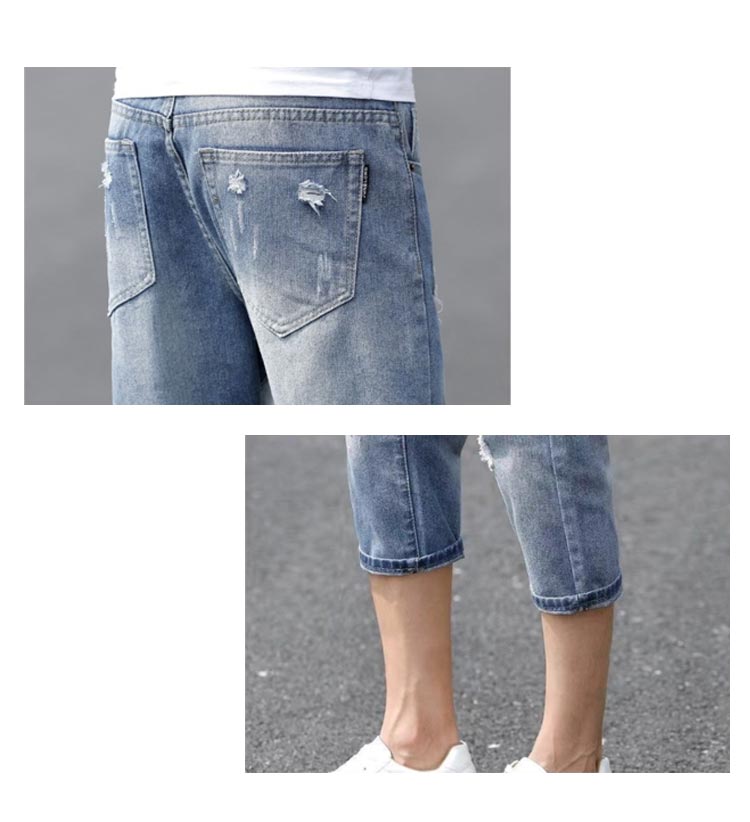 デニム ハーフパンツ 膝下丈 ダメージ メンズ デニム ショートパンツ 7分丈 クロップドパンツ スリム 細身 デニムパンツ 短パン スキニー ストレッチ 薄手 夏 春 カジュアル 大人 学生 ブルー 大きいサイズ M L XL 2XL 3XL