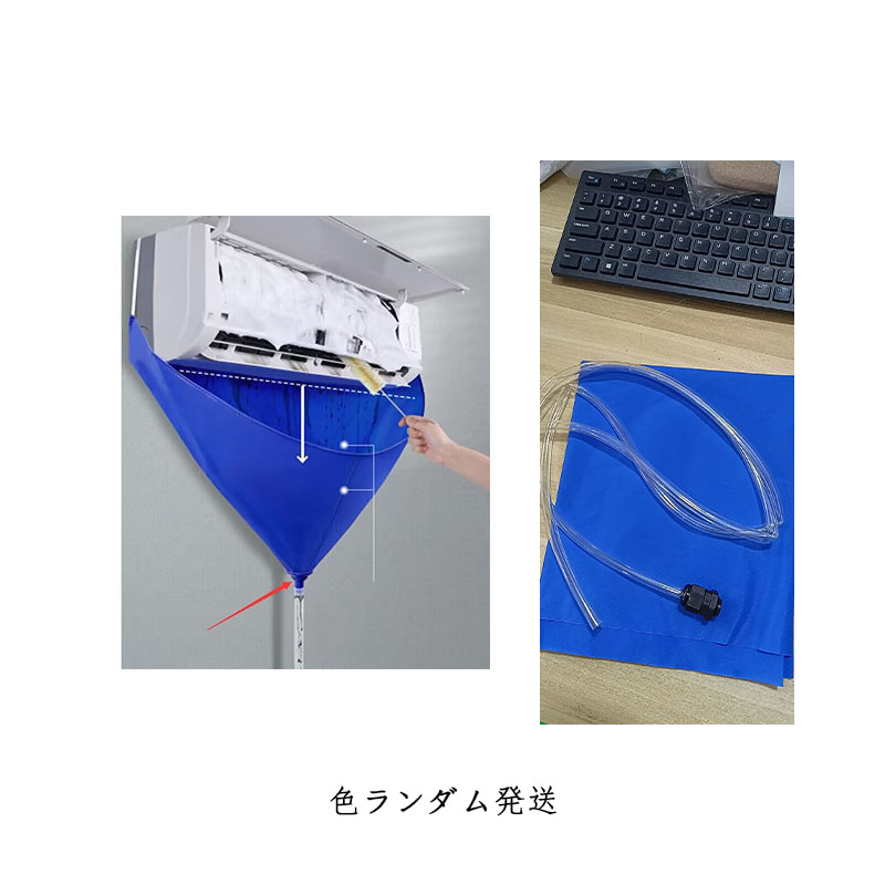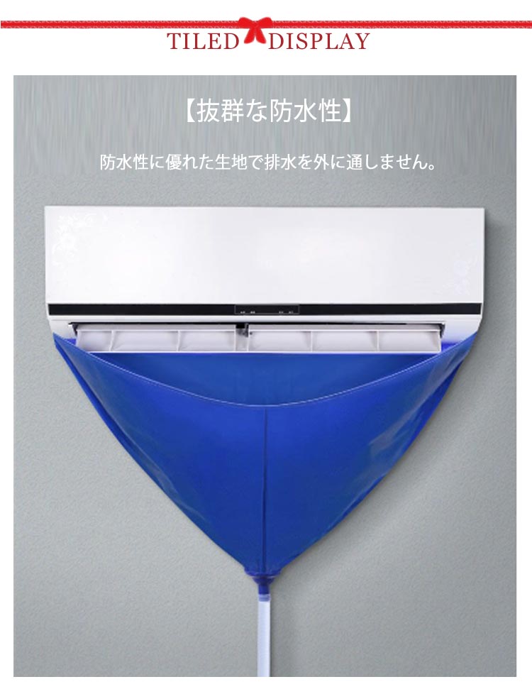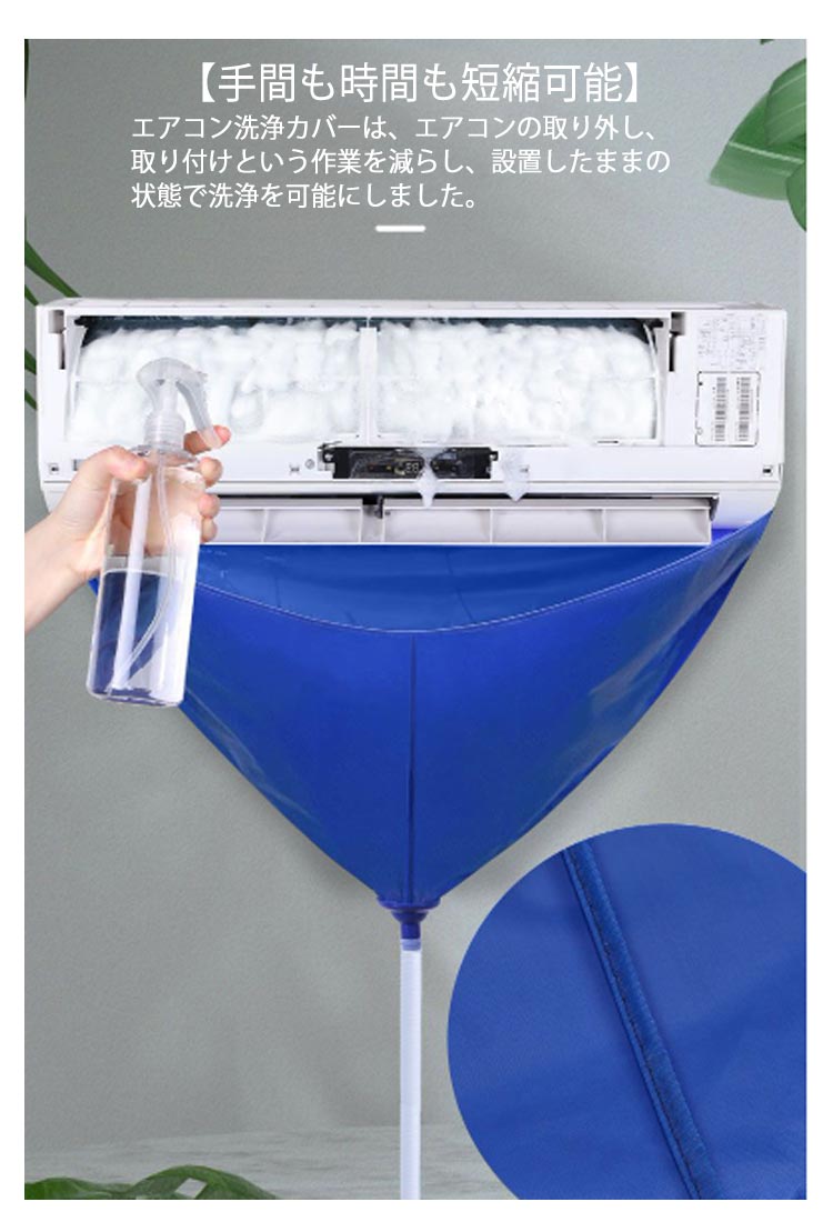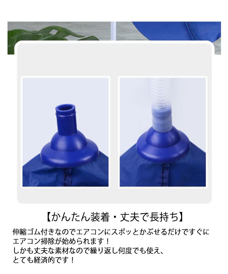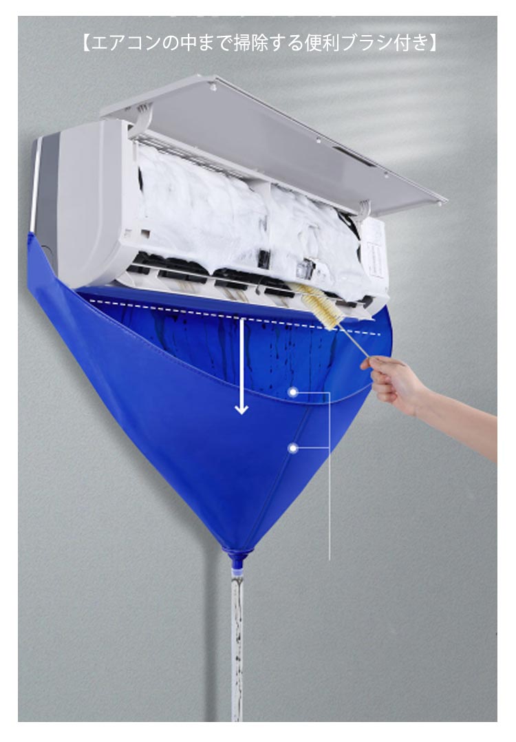 エアコンクリーニングに必須の壁掛用エアコン洗浄カバー3点セット!【抜群な防水性】防水性に優れた生地で排水を外に通しません。【汚れた水を流せる排水チューブ(約)2m付き】【エアコンの中まで掃除する便利ブラシ付き】【手間も時間も短縮可能】エアコン洗浄カバーは、エアコンの取り外し、取り付けという作業を減らし、設置したままの状態で洗浄を可能にしました。【かんたん装着・丈夫で長持ち】伸縮ゴム付きなのでエアコンにスポッとかぶせるだけですぐにエアコン掃除が始められます!しかも丈夫な素材なので繰り返し何度でも使え、とても経済的です!