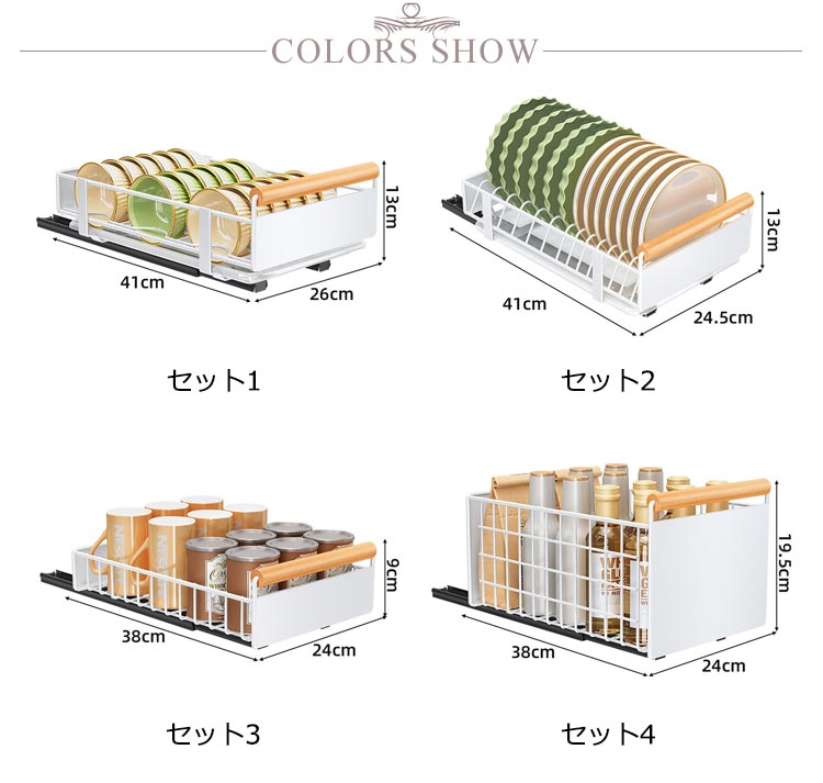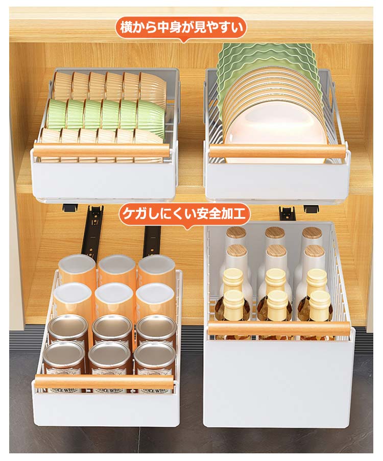 | 4タイプ 滑らかで音も静かなスライド式 出し入れしやすいスライド式 横から中身が見やすい ケガしにくい安全加工 | |