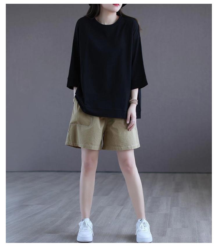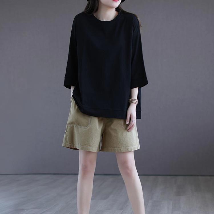 柔らかくしっかりとした質感が魅力のコットンカットソー。ャツ。肌あたりの良い、伸縮性のあるコットン生地で気軽に自然体で着られ、デイリーアイテムに最適です!程よいゆとりと七分丈のドロップスリーブで動きやすい。重ね着のインナーとしてはもちろん、一枚で着ても身体のシルエットがでにくいようフィットし過ぎないサイズ感。ボトムスを問わず、春夏に大活躍するトップス間違いなし。