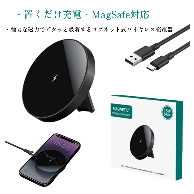 ワイヤレス充電器 magsafe対応 置くだけ充電 15W iPhone マグセーフ対応 マグネット式 急速充電 スタンド機能 スリム 薄型 Type-C出入力 コンパクト バッテリーではない