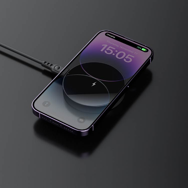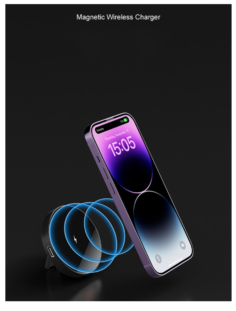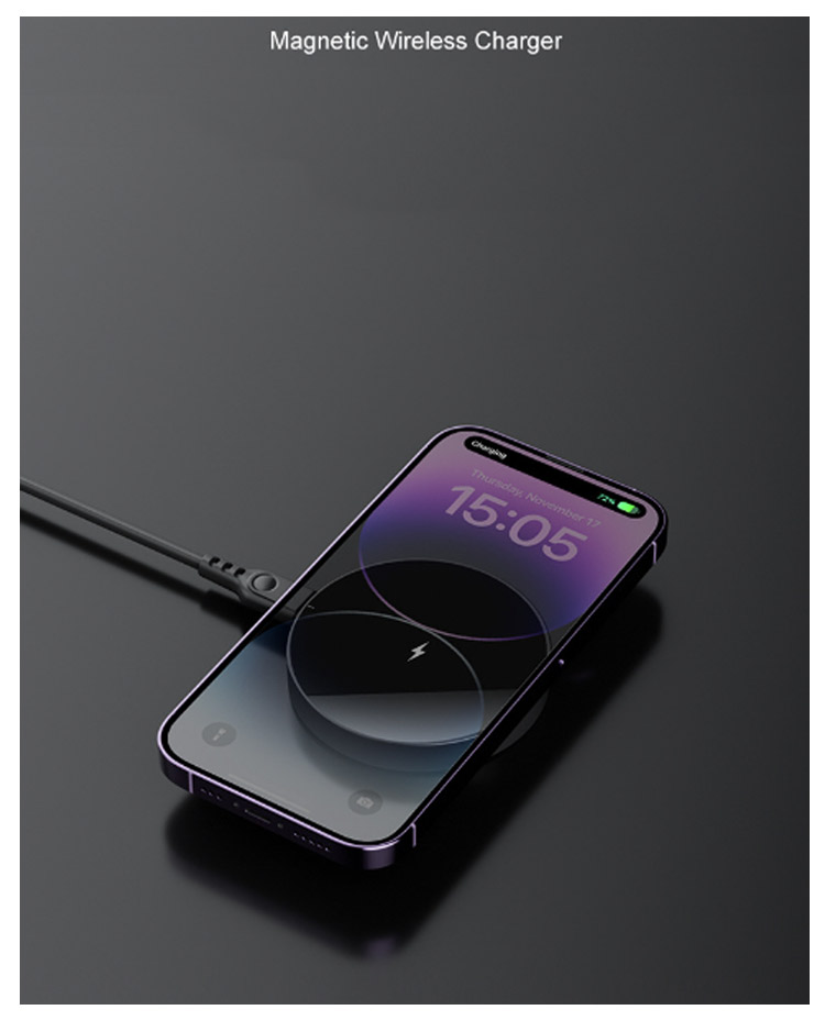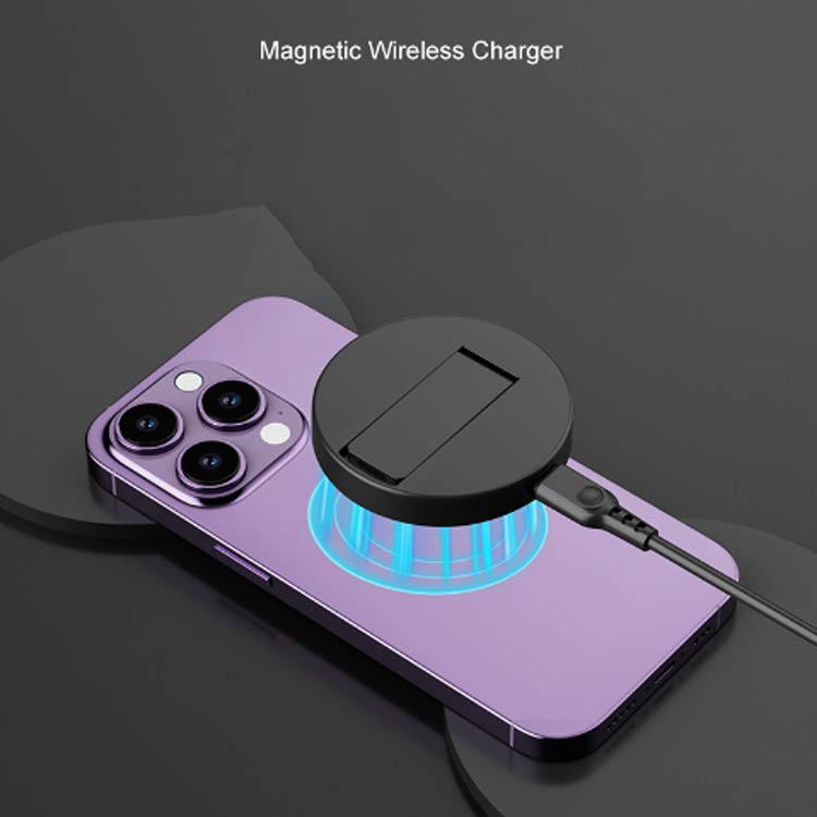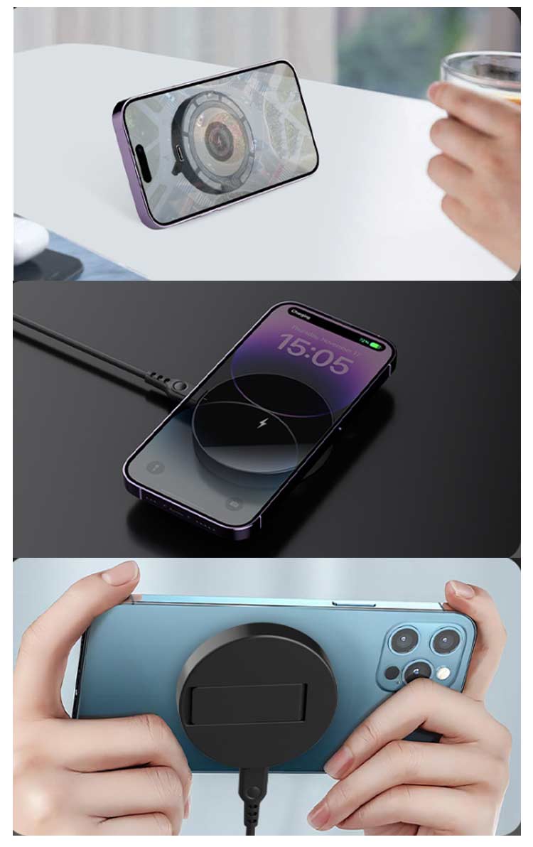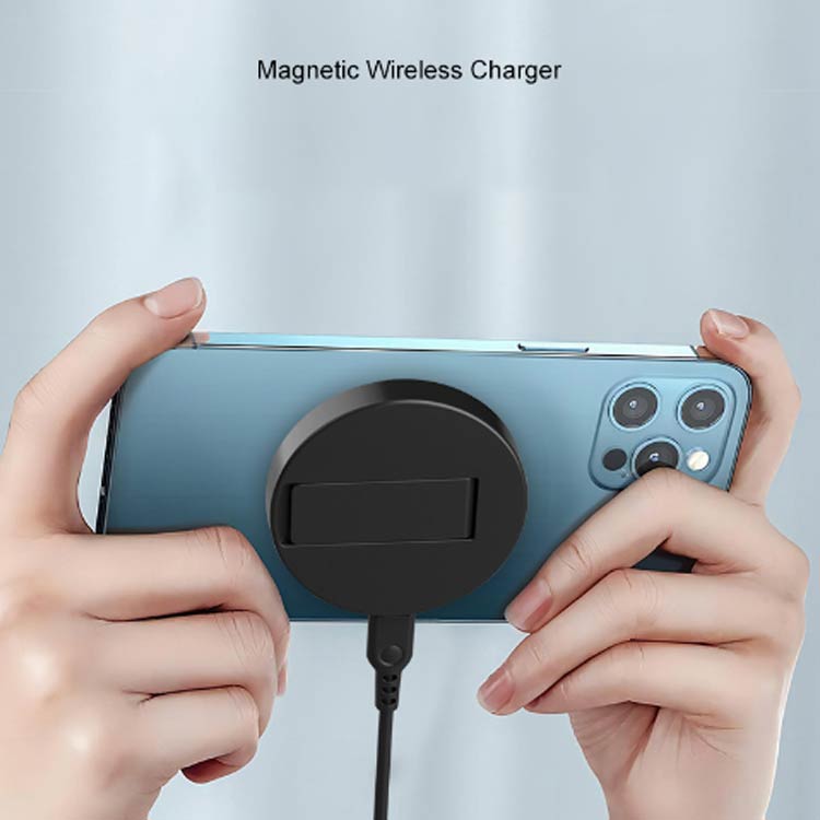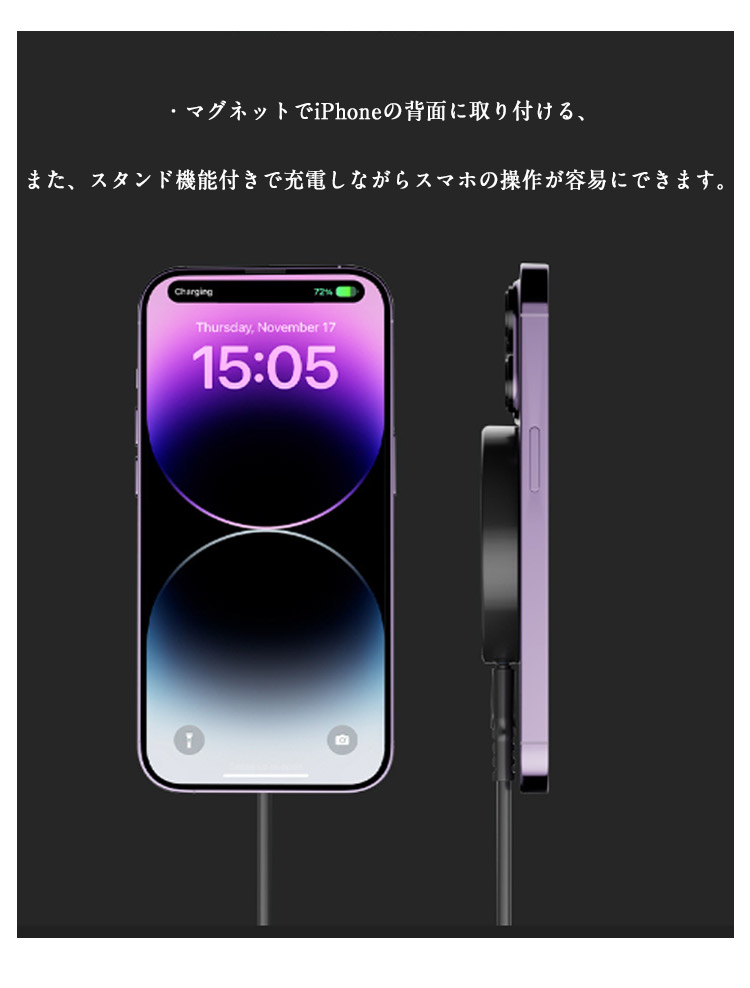 ・置くだけ充電 ・MagSafe対応 ・強力な磁力でピタッと吸着するマグネット式ワイヤレス充電器 ・マグネットでiPhoneの背面に取り付ける、また、スタンド機能付きで充電しながらスマホの操作が容易にできます。