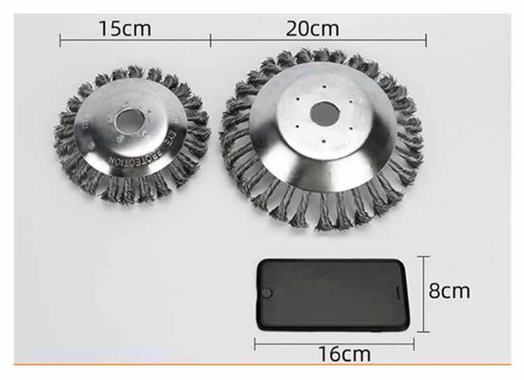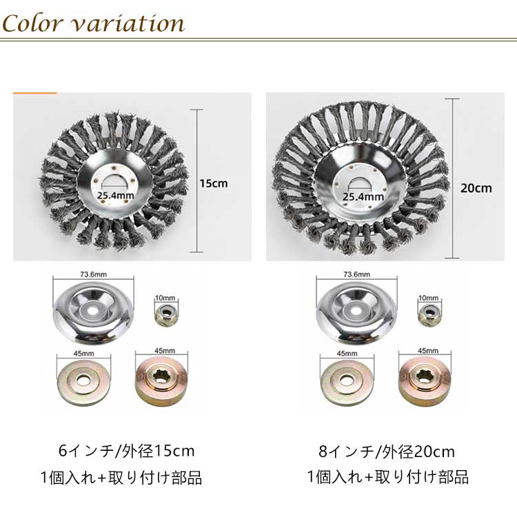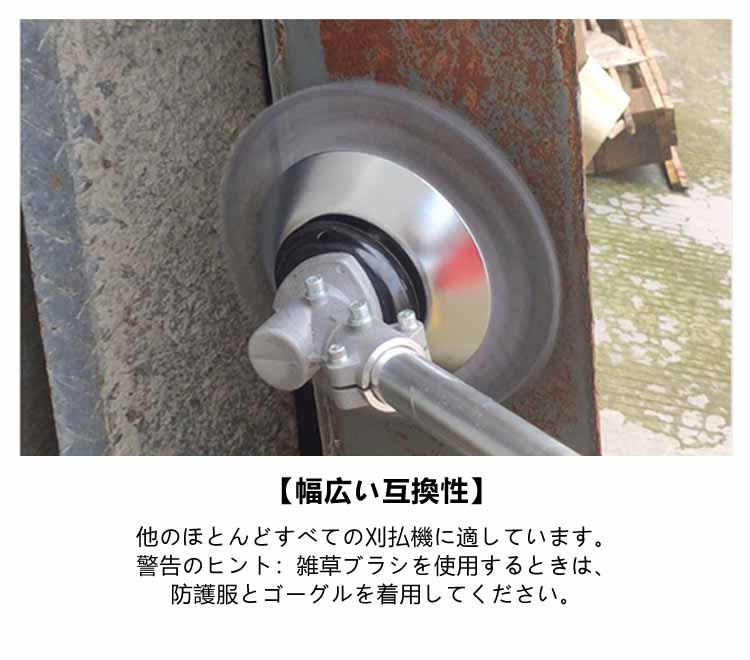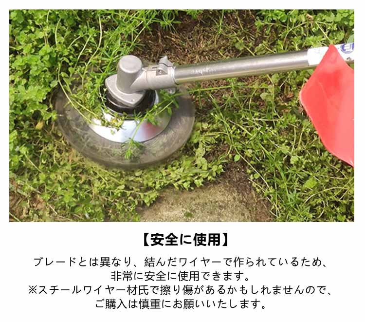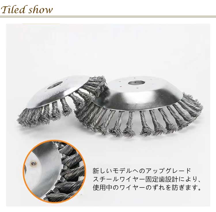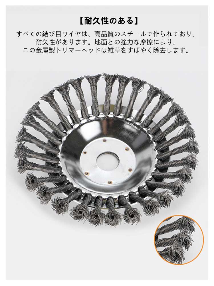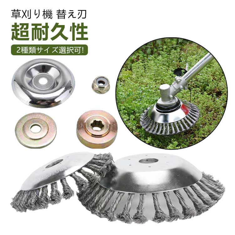 草刈り機 替え刃超耐久性2種類サイズ選択可!草刈器交換用ヘッド新規アップグレード、草取りが楽になります。【耐久性のある】すべての結び目ワイヤは、高品質のスチールで作られており、耐久性があります。地面との強力な摩擦により、この金属製トリマーヘッドは雑草をすばやく除去します。【安全に使用】ブレードとは異なり、結んだワイヤーで作られているため、非常に安全に使用できます。※スチールワイヤー材氏で擦り傷があるかもしれませんので、ご購入は慎重にお願いいたします。【幅広い互換性】他のほとんどすべての刈払機に適しています。警告のヒント:雑草ブラシを使用するときは、防護服とゴーグルを着用してください。【さまざまな用途】このチップソーは、庭、歩道の草刈だけではなく、レンガの縫い目などに苔取り、バリ取り、粉塵除去、酸化物除去、クリーニングなどにも適しています。石やハードブロックを打つとき、それは正常に動作することができます。<お勧めポイント>●均一性研磨・延伸後の色合いのばらつきがない●効率が高いコケ畑の掃除、金属の錆取り、草取りは効率的で手間がかかりません●放熱性が良いばね鋼線と構造の空隙が大きく弾性があるので工作物の表面が発熱で黒くなりません