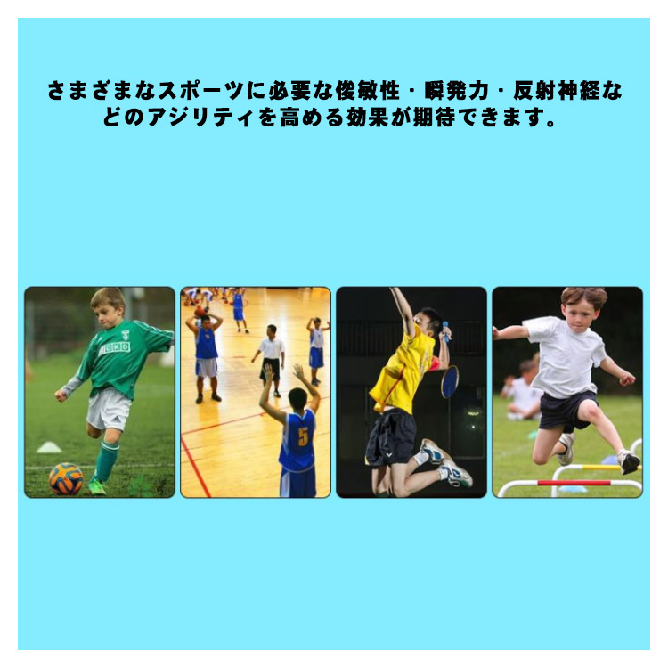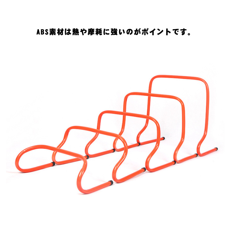 軽量ABS素材なので、持ち運びしやすいミニハードル5個セット。さまざまなスポーツに必要な俊敏性・瞬発力・反射神経などのアジリティを高める効果が期待できます。足腰の筋力アップや切り返しに使うボディバランスの向上、ジャンプにかかわる反発力なども鍛えることが可能です。ABS素材は熱や摩耗に強いのがポイントです。
