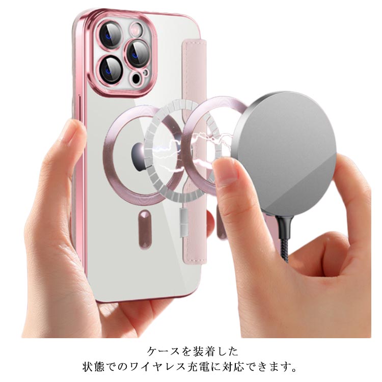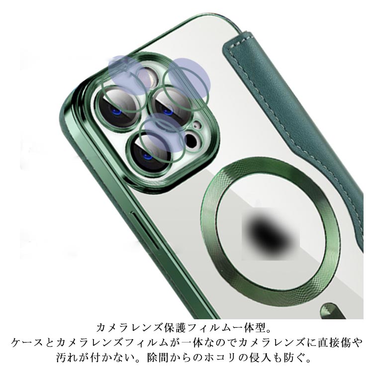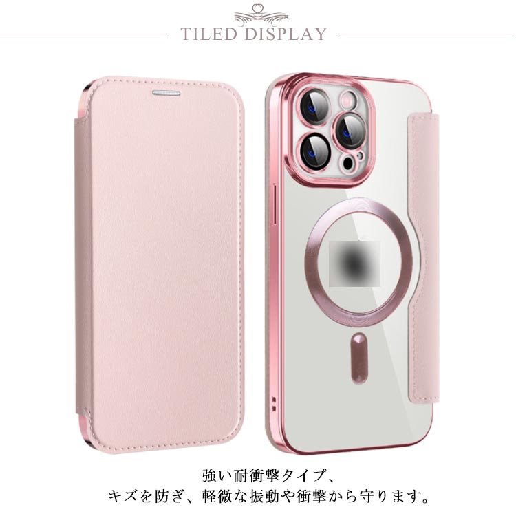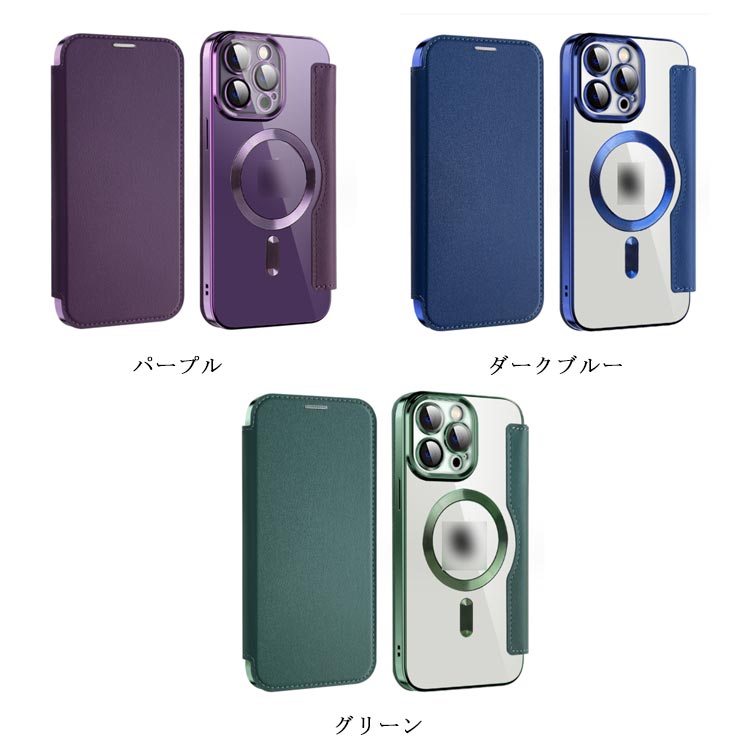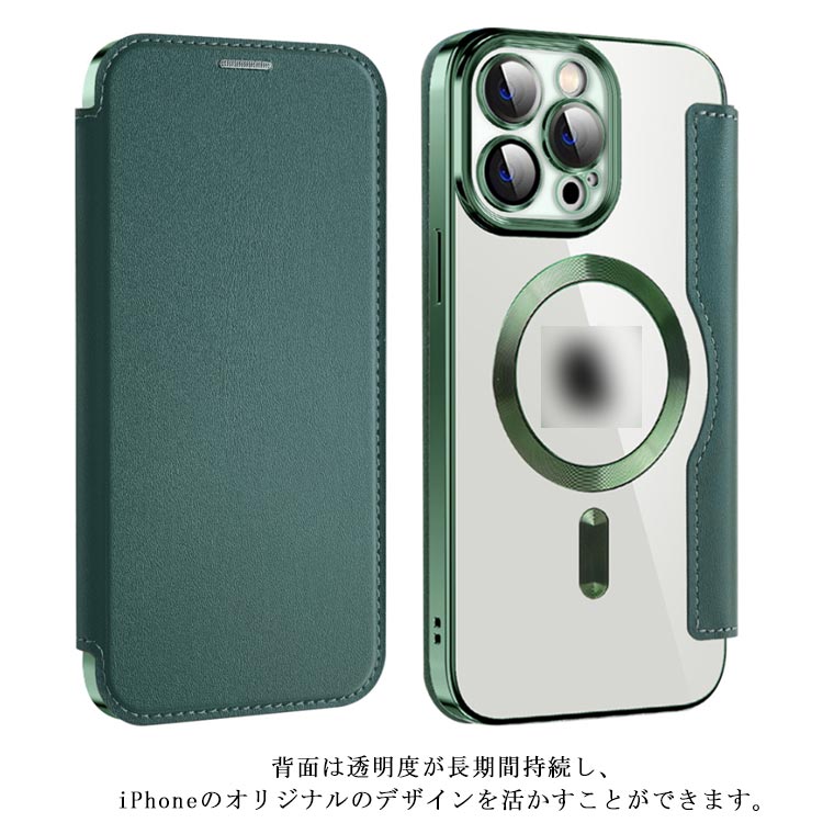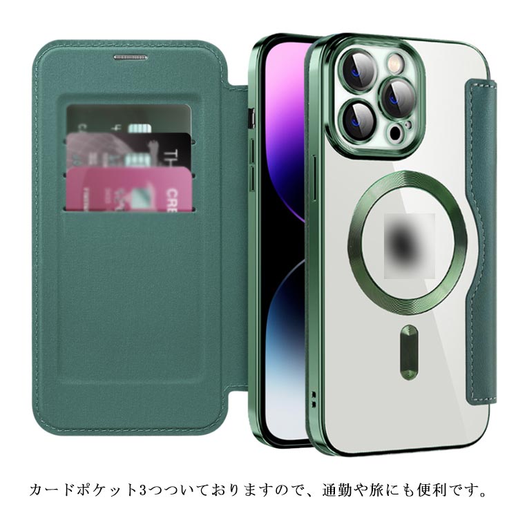 Magsafe対応 手帳型ケース強い耐衝撃タイプ、キズを防ぎ、軽微な振動や衝撃から守ります。柔らかい素材で、取り付きもしやすいので、本体に傷つけにくい。ケースを装着した状態でのワイヤレス充電に対応できます。背面は透明度が長期間持続し、iPhoneのオリジナルのデザインを活かすことができます。カードポケット3つついておりますので、通勤や旅にも便利です。カメラレンズ保護フィルムー体型。ケースとカメラレンズフィルムが一体なのでカメラレンズに直接傷や汚れが付かない。除間からのホコリの侵入も防ぐ。