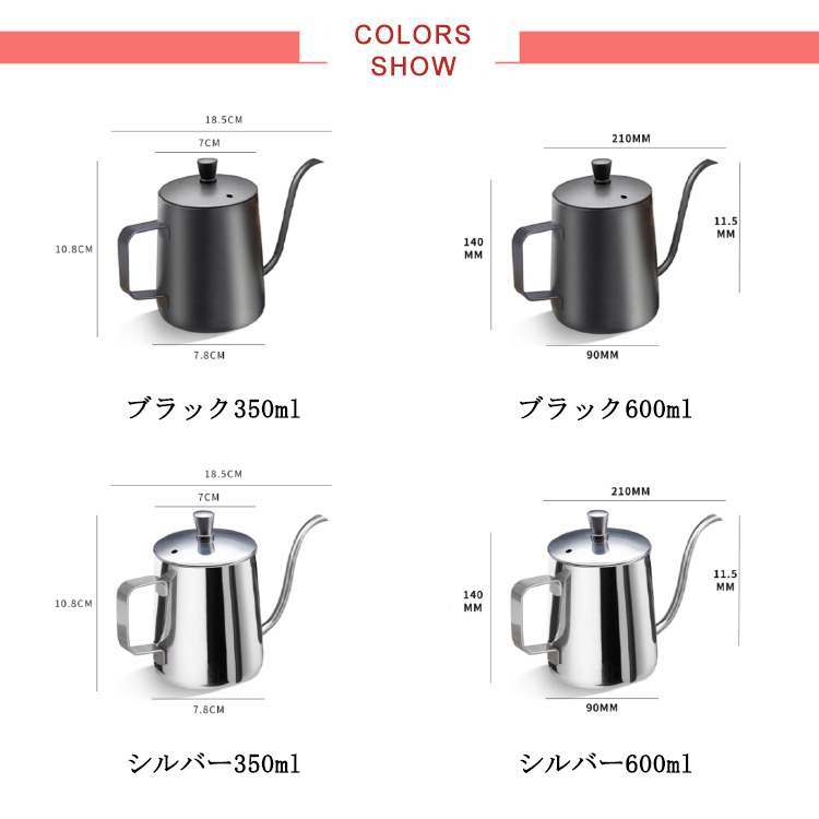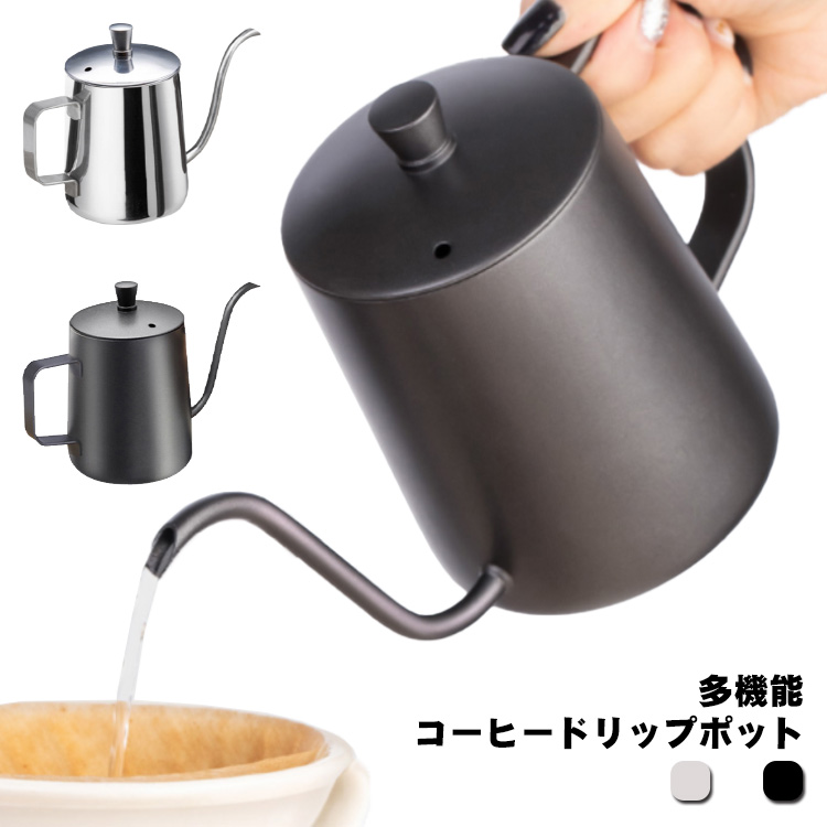 コーヒードリップポット 350ml 600ml 直火可能 ステンレス 細口 ポット コーヒーポット コーヒー グッズ ケトル コーヒーケトル コーヒー器具 ドリップポット アウトドア キャンプ用 自宅用 おしゃれ シンプル ブラック シルバー
