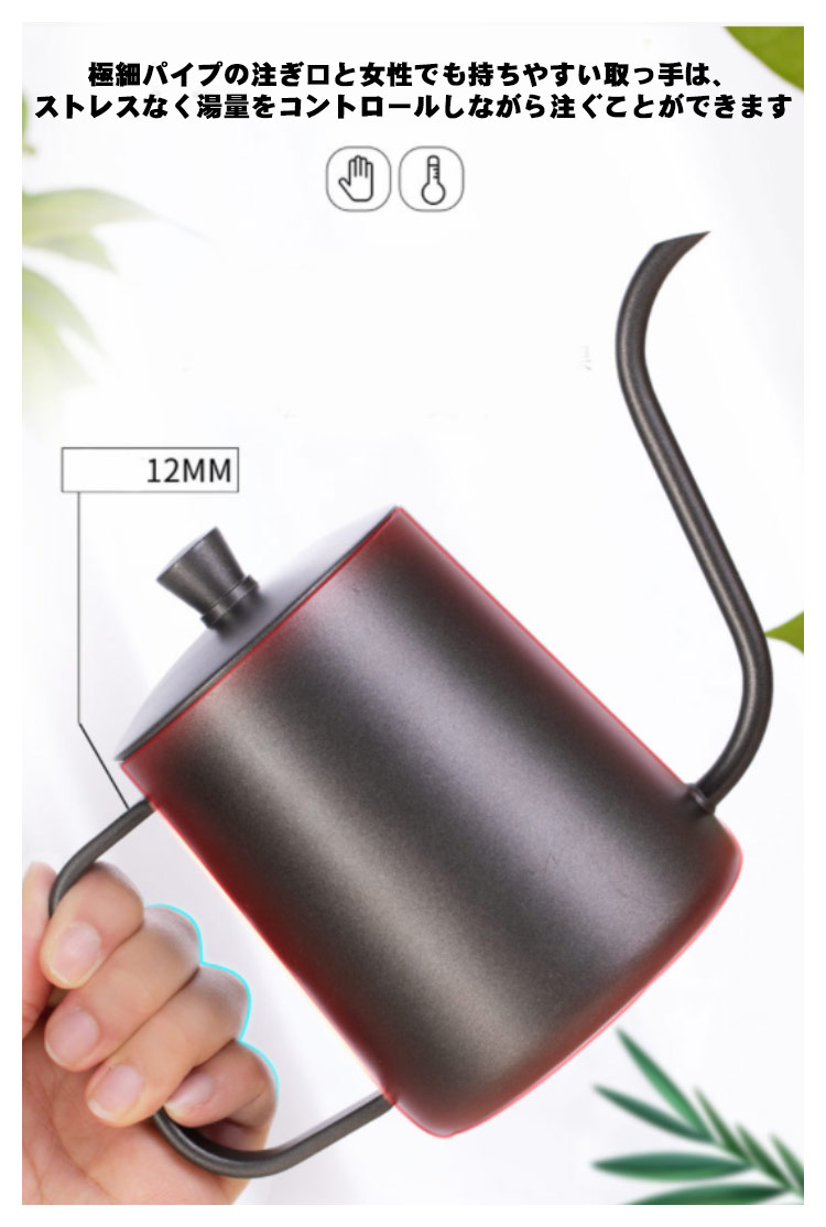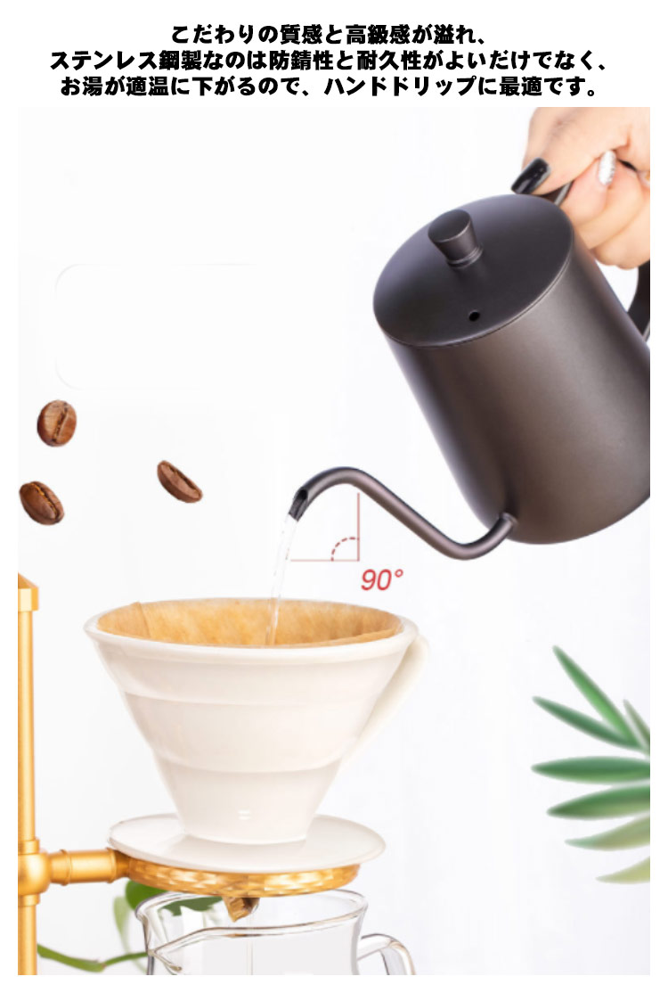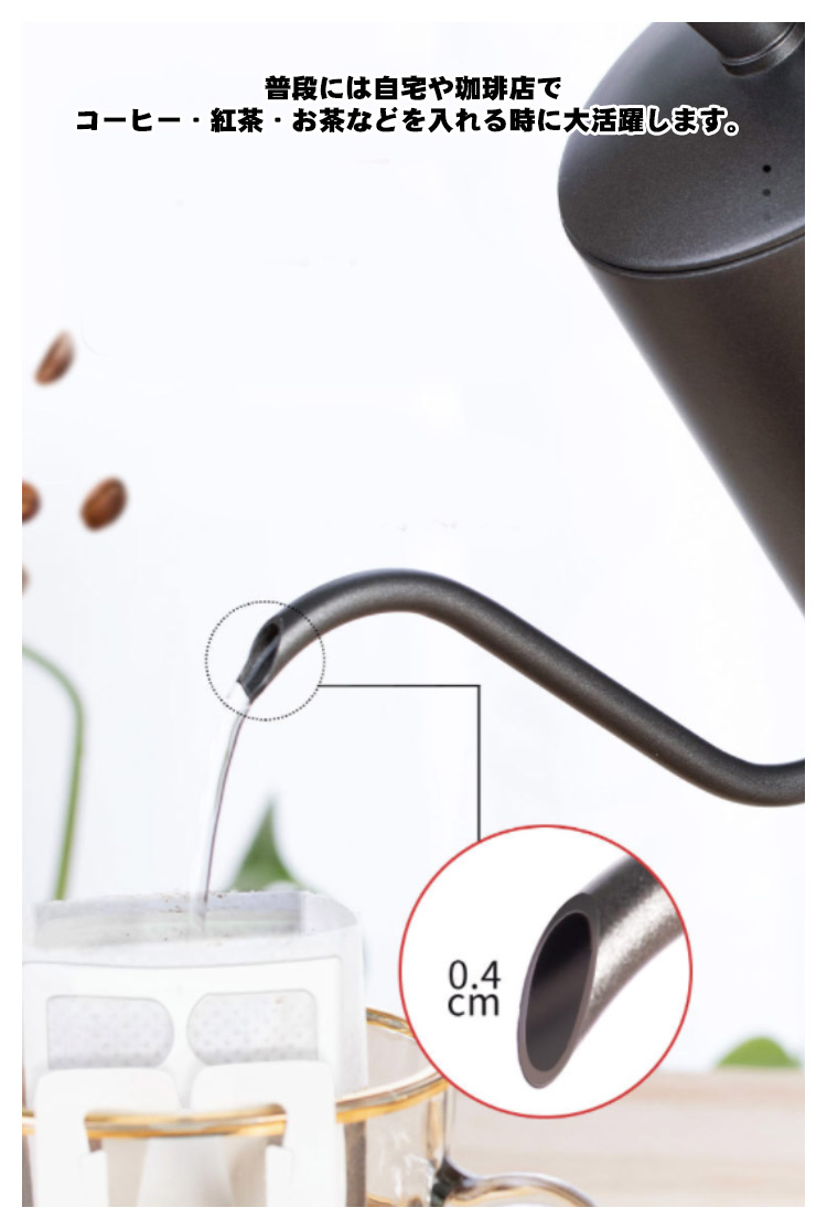 | 多機能コーヒードリップポット。 【注ぎ口が細くカーブ】極細パイプの注ぎ口と女性でも持ちやすい取っ手は、ストレスなく湯量をコントロールしながら注ぐことができます。 【高級感】こだわりの質感と高級感が溢れ、ステンレス鋼製なのは防錆性と耐久性がよいだけでなく、お湯が適温に下がるので、ハンドドリップに最適です。 【2~3杯分】普段には自宅や珈琲店でコーヒー?紅茶?お茶などを入れる時に大活躍します。 | |