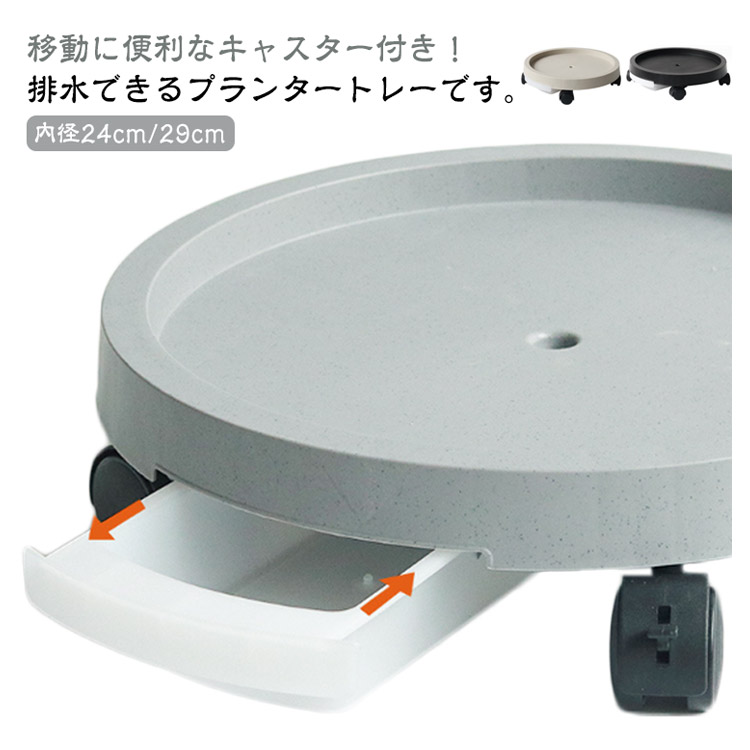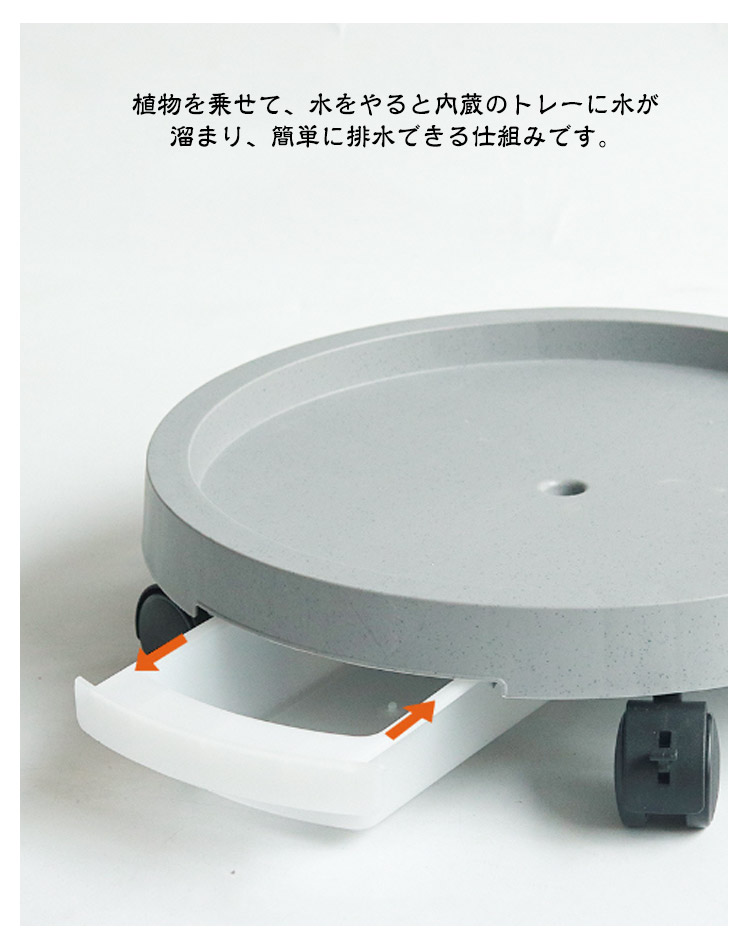 | 移動に便利なキャスター付き!排水できるプランタートレーです。 植物を乗せて、水をやると内蔵のトレーに水が溜まり、簡単に排水できる仕組みです。 鉢受皿のように排水が貯まらないので、植物の根腐れを軽減できます。 鉢植えをスムーズに移動可能なキャスター付き植木鉢置き。 鉢植えの世話を邪魔しないシンプルなフォルムに馴染みのいいシンプルなデザイン。 | |