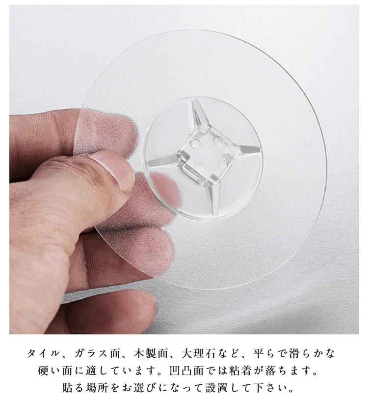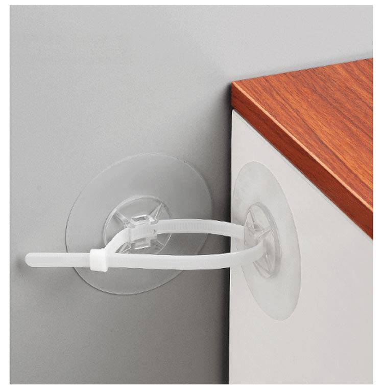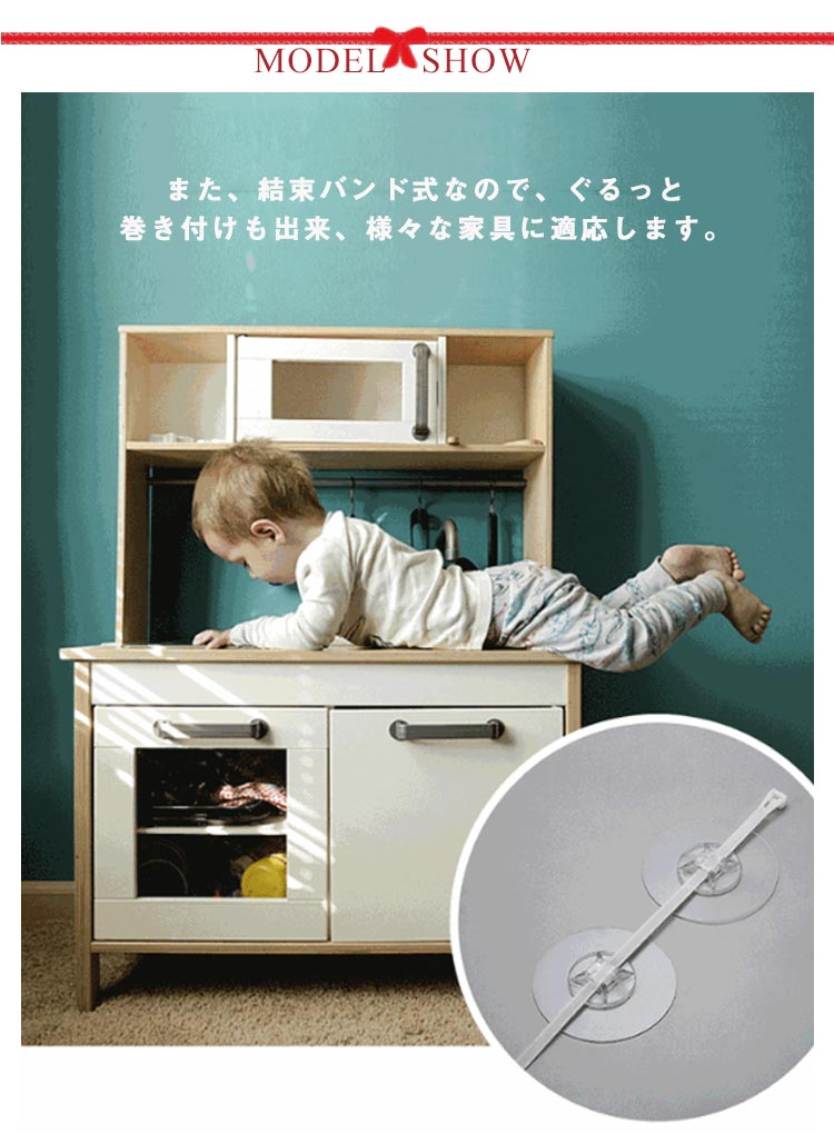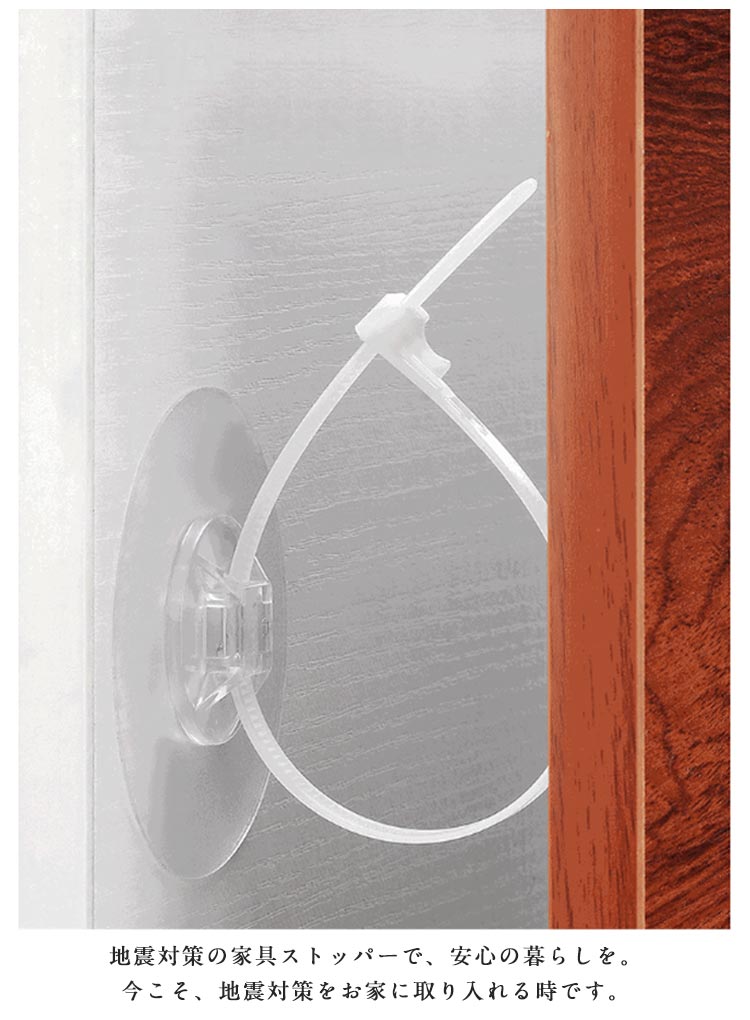 結束バンド式の転倒防止粘着パッド。粘着テープ式で、壁に穴を開ける必要がありません。 また、結束バンド式なので、ぐるっと巻き付けも出来、様々な家具に適応します。地震対策の家具ストッパーで、安心の暮らしを。今こそ、地震対策をお家に取り入れる時です。結束バンドは、通し穴サイズ内であれば他の物も使用可能です。タイル、ガラス面、木製面、大理石など、平らで滑らかな硬い面に適しています。凹凸面では粘着が落ちます。貼る場所をお選びになって設置して下さい。強力粘着テープの為、貼った物を剥がす際に壁紙が剥がれる場合があります。貼る場所の選択、ゆっくり丁寧に剥がすなど注意して下さい。