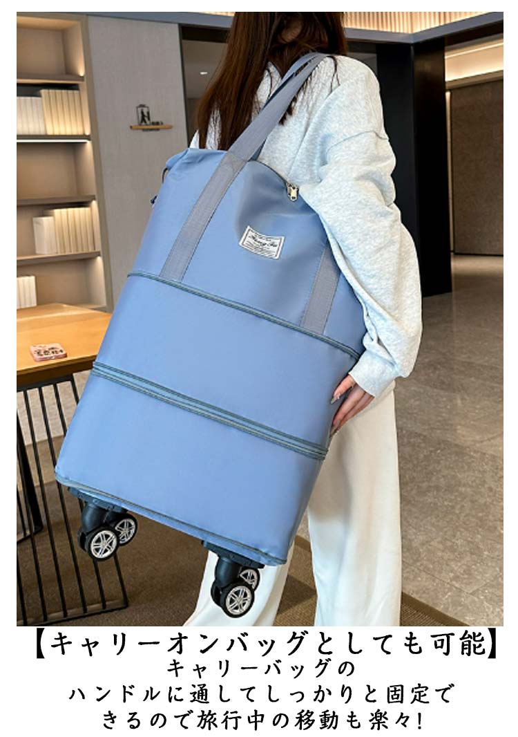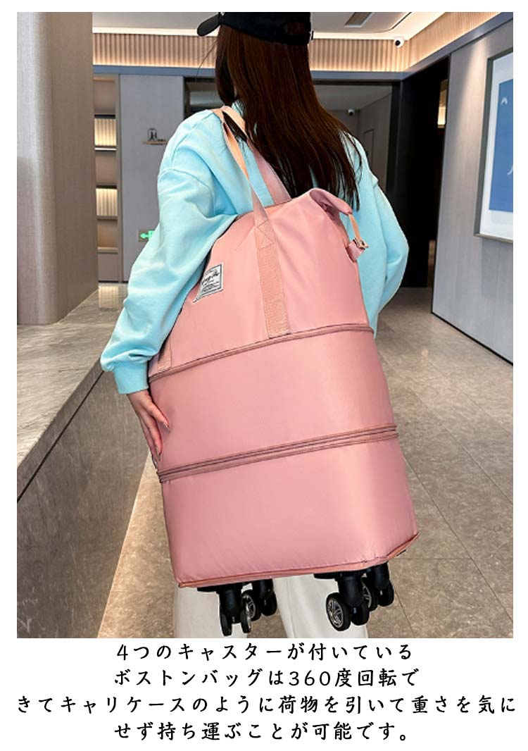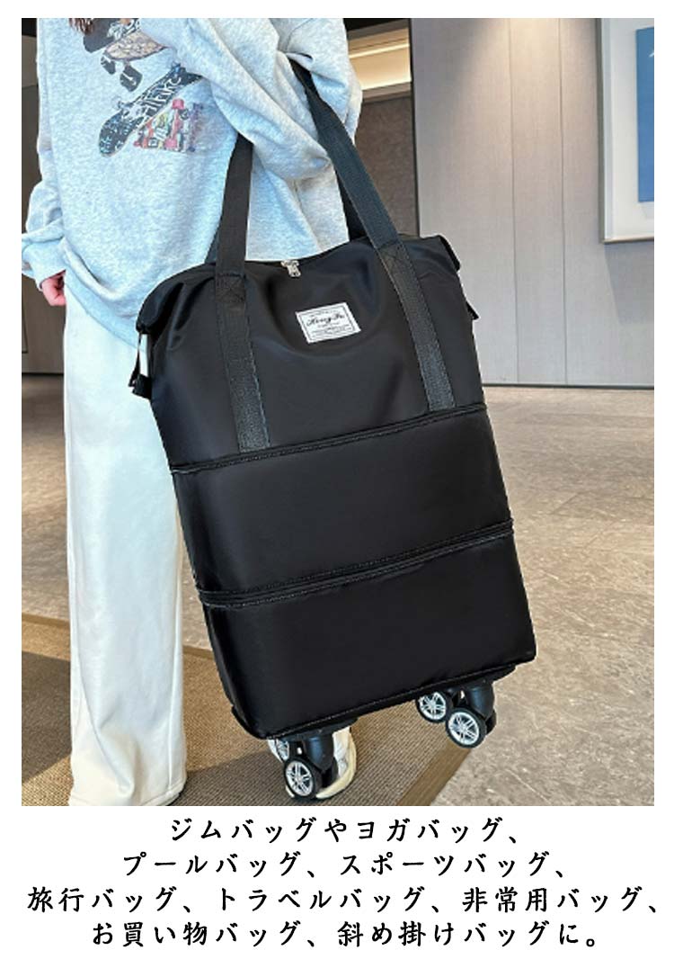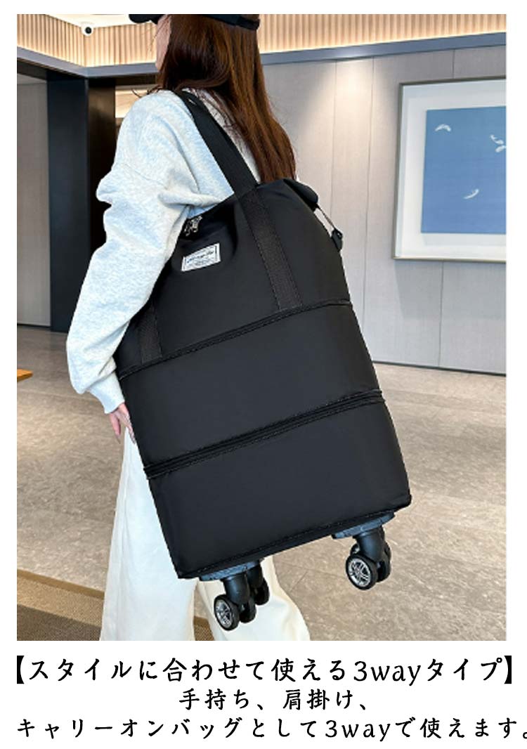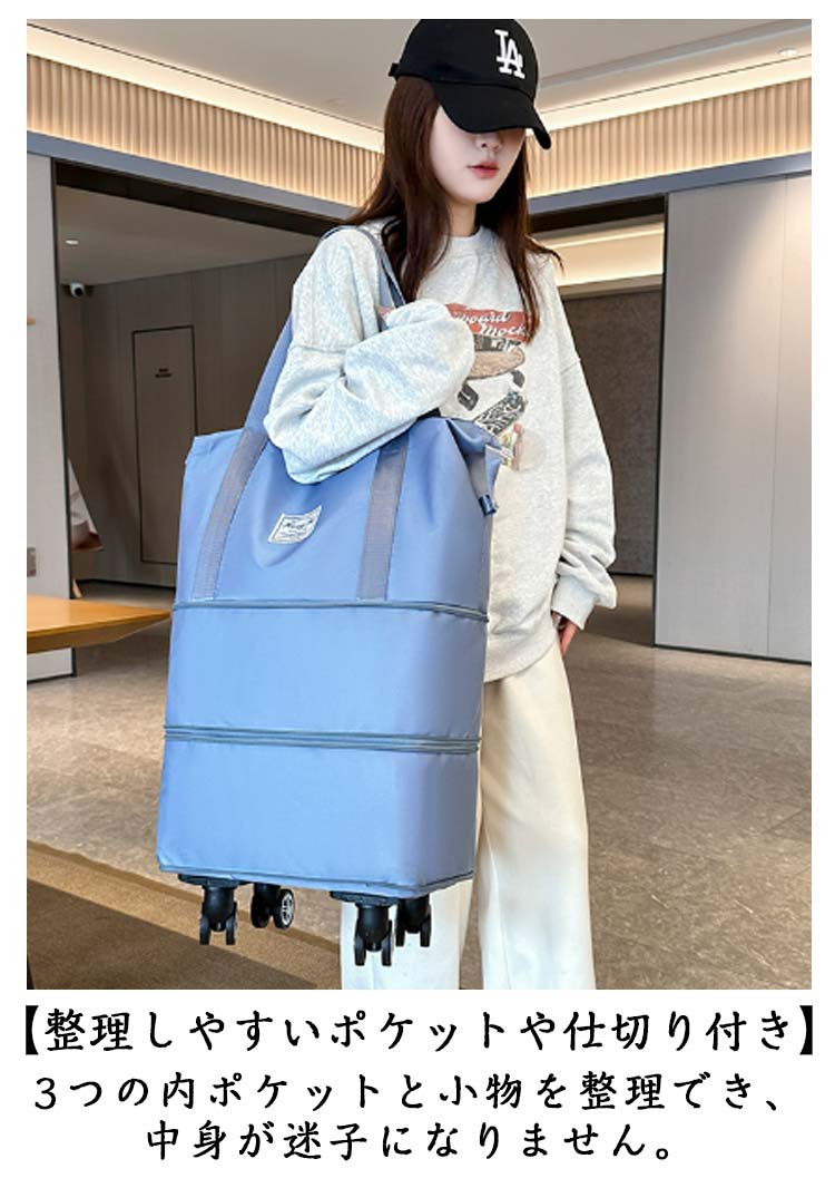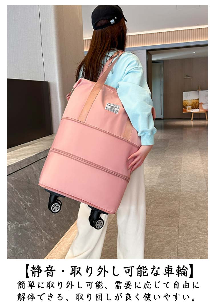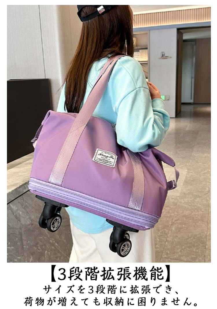 3way/3段階拡張機能/4泊以上!機内持ち込み 大容量!【3段階拡張機能】コンパクトサイズにたためる便利な設計が魅力。サイズを3段階に拡張でき、荷物が増えても収納に困りません。底の方は広がり、ショップ・旅行途中などでまとめて買いした時でも楽に収納できる♪短期の旅行や出張、ジム用のスポーツバッグにもおすすめ!【静音・取り外し可能な車輪】4つのキャスターが付いているボストンバッグは360度回転できてキャリケースのように荷物を引いて重さを気にせず持ち運ぶことが可能です。長距離移動もスムーズにできます。简単に取り外し可能、需要に応じて自由に解体できる、取り回しが良く使いやすい。【キャリーオンバッグとしても可能】キャリーバッグのハンドルに通してしっかりと固定できるので旅行中の移動も楽々!背面ポケットはファスナ付きで、スマホや財布などの小物が収納できます。急いでいる時にも取り出しやすくて便利です。幅が広い持ち手で重たい荷物を入れても安心!【撥水加エ・傷に強い】耐久性が高く、撥水効果のあるオックスフォード生地を採用しているので急な雨でも安心。上品な光沢があり、傷もつきにくく、シワもできにくい。汚れた場合は水で手洗いが可能です。【整理しやすいポケットや仕切り付き】3つの内ポケットと小物を整理でき、中身が迷子になりません。乾湿分離ポケット:濡れた衣類、タオルなどわさわざピニール袋に入れなくても収納出来ます。バッグのサイドにスナップボタンが付いているので、バッグの形を簡単に調整できます。【スタイルに合わせて使える3wayタイプ】手持ち、肩掛け、キャリーオンバッグとして3wayで使えます。ジムバッグやヨガバッグ、プールバッグ、スポーツバッグ、旅行バッグ、トラベルバッグ、非常用バッグ、お買い物バッグ、斜め掛けバッグに。スポーツ、アウトドア、旅行などの用途から普段使いまで、あらゆる場面でご使用いただけます。