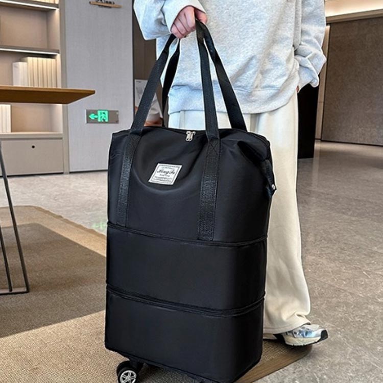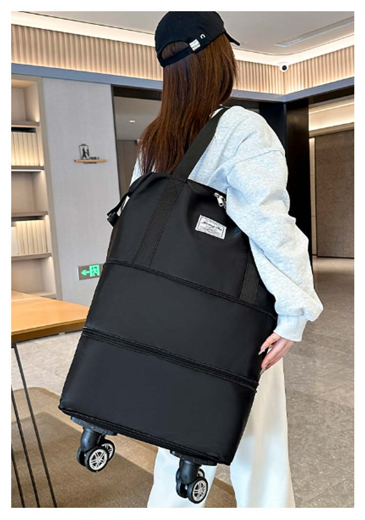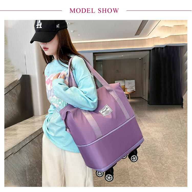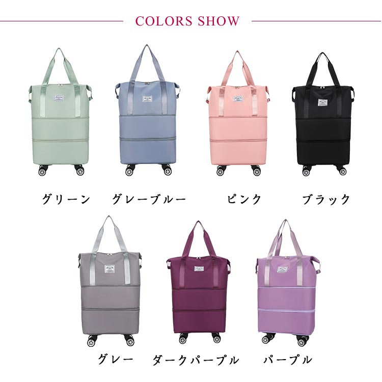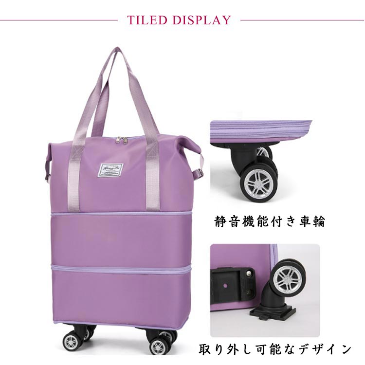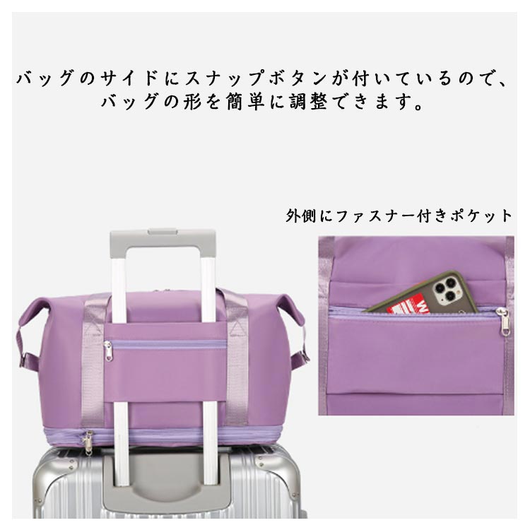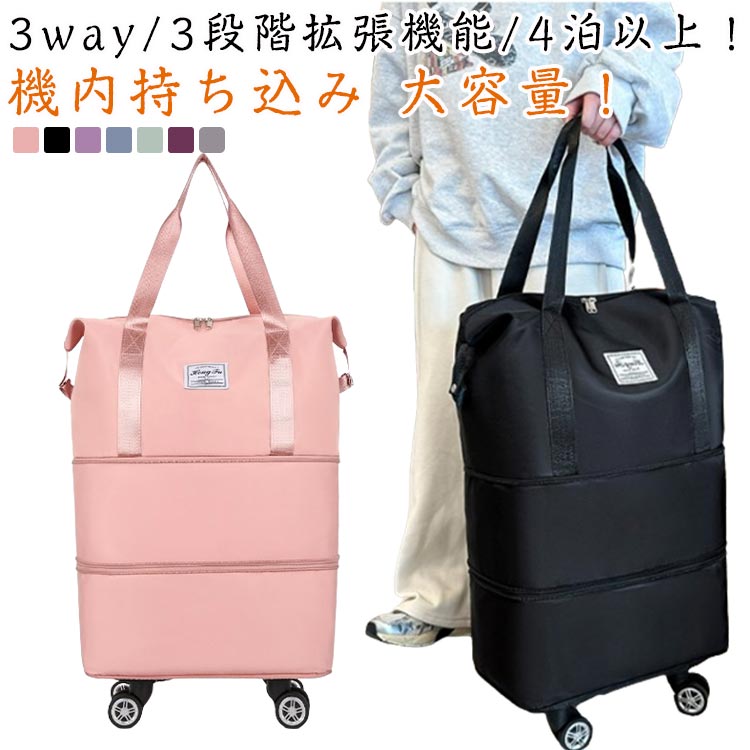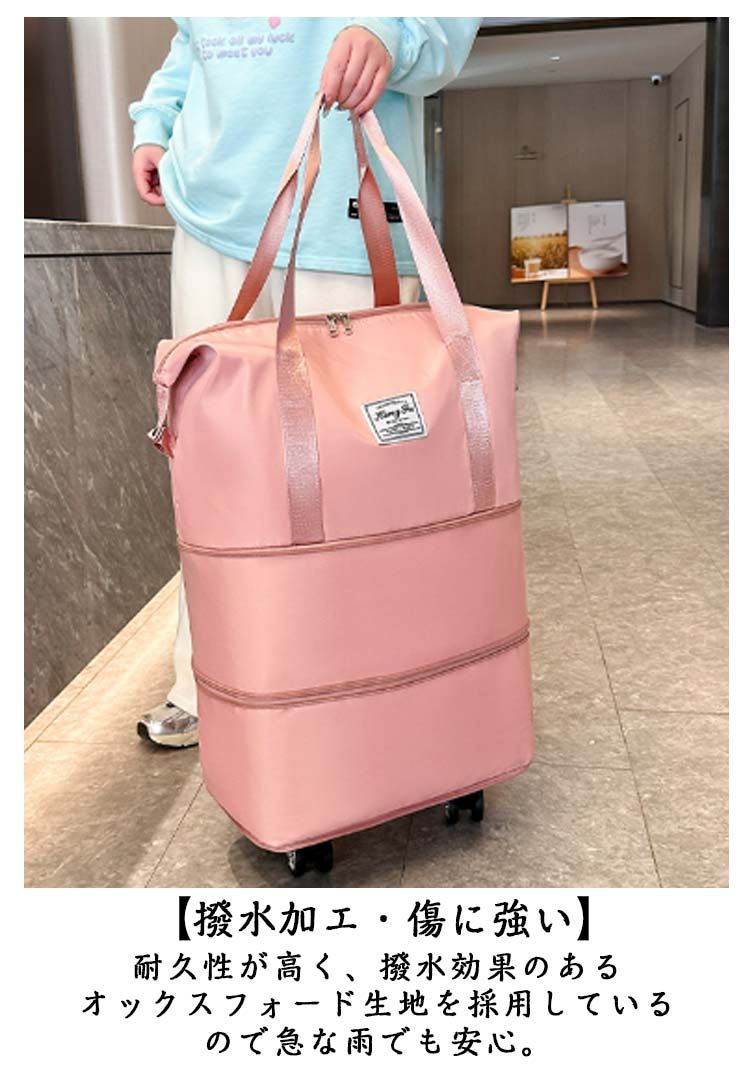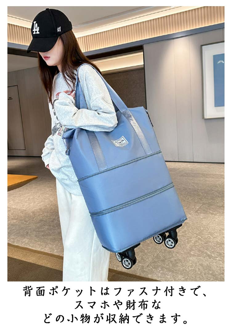 3way/3段階拡張機能/4泊以上!機内持ち込み 大容量!【3段階拡張機能】コンパクトサイズにたためる便利な設計が魅力。サイズを3段階に拡張でき、荷物が増えても収納に困りません。底の方は広がり、ショップ・旅行途中などでまとめて買いした時でも楽に収納できる♪短期の旅行や出張、ジム用のスポーツバッグにもおすすめ!【静音・取り外し可能な車輪】4つのキャスターが付いているボストンバッグは360度回転できてキャリケースのように荷物を引いて重さを気にせず持ち運ぶことが可能です。長距離移動もスムーズにできます。简単に取り外し可能、需要に応じて自由に解体できる、取り回しが良く使いやすい。【キャリーオンバッグとしても可能】キャリーバッグのハンドルに通してしっかりと固定できるので旅行中の移動も楽々!背面ポケットはファスナ付きで、スマホや財布などの小物が収納できます。急いでいる時にも取り出しやすくて便利です。幅が広い持ち手で重たい荷物を入れても安心!【撥水加エ・傷に強い】耐久性が高く、撥水効果のあるオックスフォード生地を採用しているので急な雨でも安心。上品な光沢があり、傷もつきにくく、シワもできにくい。汚れた場合は水で手洗いが可能です。【整理しやすいポケットや仕切り付き】3つの内ポケットと小物を整理でき、中身が迷子になりません。乾湿分離ポケット:濡れた衣類、タオルなどわさわざピニール袋に入れなくても収納出来ます。バッグのサイドにスナップボタンが付いているので、バッグの形を簡単に調整できます。【スタイルに合わせて使える3wayタイプ】手持ち、肩掛け、キャリーオンバッグとして3wayで使えます。ジムバッグやヨガバッグ、プールバッグ、スポーツバッグ、旅行バッグ、トラベルバッグ、非常用バッグ、お買い物バッグ、斜め掛けバッグに。スポーツ、アウトドア、旅行などの用途から普段使いまで、あらゆる場面でご使用いただけます。