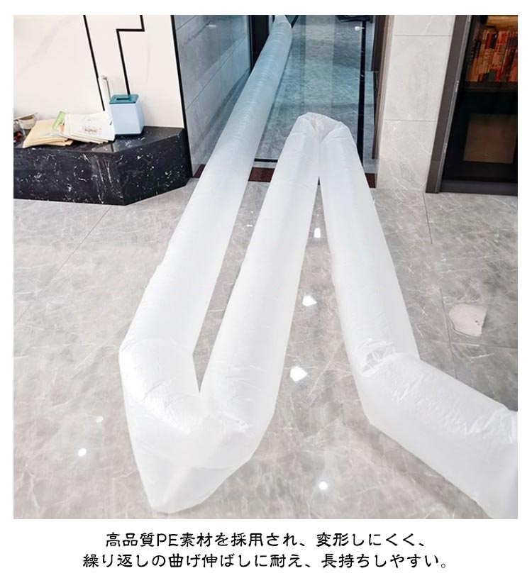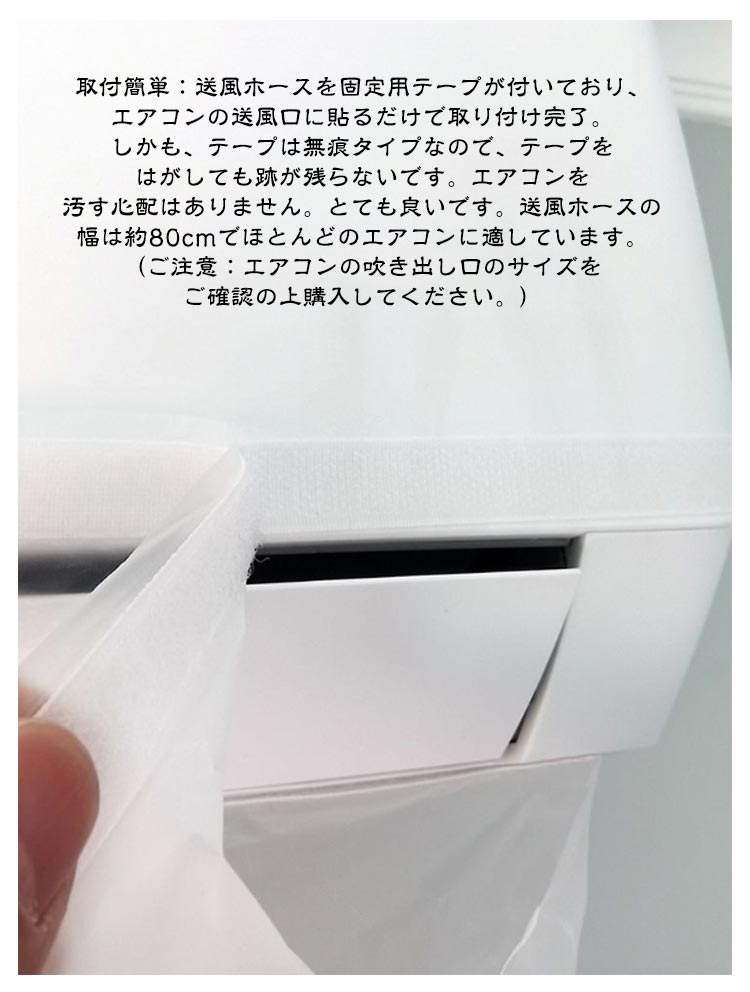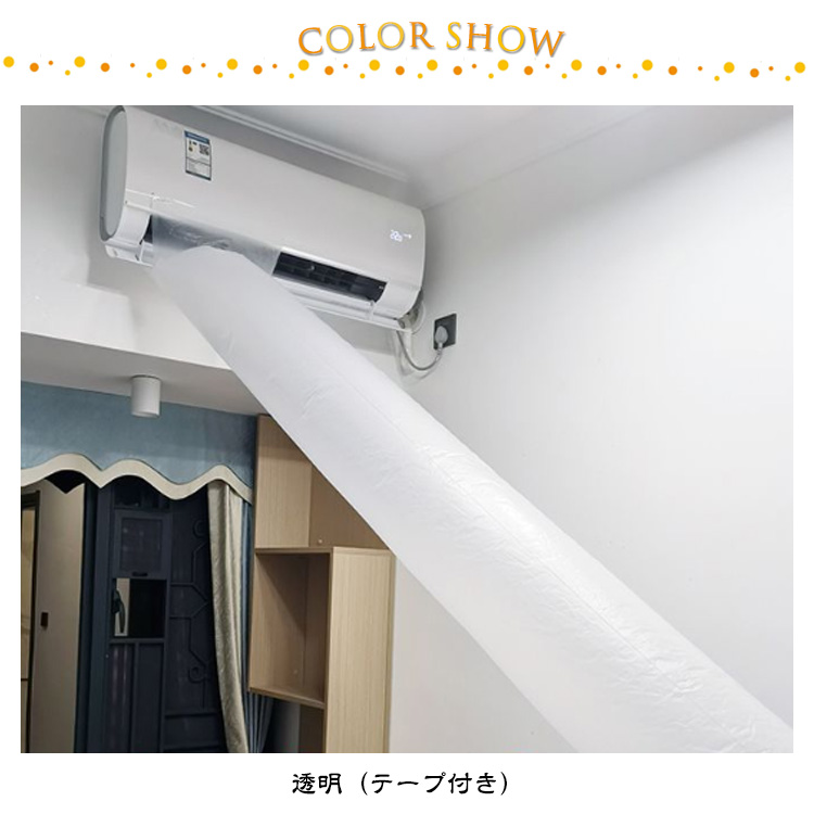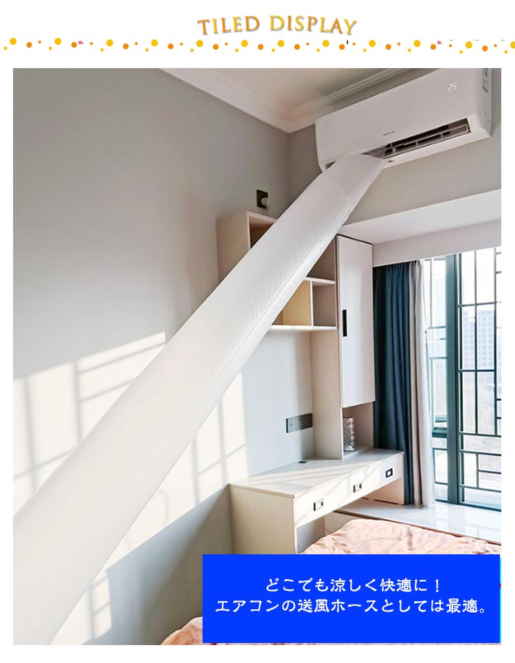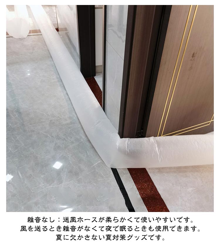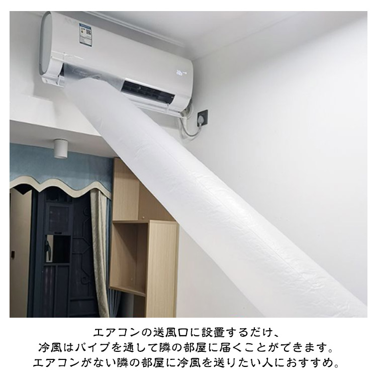 送風ホースの長さは37mですので、隣の部屋に届くことができます。どこでも涼しく快適に!エアコンの送風ホースとしては最適。エアコンの送風口に設置するだけ、冷風はパイプを通して隣の部屋に届くことができます。エアコンがない隣の部屋に冷風を送りたい人におすすめ。高品質PE素材を採用され、変形しにくく、繰り返しの曲げ伸ばしに耐え、長持ちしやすい。取付簡単:送風ホースを固定用テープが付いており、エアコンの送風口に貼るだけで取り付け完了。しかも、テープは無痕タイプなので、テープをはがしても跡が残らないです。エアコンを汚す心配はありません。とても良いです。送風ホースの幅は約80cmでほとんどのエアコンに適しています。(ご注意:エアコンの吹き出し口のサイズをご確認の上購入してください。)雑音なし:送風ホースが柔らかくて使いやすいです。風を送るとき雑音がなくて夜で眠るときも使用できます。夏に欠かさない夏対策グッズです。
