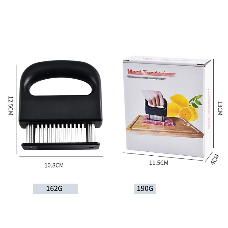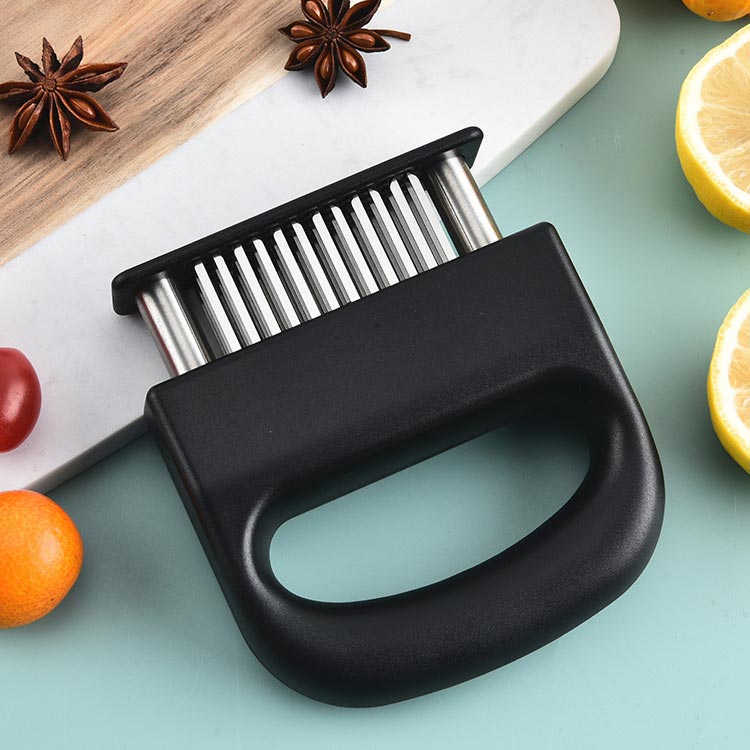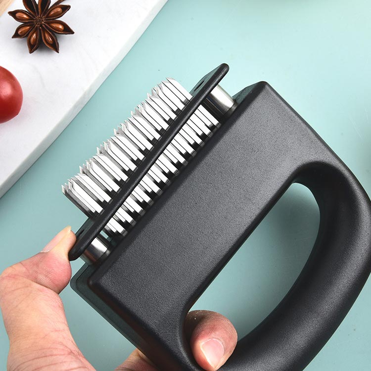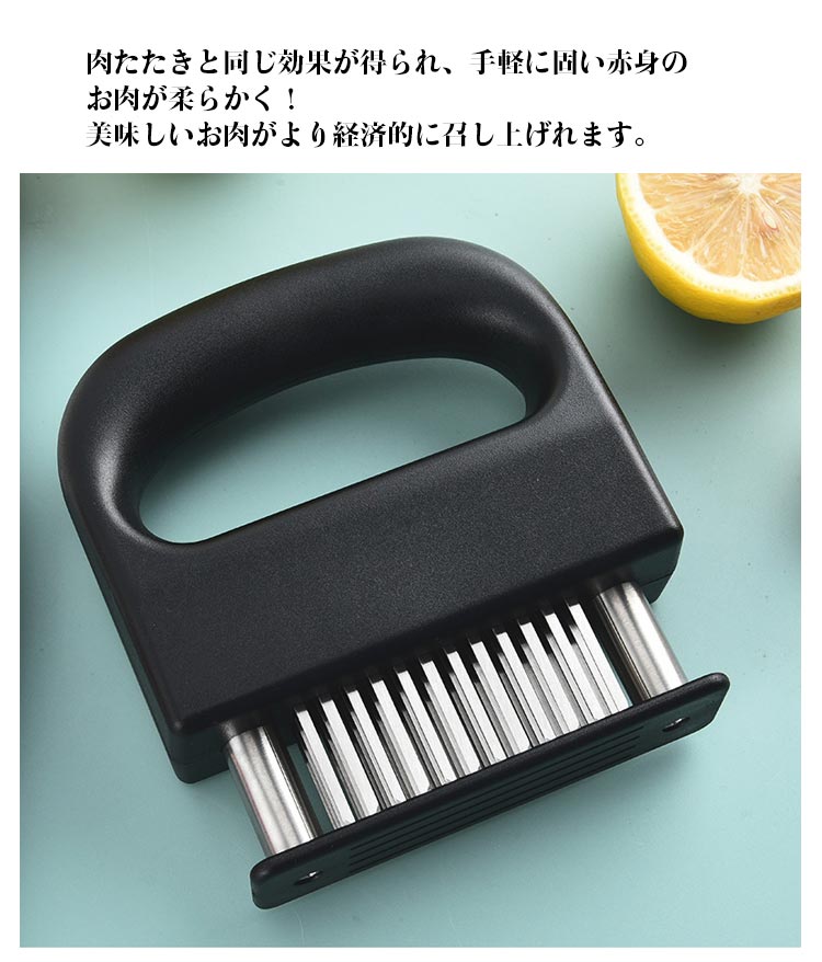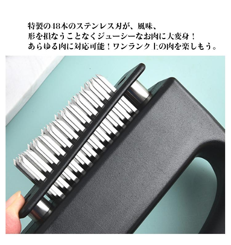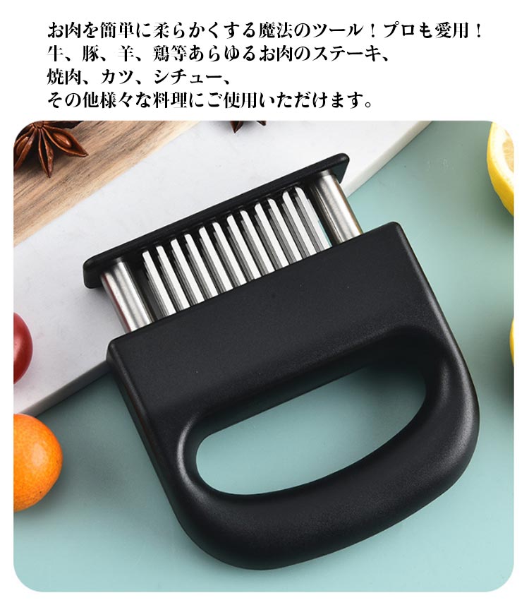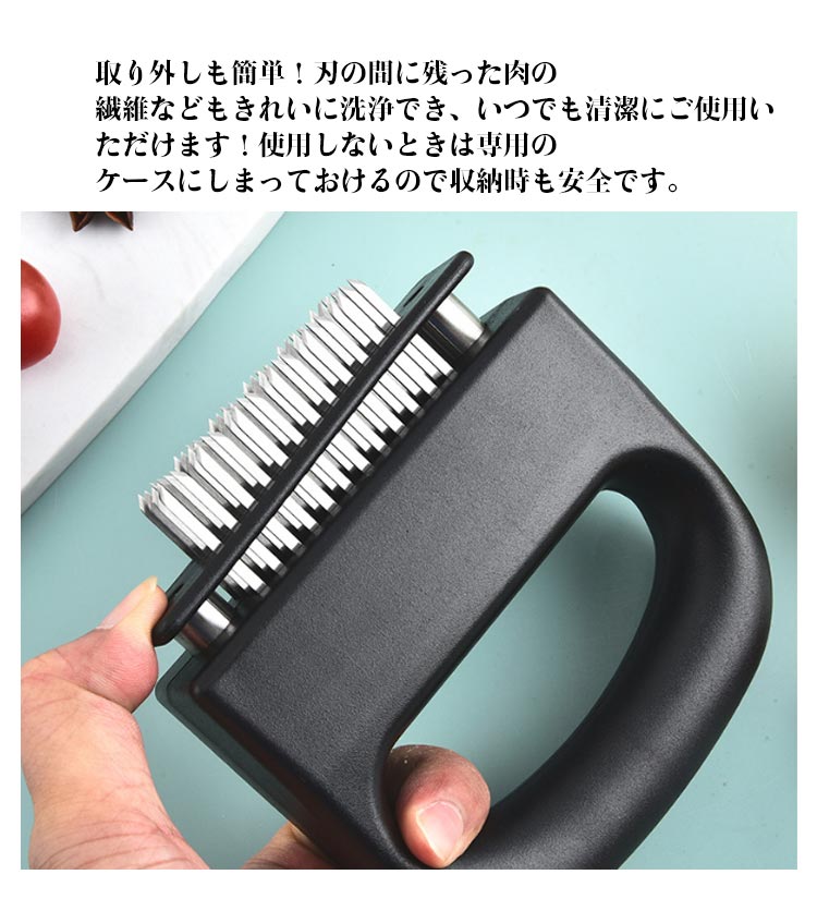 お店の味をご家庭で味わえる家庭の台所、ホテル、レストランなどに最適です。お肉を簡単に柔らかくする魔法のツール!プロも愛用!牛、豚、羊、鶏等あらゆるお肉のステーキ、焼肉、カツ、シチュー、その他様々な料理にご使用いただけます。肉たたきと同じ効果が得られ、手軽に固い赤身のお肉が柔らかく! 美味しいお肉がより経済的に召し上げれます。特製の48本のステンレス刃が、風味、形を損なうことなくジューシーなお肉に大変身! あらゆる肉に対応可能!ワンランク上の肉を楽しもう。筋切り器を使用することで肉の内部も細かく切れているので、調味料などが染み込みやすくなったり、調理時間が短縮します。片手で扱いやすいサイズで片手で使いやすく、グリップタイプなので、しっかりと握ることができるので扱いやすく便利です。取り外しも簡単!刃の間に残った肉の繊維などもきれいに洗浄でき、いつでも清潔にご使用いただけます!使用しないときは専用のケースにしまっておけるので収納時も安全です。