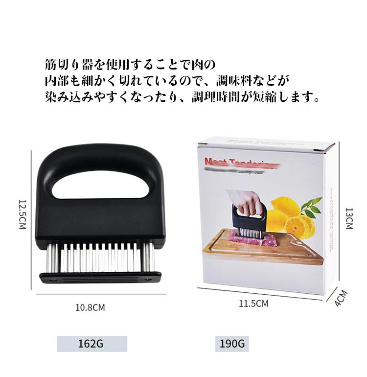 | お店の味をご家庭で味わえる 家庭の台所、ホテル、レストランなどに最適です。 お肉を簡単に柔らかくする魔法のツール!プロも愛用! 牛、豚、羊、鶏等あらゆるお肉のステーキ、焼肉、カツ、シチュー、その他様々な料理にご使用いただけます。 肉たたきと同じ効果が得られ、手軽に固い赤身のお肉が柔らかく! 美味しいお肉がより経済的に召し上げれます。 特製の48本のステンレス刃が、風味、形を損なうことなくジューシーなお肉に大変身! あらゆる肉に対応可能!ワンランク上の肉を楽しもう。 筋切り器を使用することで肉の内部も細かく切れているので、調味料などが染み込みやすくなったり、調理時間が短縮します。 片手で扱いやすいサイズで片手で使いやすく、グリップタイプなので、しっかりと握ることができるので扱いやすく便利です。 取り外しも簡単!刃の間に残った肉の繊維などもきれいに洗浄でき、いつでも清潔にご使用いただけます!使用しないときは専用のケースにしまっておけるので収納時も安全です。 | |