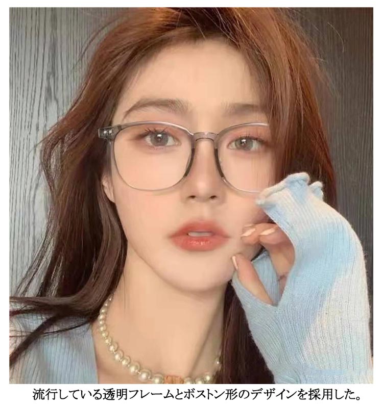 度なし/度付きブルーライトカットメガネ。パソコンやスマホなどのデジタルデバイスから発生するブルーライトをカットできます。日常生活において、ブルーライト軽減のpcメガネとして利用できます。超軽量素材を採用して長時間使ってもストレスなし、疲れにくいです。流行している透明フレームとボストン形のデザインを採用した。