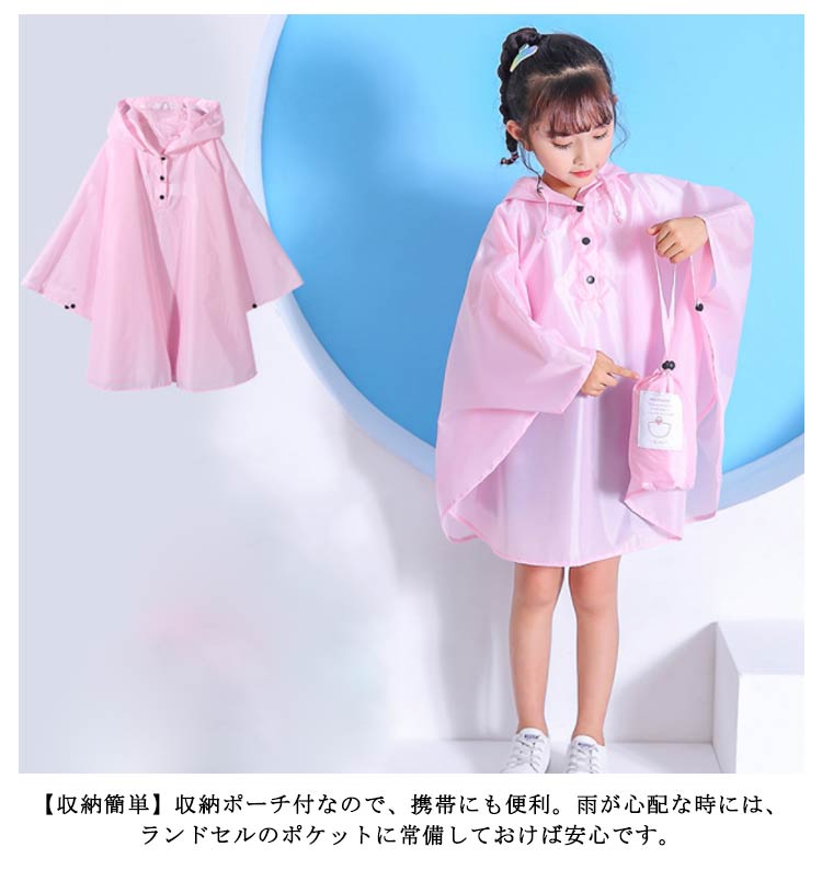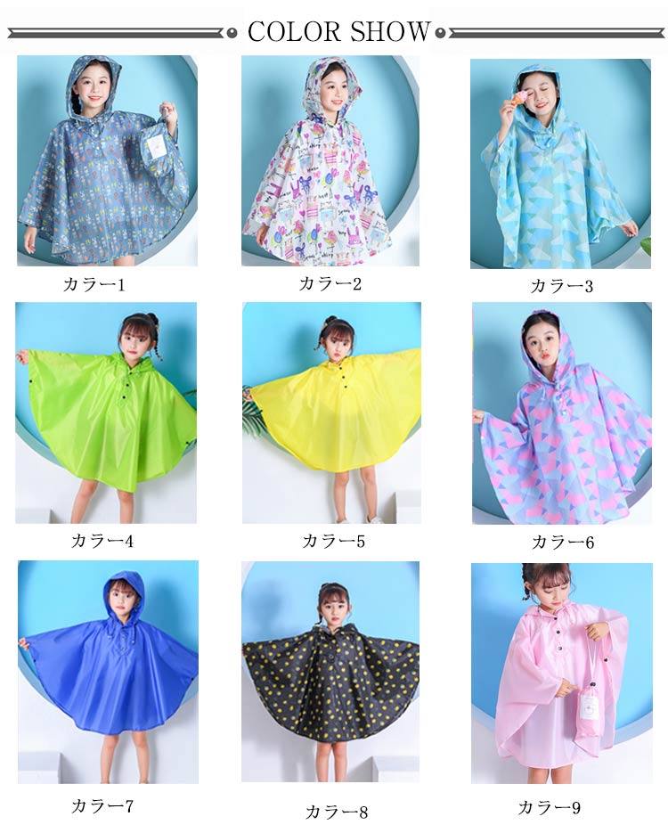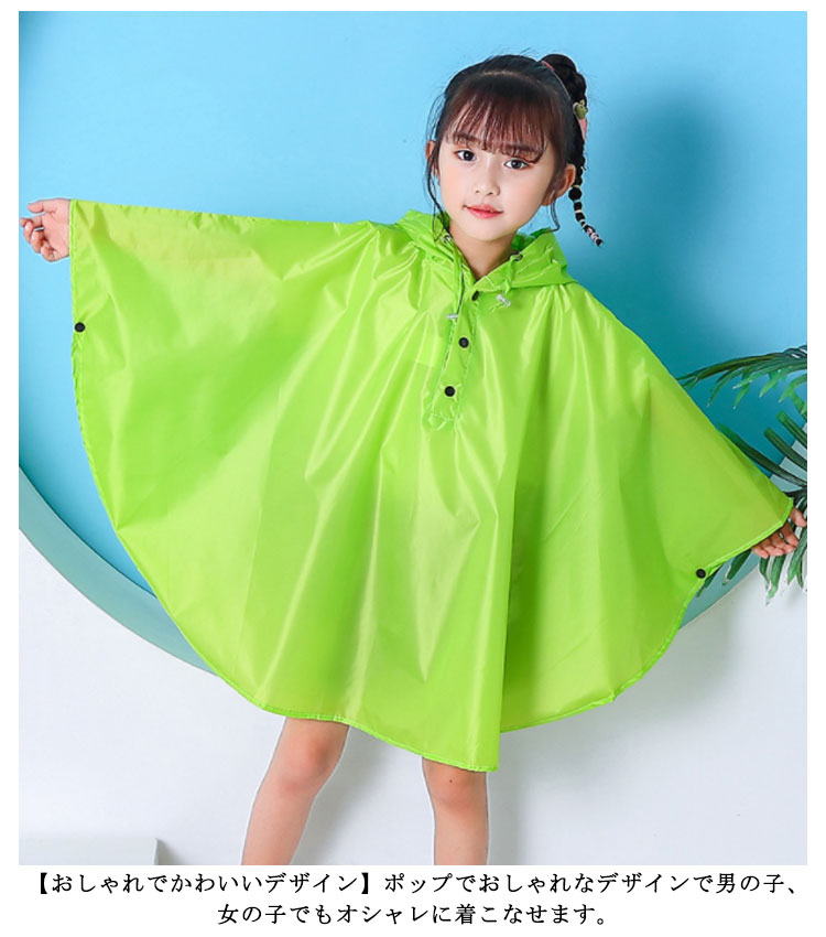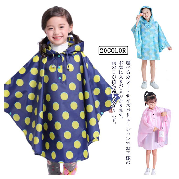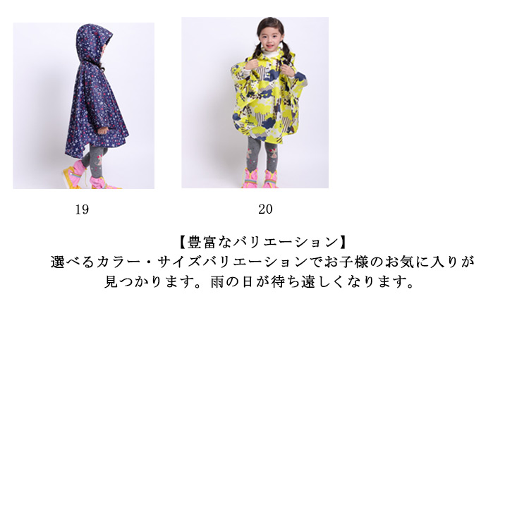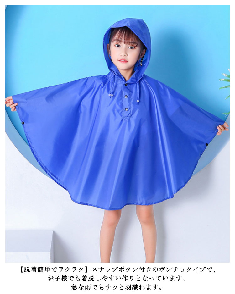 【豊富なバリエーション】選べるカラー・サイズバリエーションでお子様のお気に入りが見つかります。雨の日が待ち遠しくなります。【おしゃれでかわいいデザイン】ポップでおしゃれなデザインで男の子、女の子でもオシャレに着こなせます。【脱着簡単でラクラク】スナップボタン付きのポンチョタイプで、お子様でも着脱しやすい作りとなっています。急な雨でもサッと羽織れます。【収納簡単】収納ポーチ付なので、携帯にも便利。雨が心配な時には、ランドセルのポケットに常備しておけば安心です。
