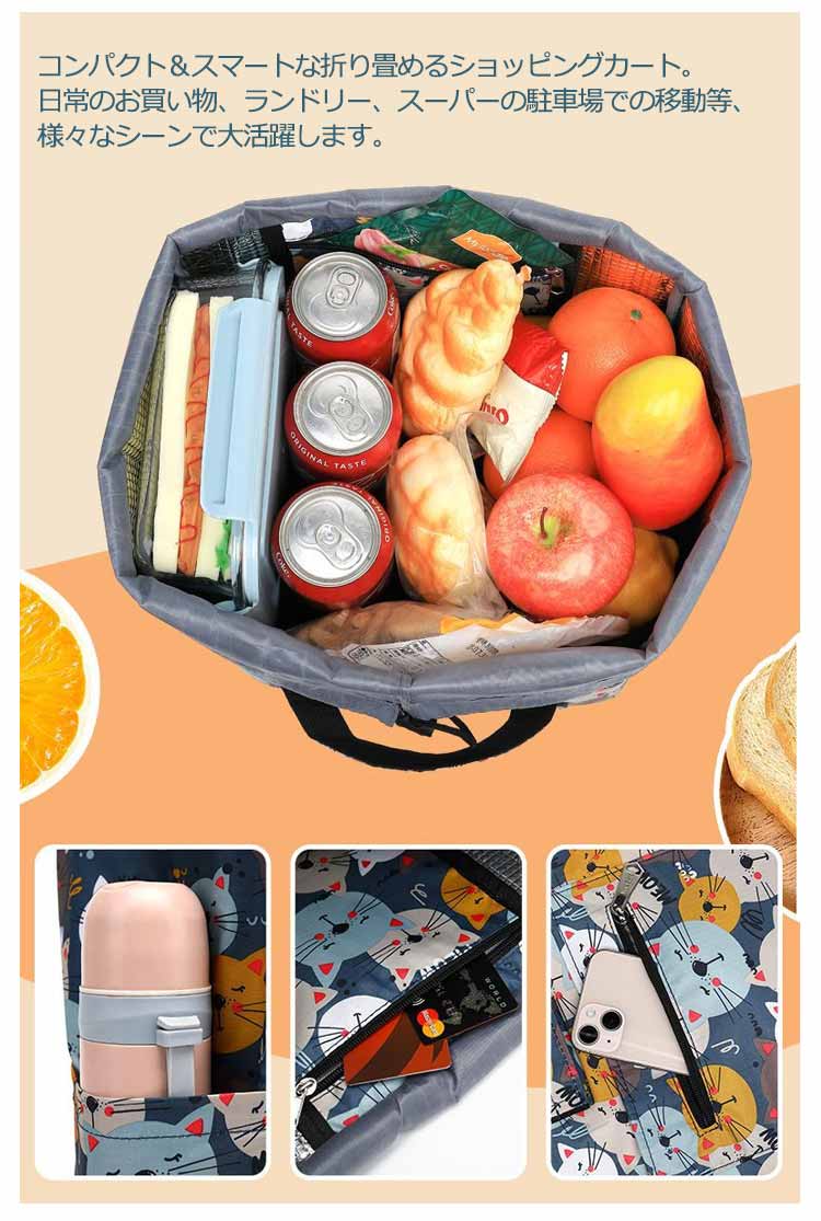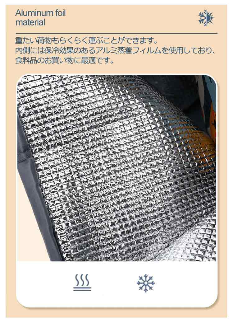 | お買い物に便利なショッピングカートです。【30L】【保冷·保温機能付き】【4輪·横押し可能】 重たい荷物もらくらく運ぶことができます。内側には保冷効果のあるアルミ蒸着フィルムを使用しており、食料品のお買い物に最適です。 撥水加工をしておりますので急な雨でも安心。 容量30Lでしっかり入り自立型で物の出し入れもしやすい。収納部の巾着部分が大きく、収納量はたっぷり コンパクト&スマートな折り畳めるショッピングカート。日常のお買い物、ランドリー、スーパーの駐車場での移動等、様々なシーンで大活躍します。 | |