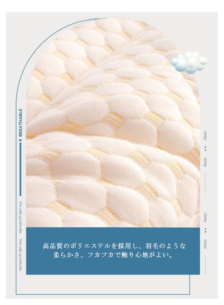 頭全体を優しくサポートでき、爽やかな睡眠環境を与えられ、気持ちよく眠れます。高品質のポリエステルを採用し、羽毛のような柔らかさ、フカフカで触り心地がよい。カバーにはお肌に優しい素材を採用し、柔らかくて手触り良い、通気性に良い。ストレス解消しながら呼吸をスムーズさせ、イビキ軽減などの効果も期待できます。変形しにくく、家庭用洗濯機で丸洗いができ、いつも清潔保つ。