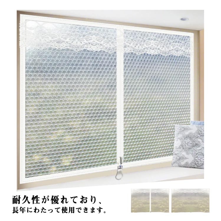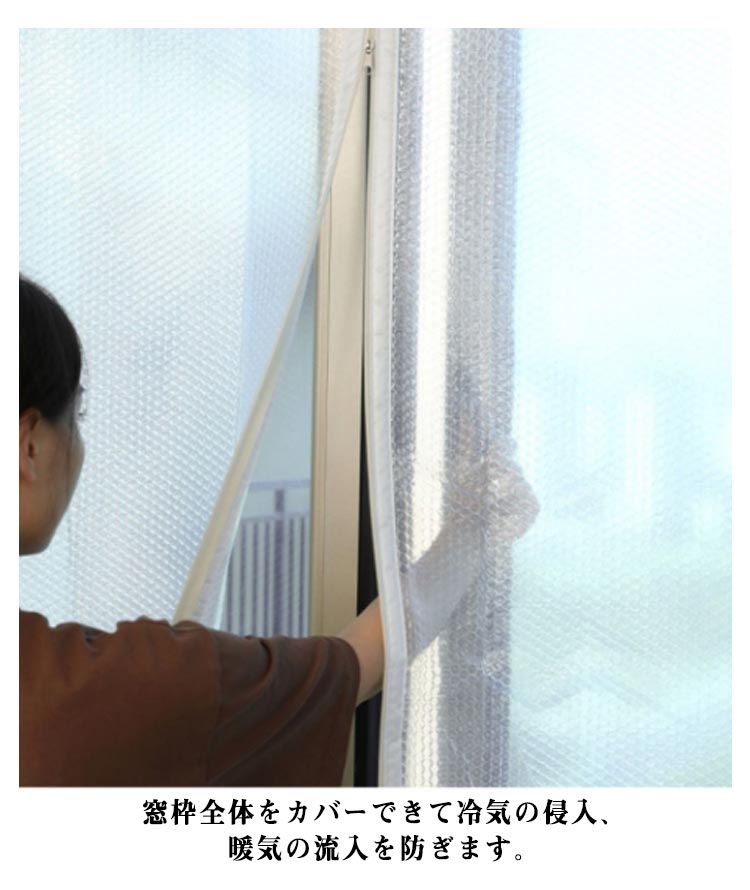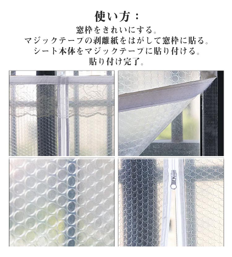 耐久性が優れており、長年にわたって使用できます。窓ガラスの断熱効果をアップ!夏は涼しく、冬は暖かく快適に。ガラスの表面温度低下を抑え、結露の発生を抑制します。窓枠全体をカバーできて冷気の侵入、暖気の流入を防ぎます。窓枠に貼るだけ!冷気を防ぐ断熱カーテンです。使い方:窓枠をきれいにする。マジックテープの剥離紙をはがして窓枠に貼る。シート本体をマジックテープに貼り付ける。貼り付け完了。