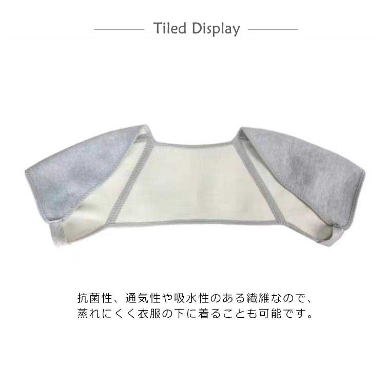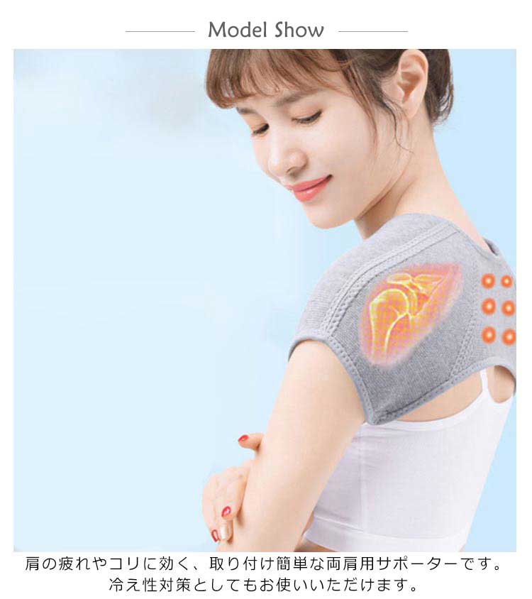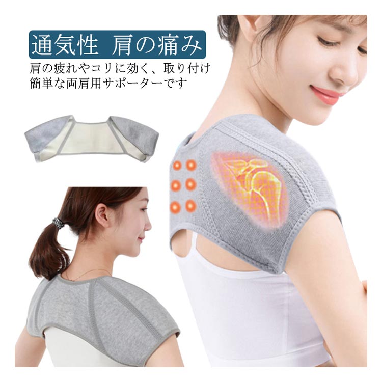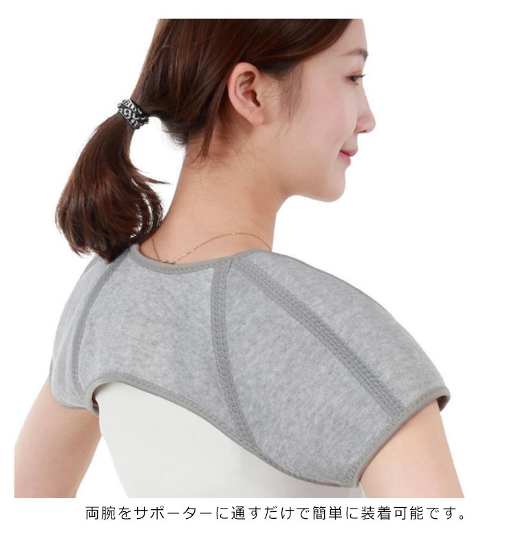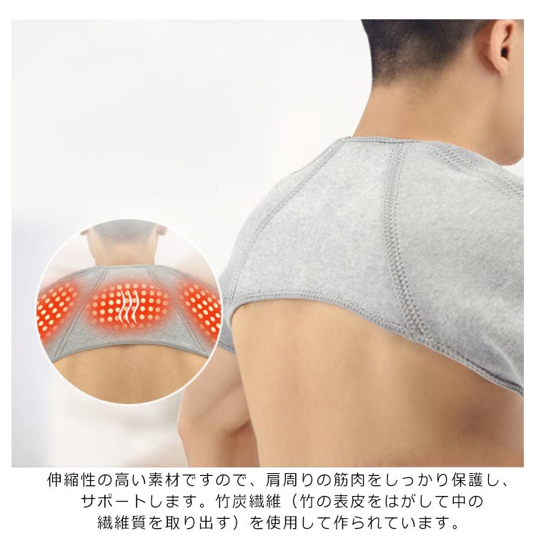 | 肩の疲れやコリに効く、取り付け簡単な両肩用サポーターです 肩の疲れやコリに効く、取り付け簡単な両肩用サポーターです。対策としてもお使いいただけます。 両腕をサポーターに通すだけで簡単に装着可能です。伸縮性の高い素材ですので、肩周りの筋肉をしっかり保護し、サポートします。竹炭繊維(竹の表皮をはがして中の繊維質を取り出す)を使用して作られています。抗菌性、通気性や吸水性のある繊維なので、蒸れにくく衣服の下に着ることも可能です。 | |