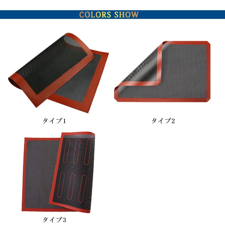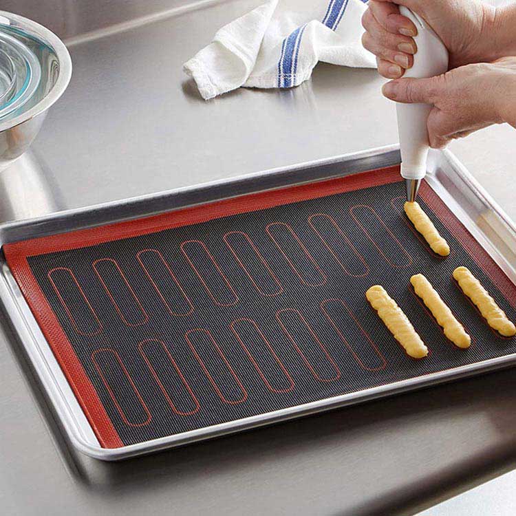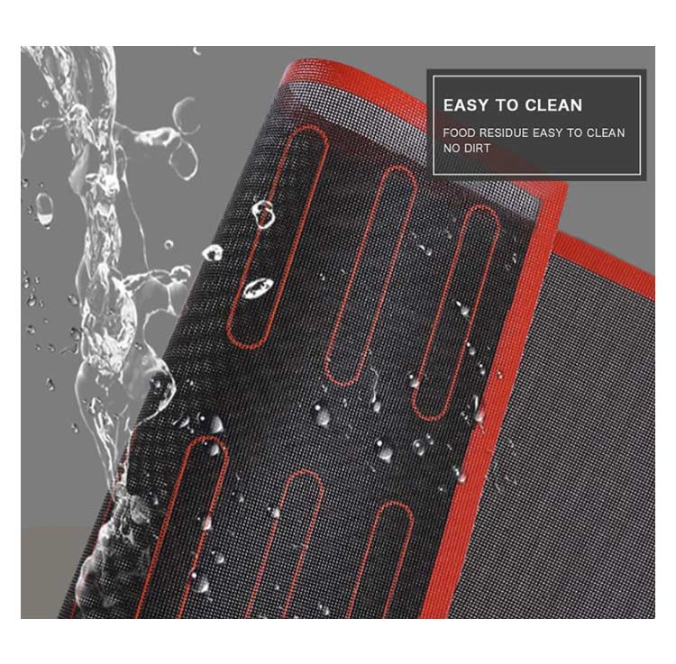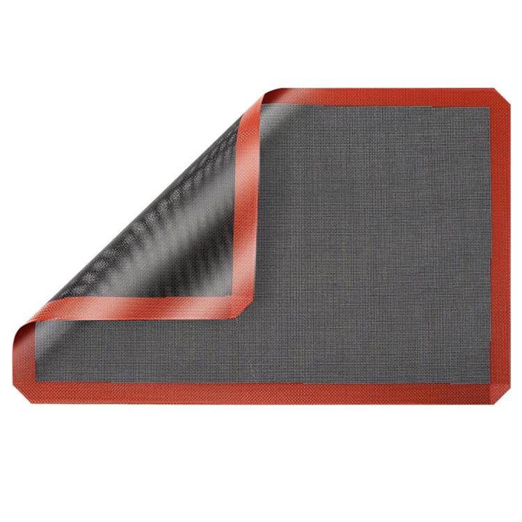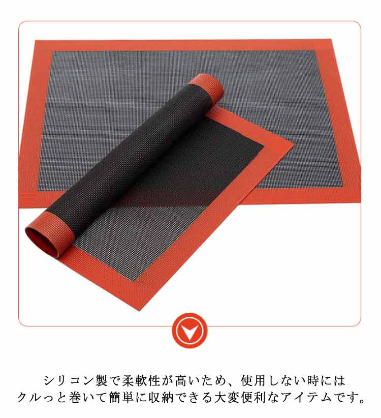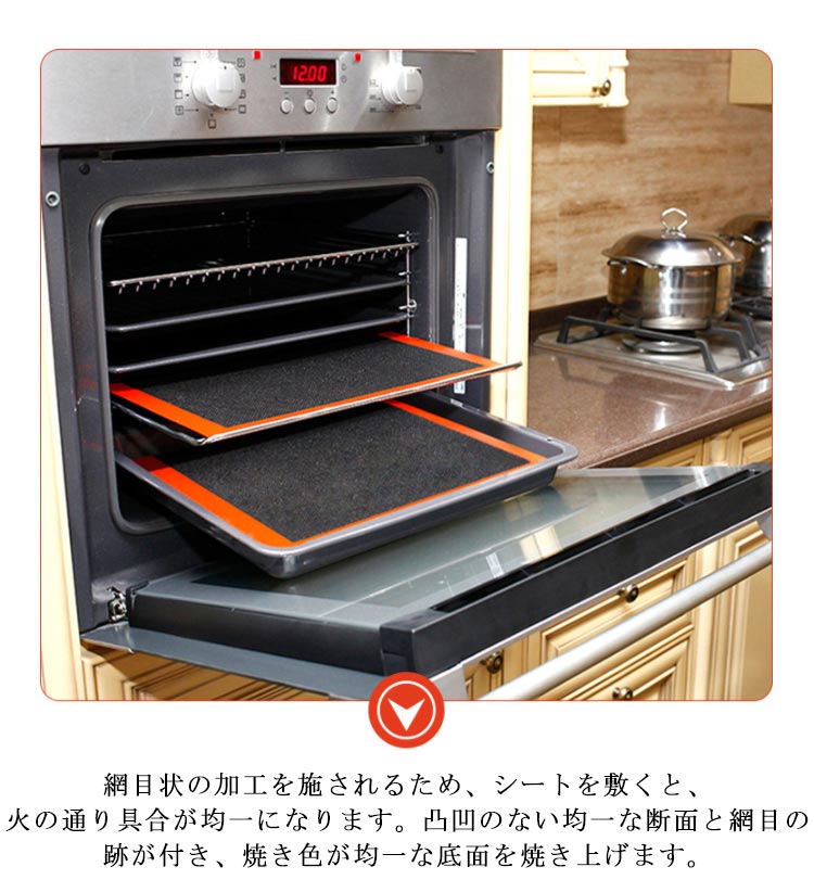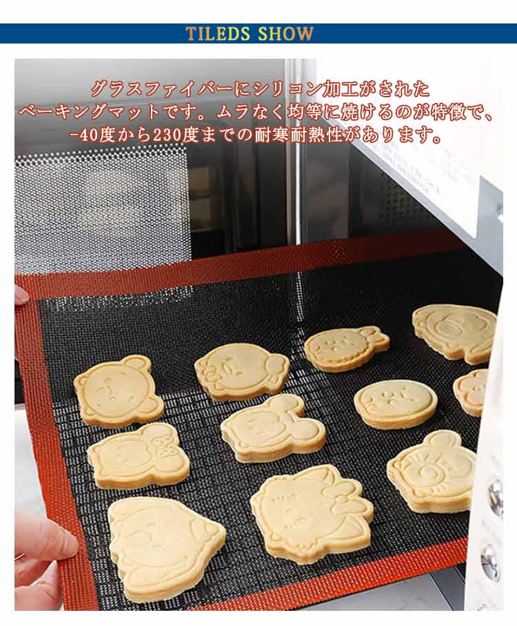 【ベーキングシート】【耐熱性】【繰り返し使える】【40×30cm】グラスファイバーにシリコン加工がされたベーキングマットです。ムラなく均等に焼けるのが特徴で、-40度から230度までの耐寒耐熱性があります。耐久性も抜群で半永久的にご使用いただけます。オーブンペーパーよりも経済的です!網目状の加工を施されるため、シートを敷くと、火の通り具合が均一になります。凸凹のない均一な断面と網目の跡が付き、焼き色が均一な底面を焼き上げます。網目状の加工により、余分な油脂や水分が抜けサクサクに焼けると同時に生地が浮くことなく、滑らかな焼き上がりになります。より健康、より美味しいクッキーが楽しめます。表面が滑らかなゴム素材で出来ているため、焼く前に天板やパットに油を塗らなくても綺麗にお菓子を焼き上げることができます。焼き上がり後にも生地がパットに付きにくく、天板の油汚れも少なくなるため、天板もパットも水で簡単に洗うことができます。シリコン製で柔軟性が高いため、使用しない時にはクルっと巻いて簡単に収納できる大変便利なアイテムです。お菓子を焼くことができるだけでなく、また鶏肉や魚のオーブン焼きマットとしても活躍します。