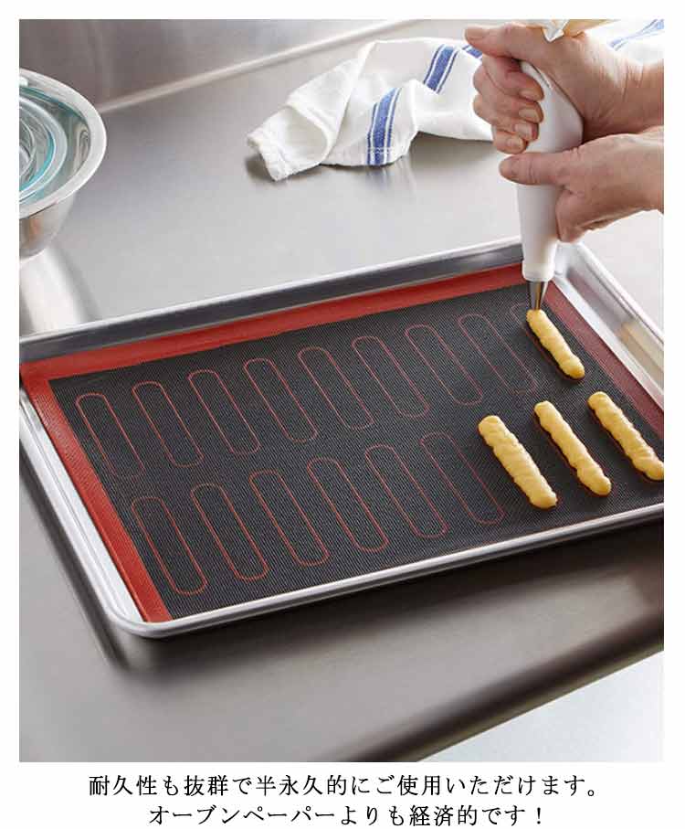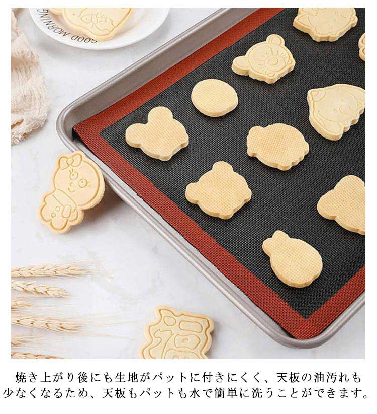 | 【ベーキングシート】【耐熱性】【繰り返し使える】【40×30cm】 グラスファイバーにシリコン加工がされたベーキングマットです。ムラなく均等に焼けるのが特徴で、-40度から230度までの耐寒耐熱性があります。 耐久性も抜群で半永久的にご使用いただけます。オーブンペーパーよりも経済的です! 網目状の加工を施されるため、シートを敷くと、火の通り具合が均一になります。凸凹のない均一な断面と網目の跡が付き、焼き色が均一な底面を焼き上げます。 網目状の加工により、余分な油脂や水分が抜けサクサクに焼けると同時に生地が浮くことなく、滑らかな焼き上がりになります。より健康、より美味しいクッキーが楽しめます。 表面が滑らかなゴム素材で出来ているため、焼く前に天板やパットに油を塗らなくても綺麗にお菓子を焼き上げることができます。 焼き上がり後にも生地がパットに付きにくく、天板の油汚れも少なくなるため、天板もパットも水で簡単に洗うことができます。 シリコン製で柔軟性が高いため、使用しない時にはクルっと巻いて簡単に収納できる大変便利なアイテムです。 お菓子を焼くことができるだけでなく、また鶏肉や魚のオーブン焼きマットとしても活躍します。 | |