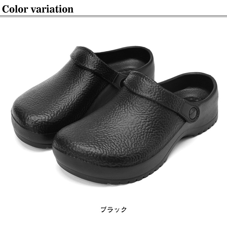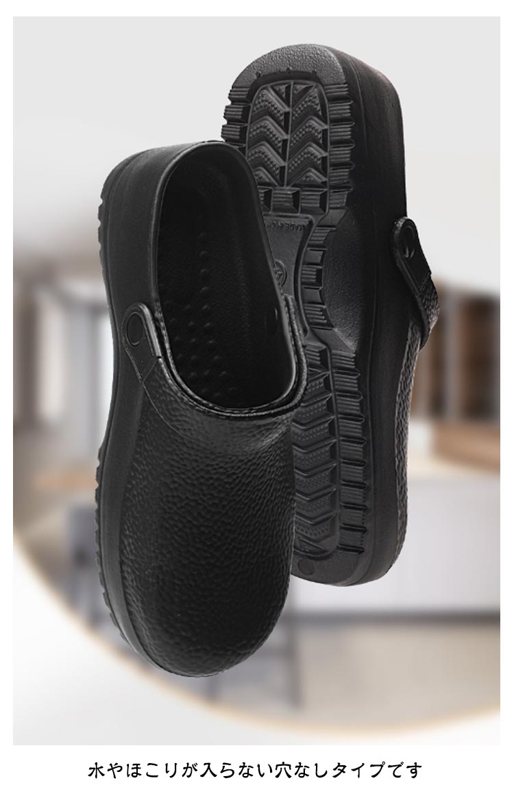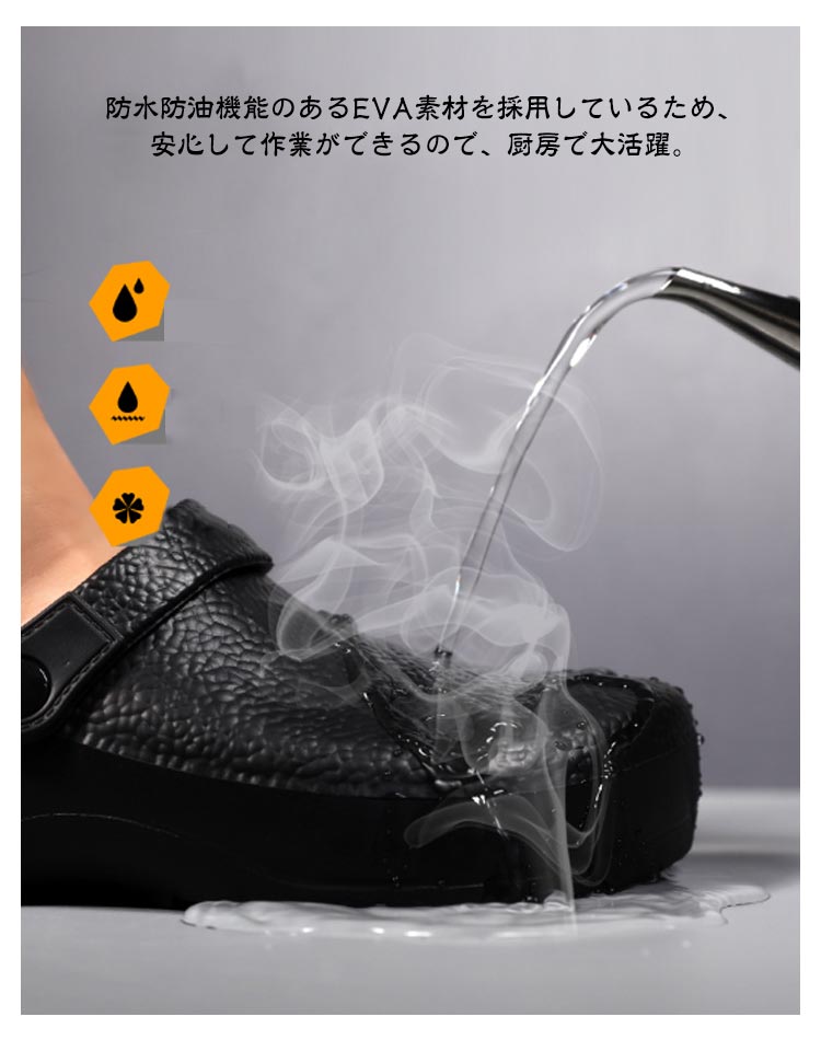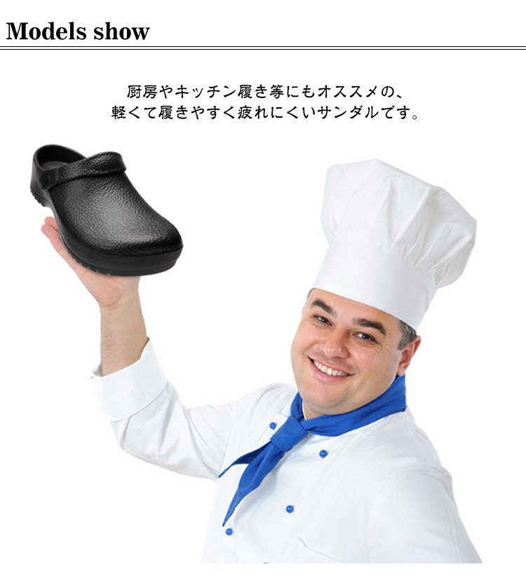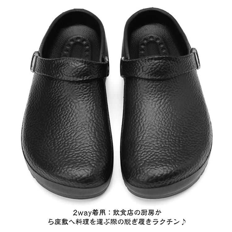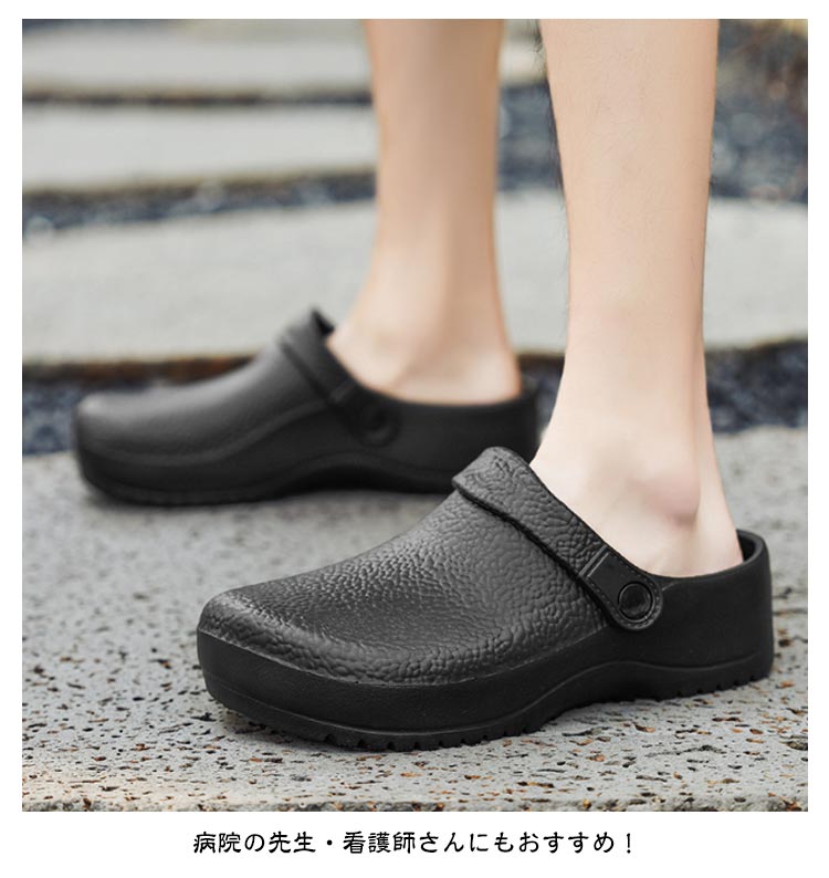 | 【厨房シューズ】【24-27.5cm】【防滑?軽量】2WAY 厨房やキッチン履き等にもオススメの、軽くて履きやすく疲れにくいサンダルです。 水やほこりが入らない穴なしタイプです 防水防油機能のあるEVA素材を採用しているため、安心して作業ができるので、厨房で大活躍。 2way着用:飲食店の厨房から座敷へ料理を運ぶ際の脱ぎ履きラクチン? 病院の先生?看護師さんにもおすすめ! 軽量性、耐久性に優れている。滑りにくいラバー底が付いている。 | |