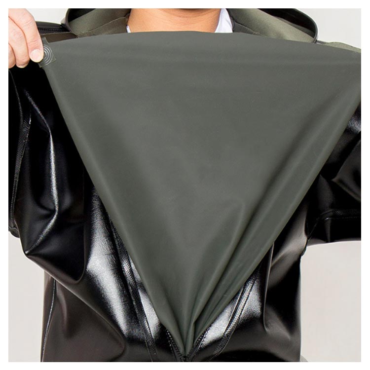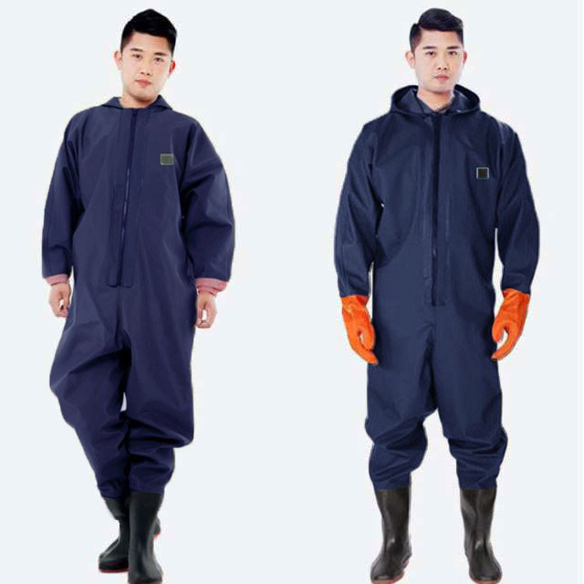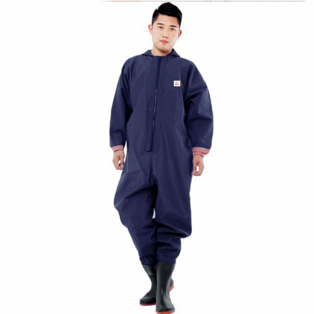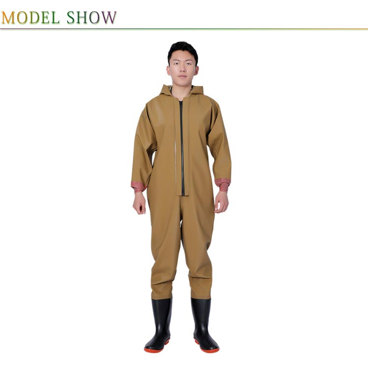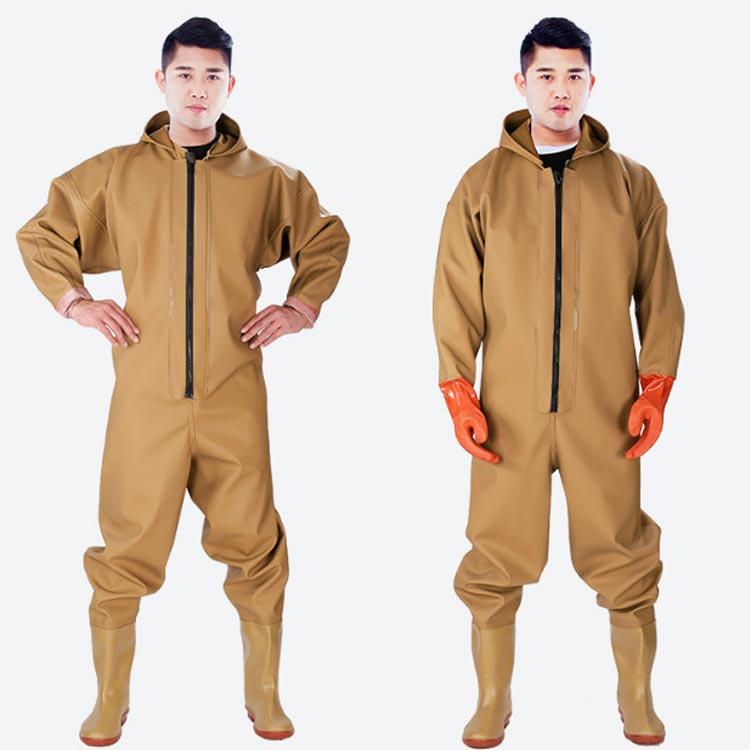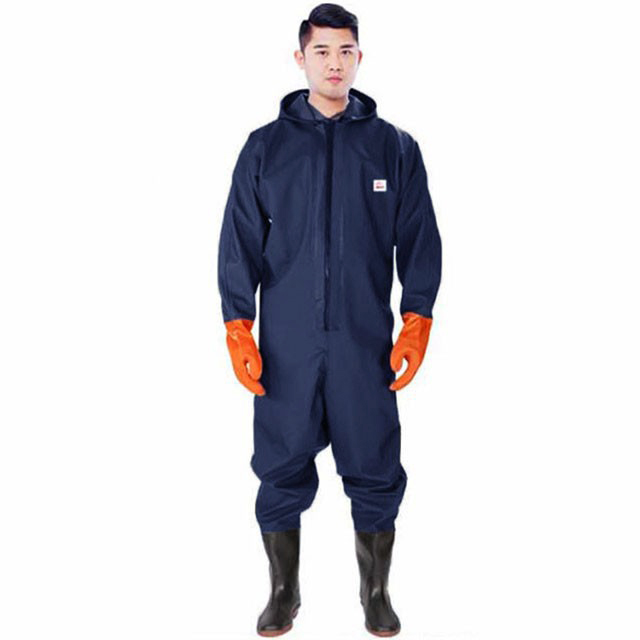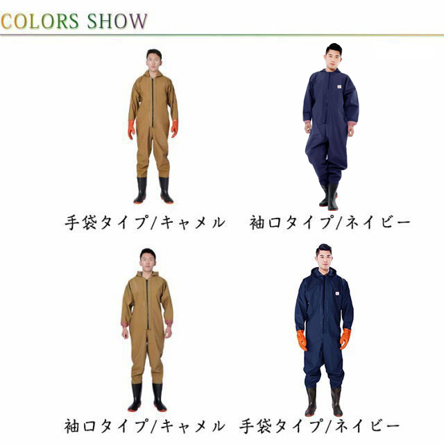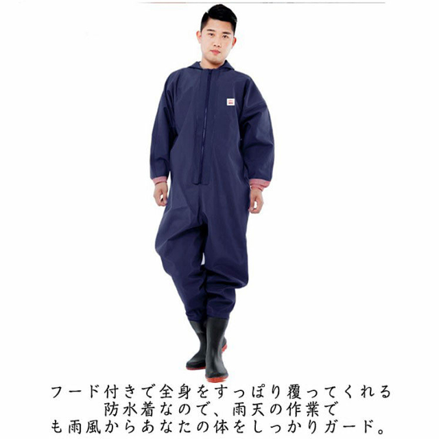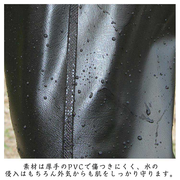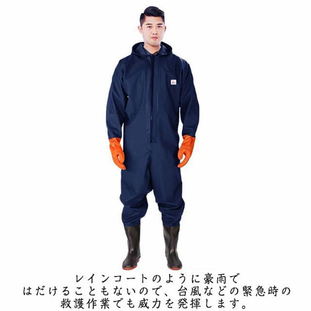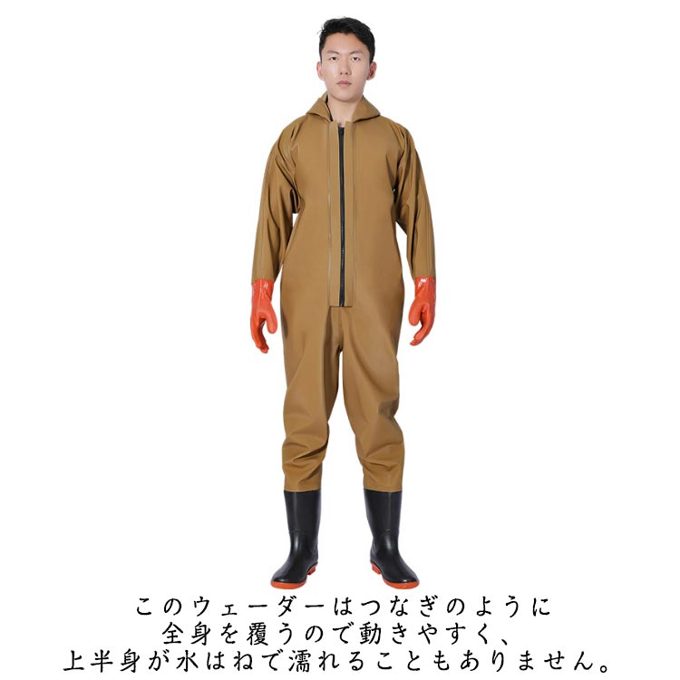 ・首元まで防水してくれるウェーディング用スーツです。・ほぼ全身を水の浸入から守ってくれますよ。・このウェーダーはつなぎのように全身を覆うので動きやすく、上半身が水はねで濡れることもありません。・フード付きで全身をすっぽり覆ってくれる防水着なので、雨天の作業でも雨風からあなたの体をしっかりガード。・レインコートのように豪雨ではだけることもないので、台風などの緊急時の救護作業でも威力を発揮します。・素材は厚手のPVCで傷つきにくく、水の侵入はもちろん外気からも肌をしっかり守ります。・胸ファスナーも水の侵入を防ぐ仕様で、さらにその下にも防水布を装備。・靴底も滑り止めの着いた弾力素材なので履き心地もGood。・全体を立体成型しているので動きやすさもバッチリです。・漁業や農業、工事現場など様々なシーンで活躍してくれる防水着です。